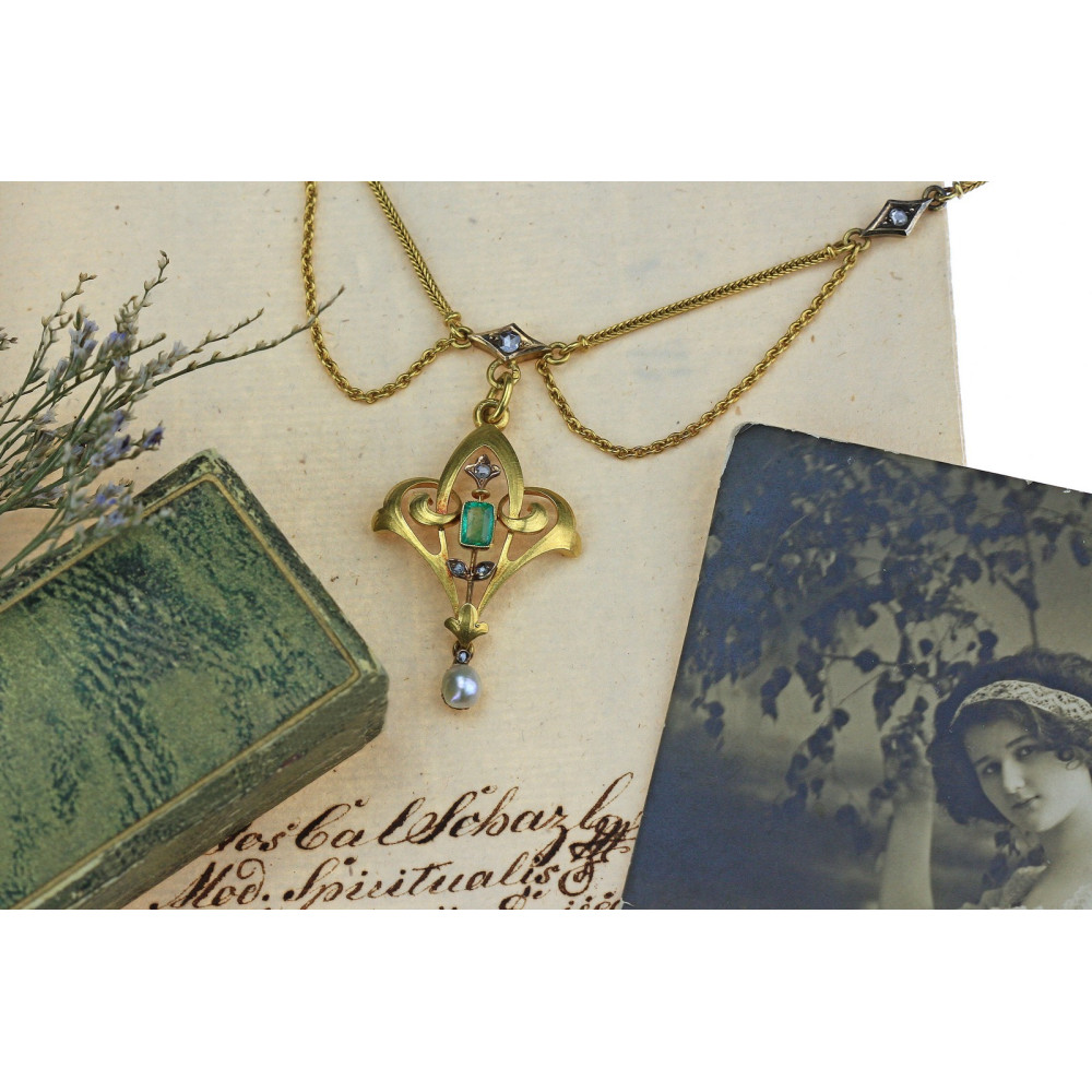 Unikátní secesní náhrdelník původem z Čech z počátku 20. století. Na šperk bylo použito žluté 14karátové zlato spolu s sedmi diamanty routového brusu, perlou a smaragdem o váze 0,30 ct (pravděpodobně původem z Kolumbie). Všechny drahé kameny jsou přírodního původu. Závěs náhrdelníku má již plně secesní kouřové křivky a jeho povrch je navíc lehce matován. Jedná se o vynikající klenotnickou práci z počátku 20. století. Značeno na několika místech rakousko-uherským puncem "liška", písmenem "C" označující pražský Puncovní úřad a mistrovskou značkou "VS".