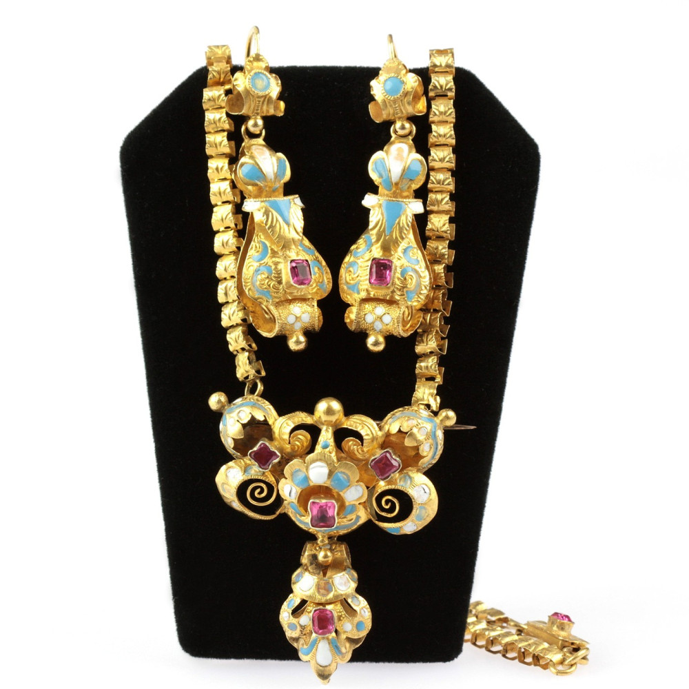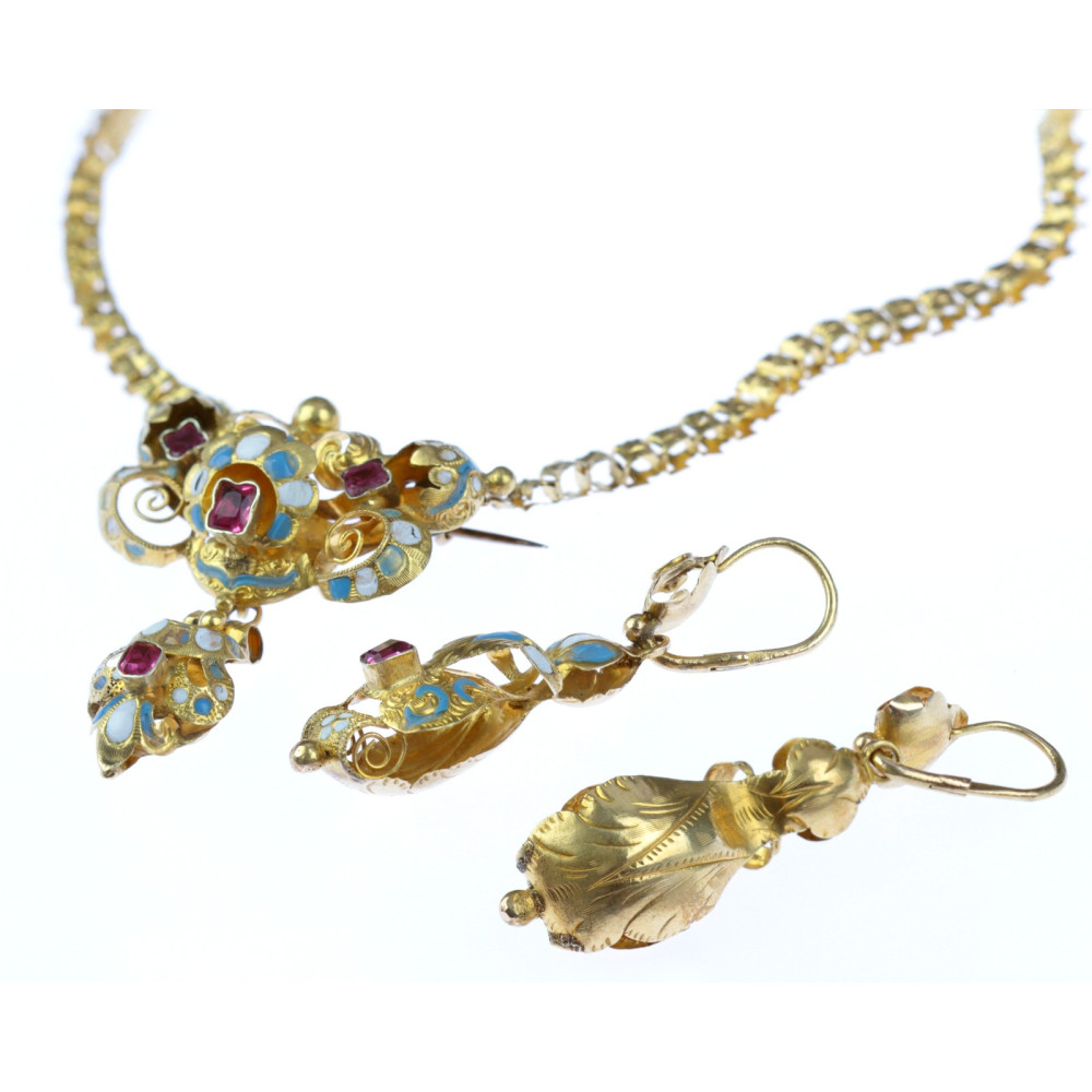 Náhrdelník zhotovený ze žlutého 18karátového zlata. Při odepnutí řetízku lze středovou část nosit jako brož, a to buď s ověskem, nebo bez. Brož zdobí ruční malba bílými a světle modrými smalty. Drahé kameny zde zastupují broušené skleněné kamínky sytě růžové barvy. Šperk nese mírné známky nošení, barevné smalty místy chybí. Zapínání řetízku je zacvakávací, pevně drží.