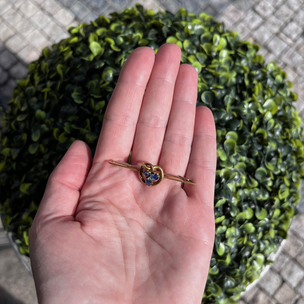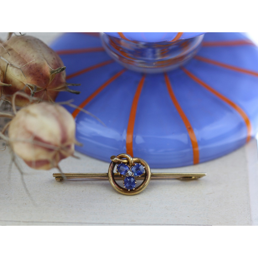 Pozdně secesní podélná brožka ze žlutého 14karátového zlata s přírodními safírky krásné světle modré barvy usazenými do tvaru trojlístku, které ve svém středu "svírají" přírodní diamantovou routu.