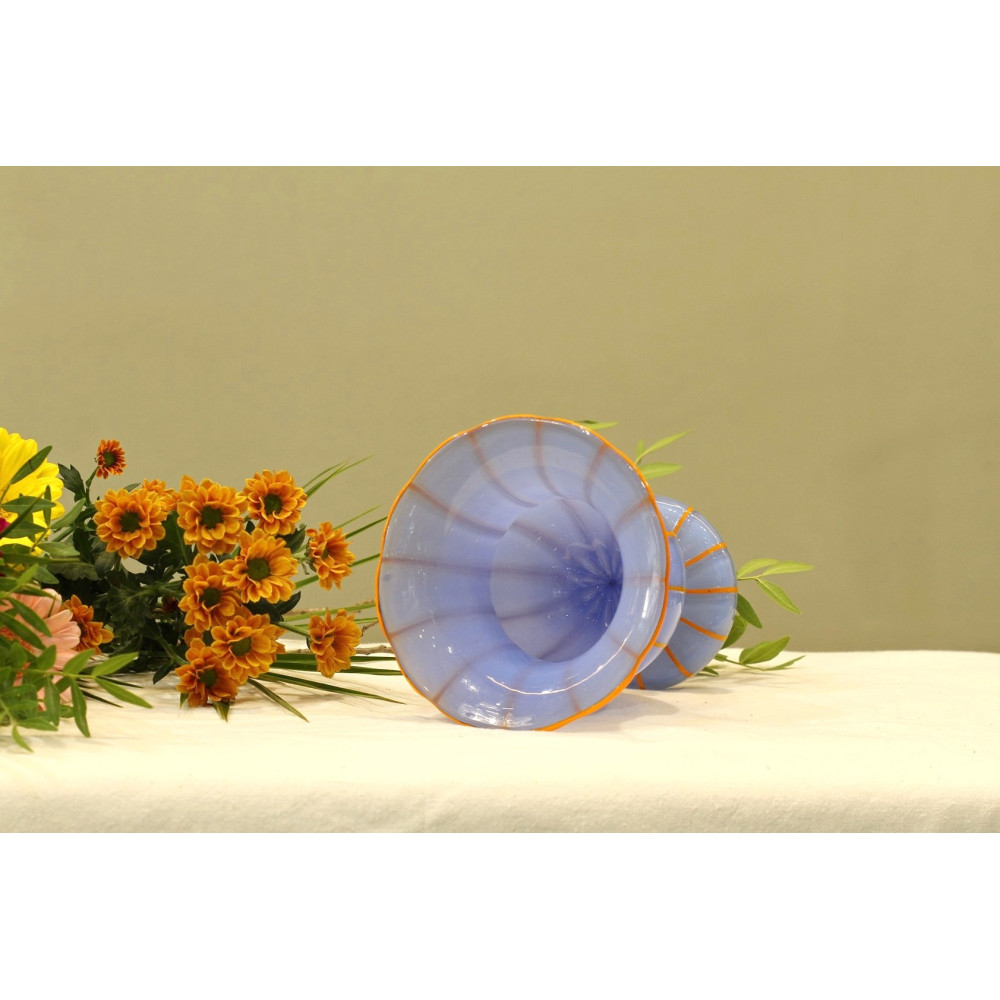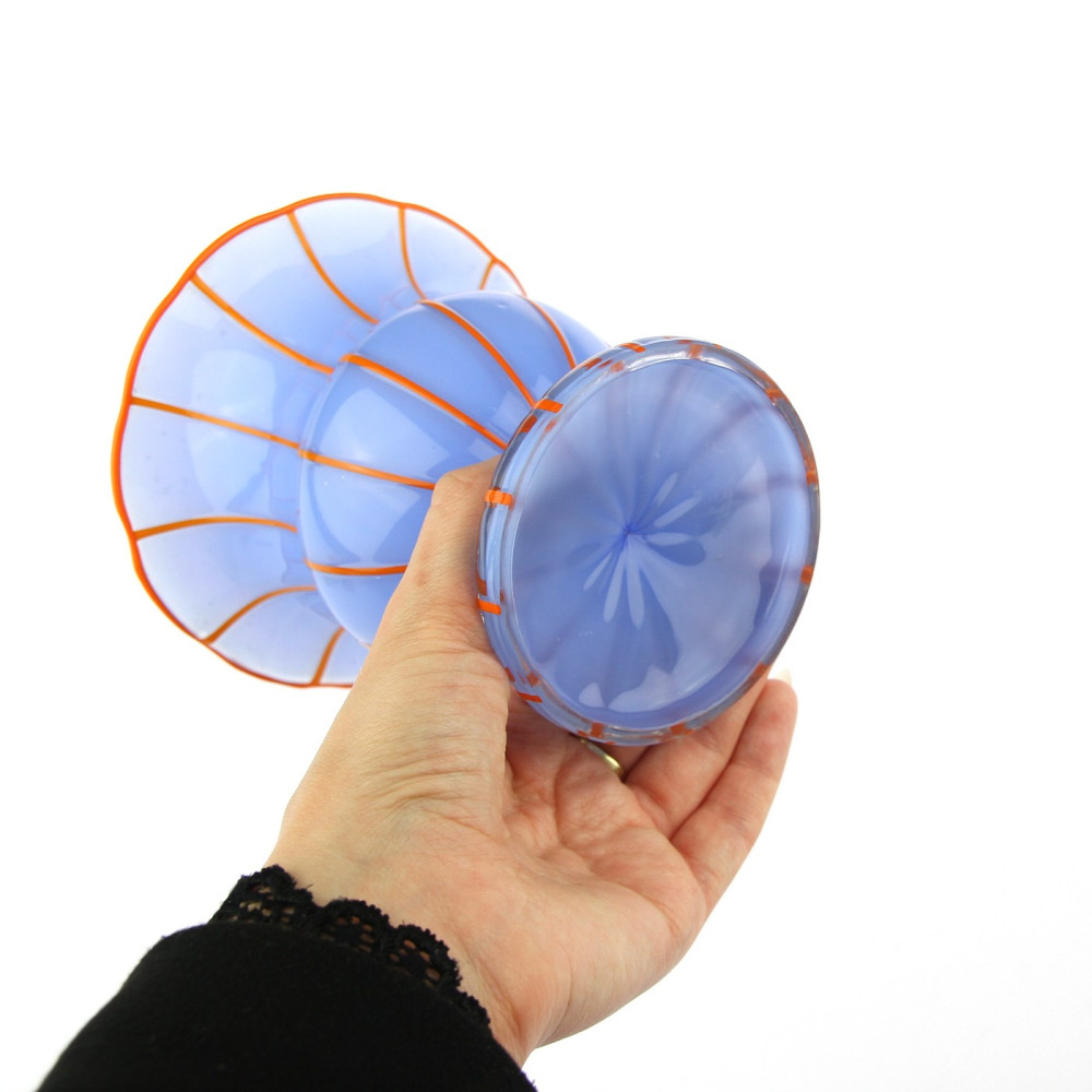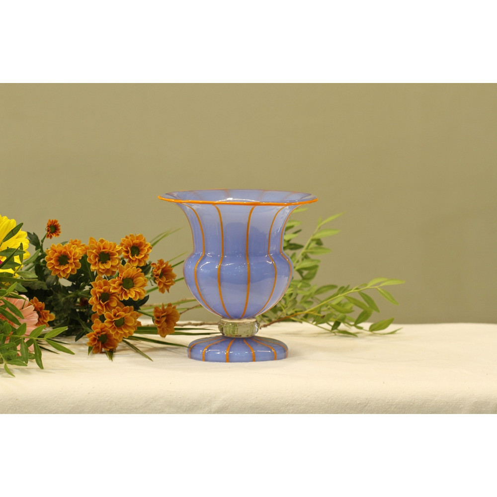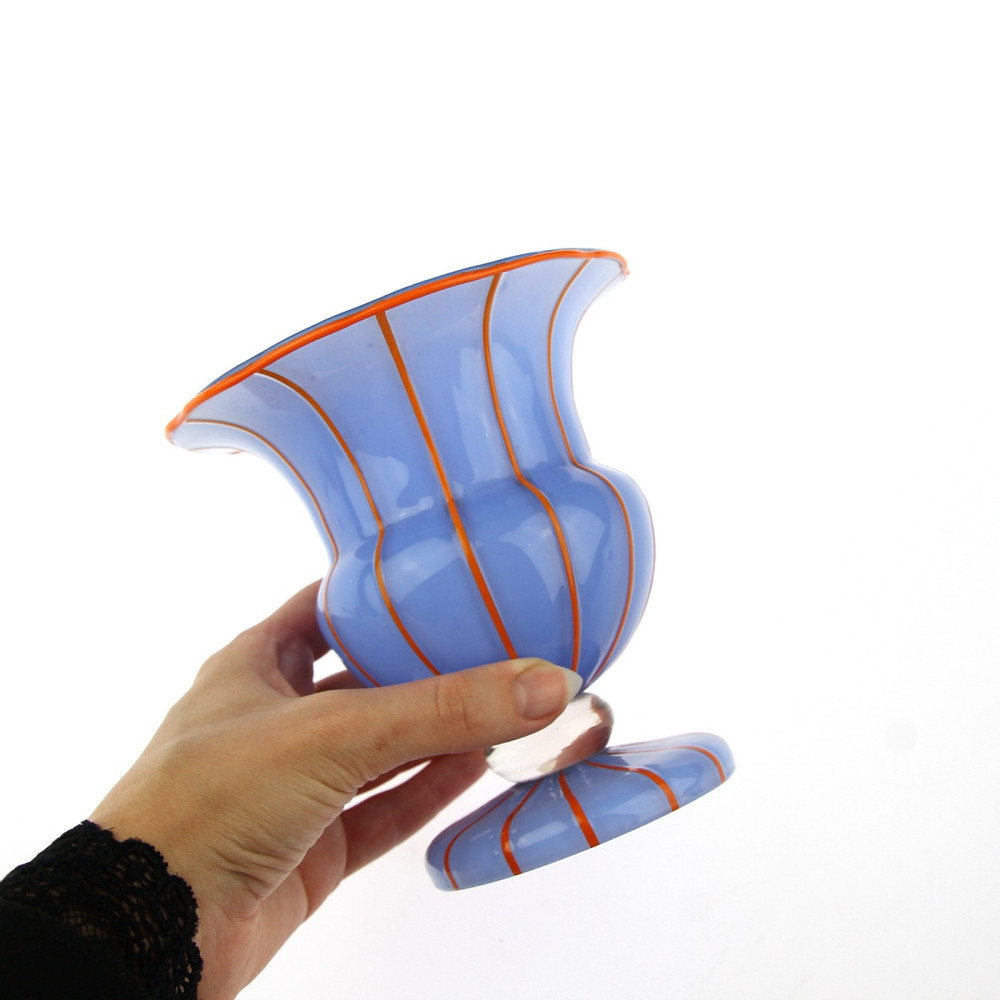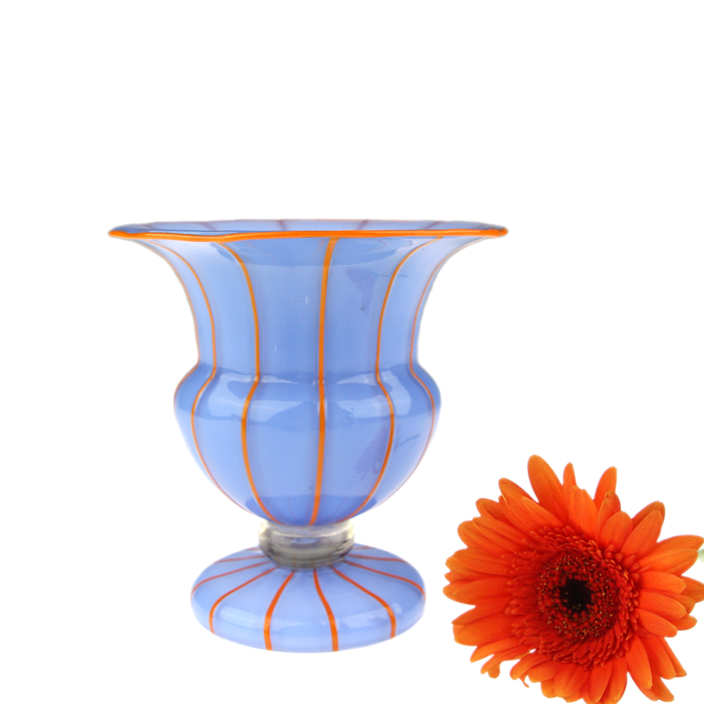 Váza na nožce vyrobená roku 1914 v šumavské sklárně Loetz dle návrhu Michaela Powolného (1871-1954). Jedná se o bezbarvé sklo podjímané světle modrým opálovým sklem, svislé linky a lem hrdla jsou z oranžové skloviny.