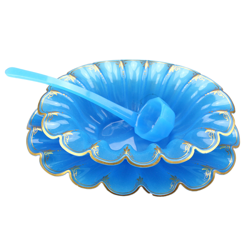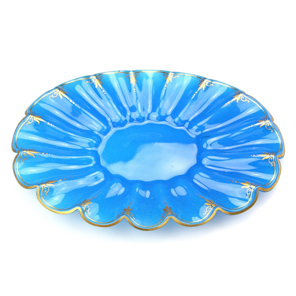Hluboká mísa, podnos a naběračka ze zářivě modrého skla, které bylo nazýváno v novosvětské sklárně jako "Lapis lazuli", reprezentuje přepychové servírovací sklo z období druhého rokoka. Okraje jsou malované zlatou linkou.
