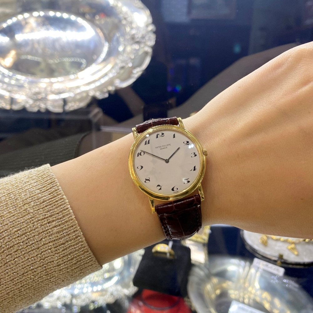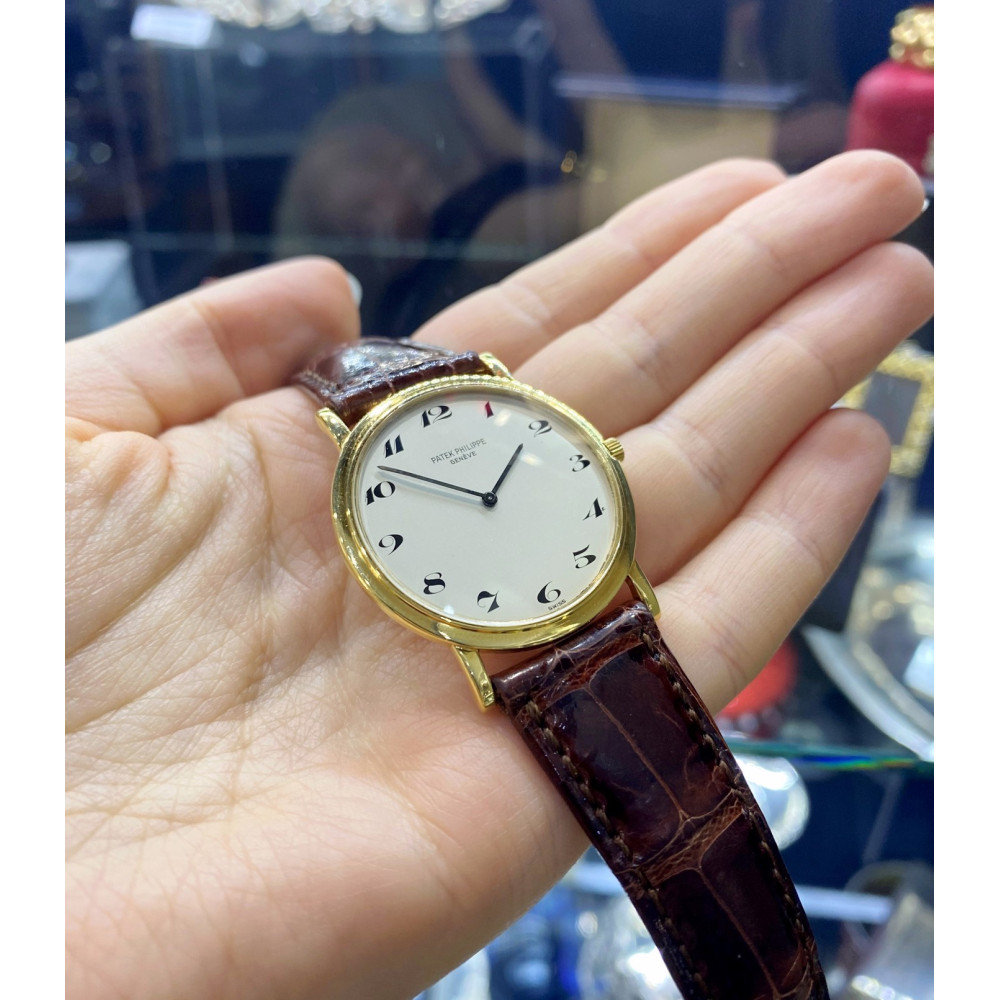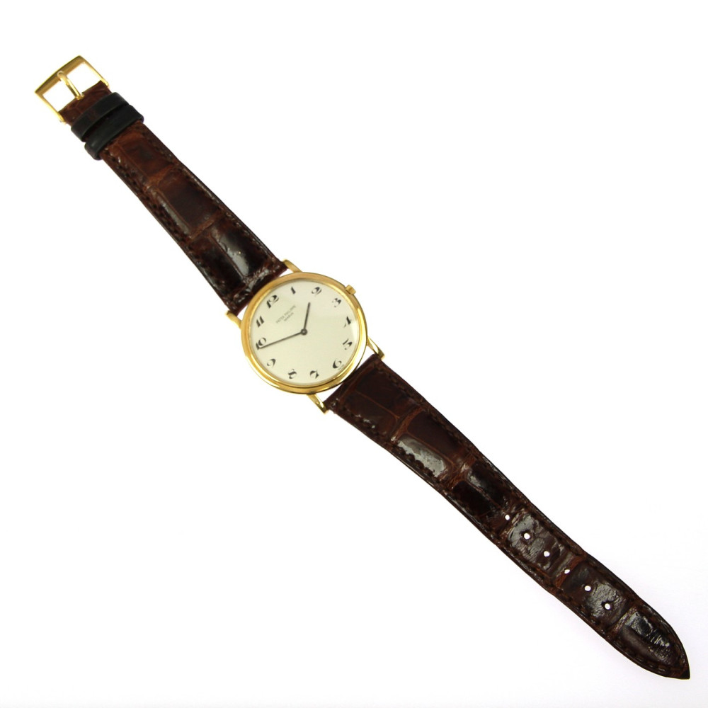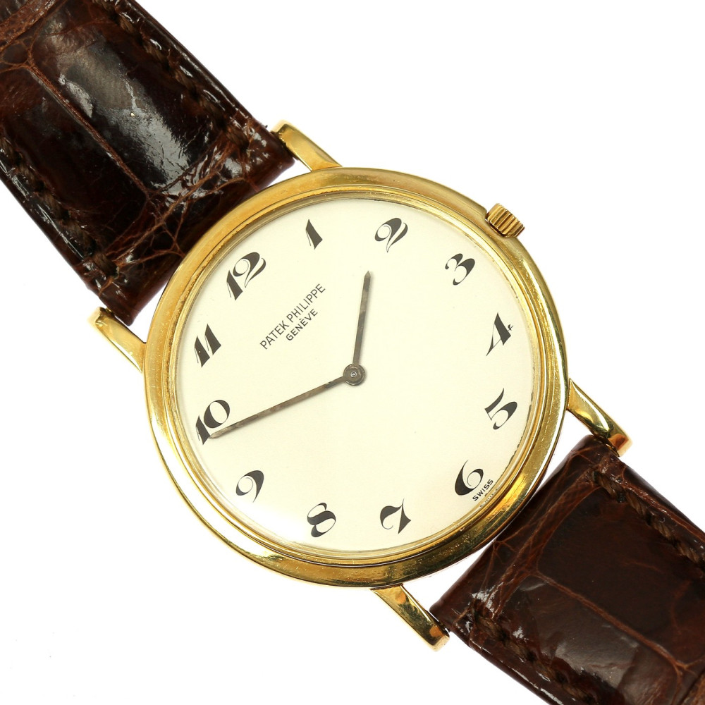 Náramkové hodinky švýcarské značky Patek Philippe & Co. model Calatrava vyrobené ze žlutého 18karátového zlata. Velikost pouzdra je 32 mm. Referenční číslo: 3498 (Ultra-Thin). Tento "ultratenký" model se vyráběl mezi lety 1960-1970. Zajímavostí je ciferník s arabskými číslicemi, většina těchto modelů má číslice římské. Raritní elegantní hodinky s nadčasovým designem. Včetně originálního koženého řemínku Patek Philippe.