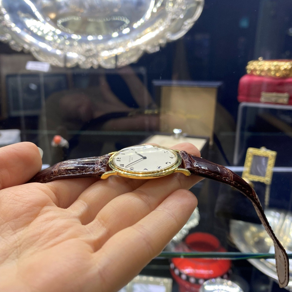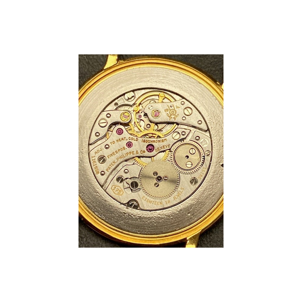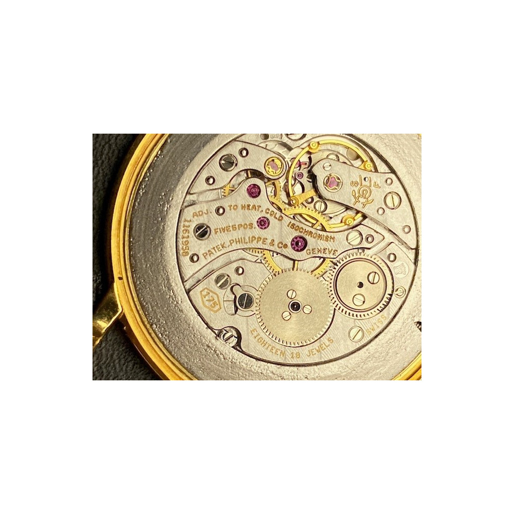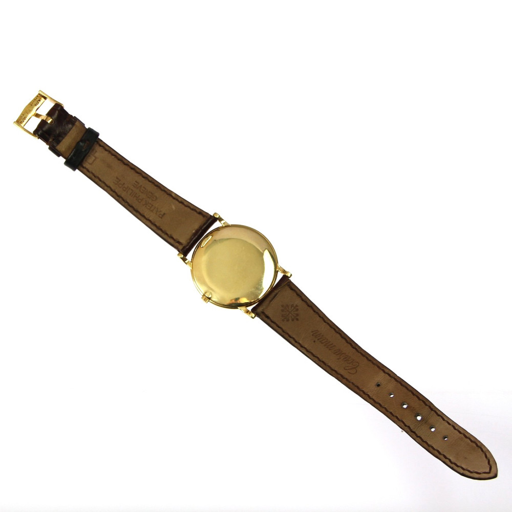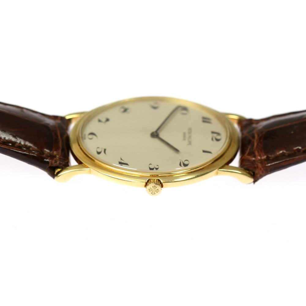 Náramkové hodinky švýcarské značky Patek Philippe & Co. model Calatrava vyrobené ze žlutého 18karátového zlata. Velikost pouzdra je 32 mm. Referenční číslo: 3498 (Ultra-Thin). Tento "ultratenký" model se vyráběl mezi lety 1960-1970. Zajímavostí je ciferník s arabskými číslicemi, většina těchto modelů má číslice římské. Raritní elegantní hodinky s nadčasovým designem. Včetně originálního koženého řemínku Patek Philippe.