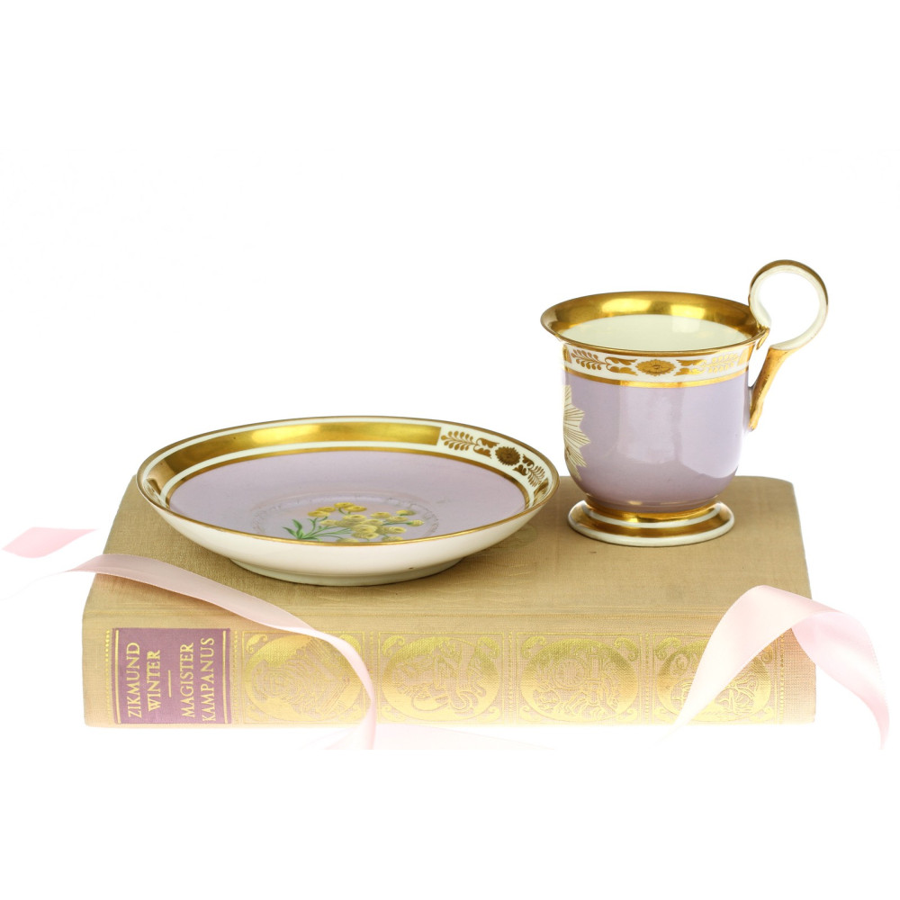 Ručně malovaný fialovo-bílý porcelánový šálek s podšálkem byl vyrobený mezi lety 1828 - 1838 Císařskou porcelánovou manufakturou ve Vídni. Přední stranu šálku zdobí hvězda s textem "SND nie unsere FREUNDSCHAFT", tedy částečně slovní hříčkou s významem "Naše přátelství nikdy neskončí". Tento význam podporuje i slaměnka jako symbol trvalosti a nesmrtelnosti vyvedená na podšálku. Zespod obou kusů nalezneme vtlačenou značku vídeňské porcelánky.