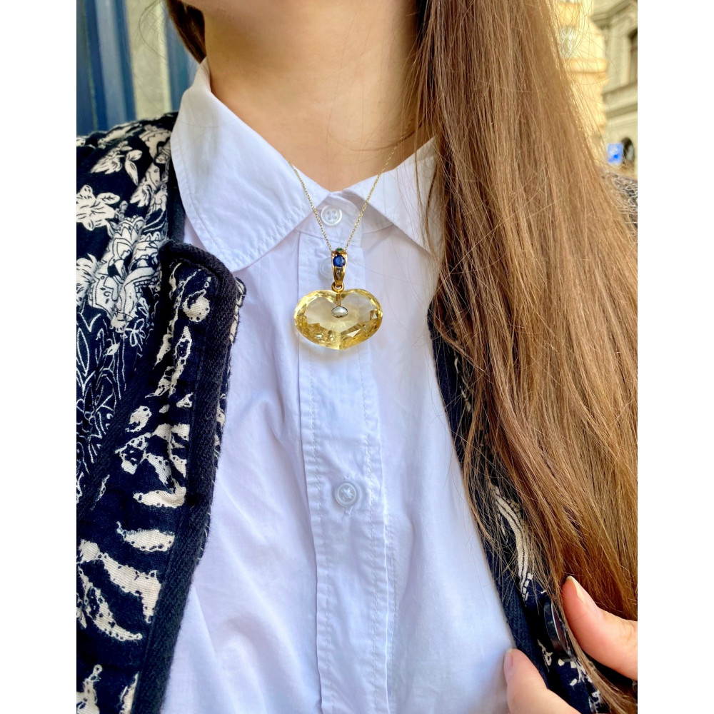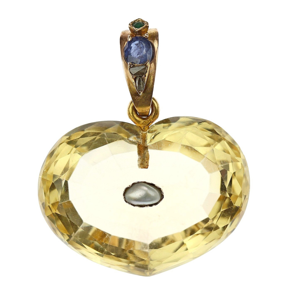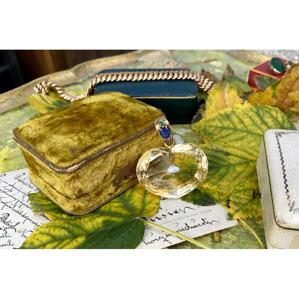 Impozantní přírodní citrín o váze 130 ct vybroušený do tvaru srdce má ve zlatém očku osazeny přírodní kameny - safír o váze 1,06 ct, smaragd o váze 0,11 ct a 2 diamantové routy. Zajímavostí je uprostřed přívěsku osazená perlička. Materiálem je 14karátové zlato, které je označeno mistrovskou značkou "JK"? a platným puncem "klas" pro staré zboží.