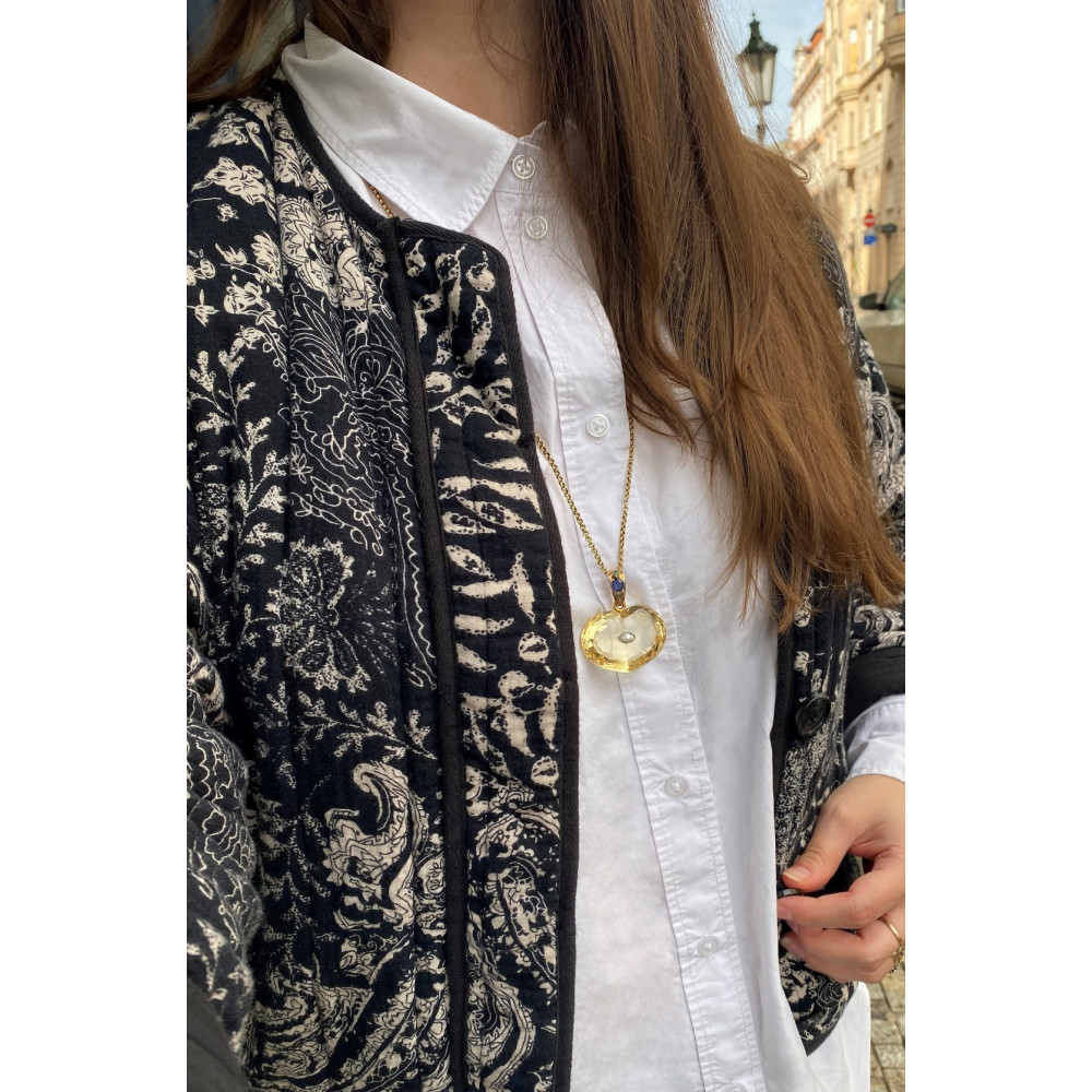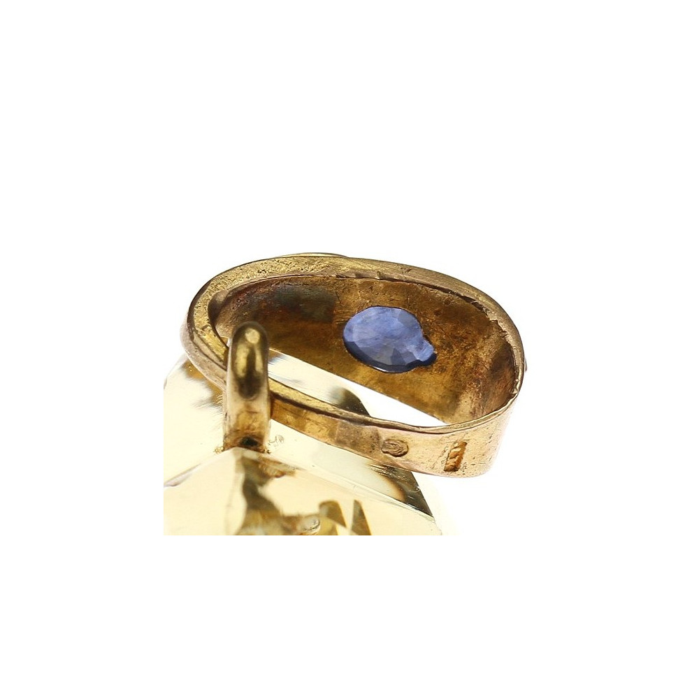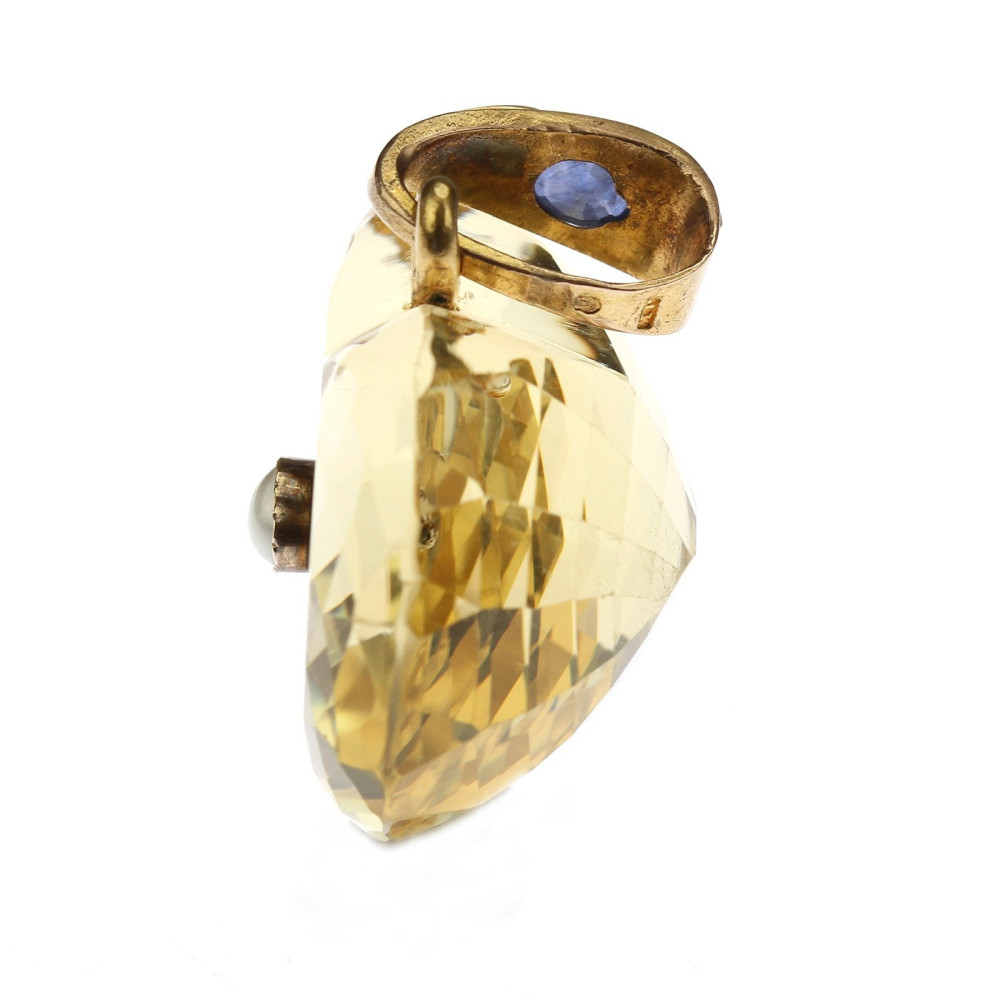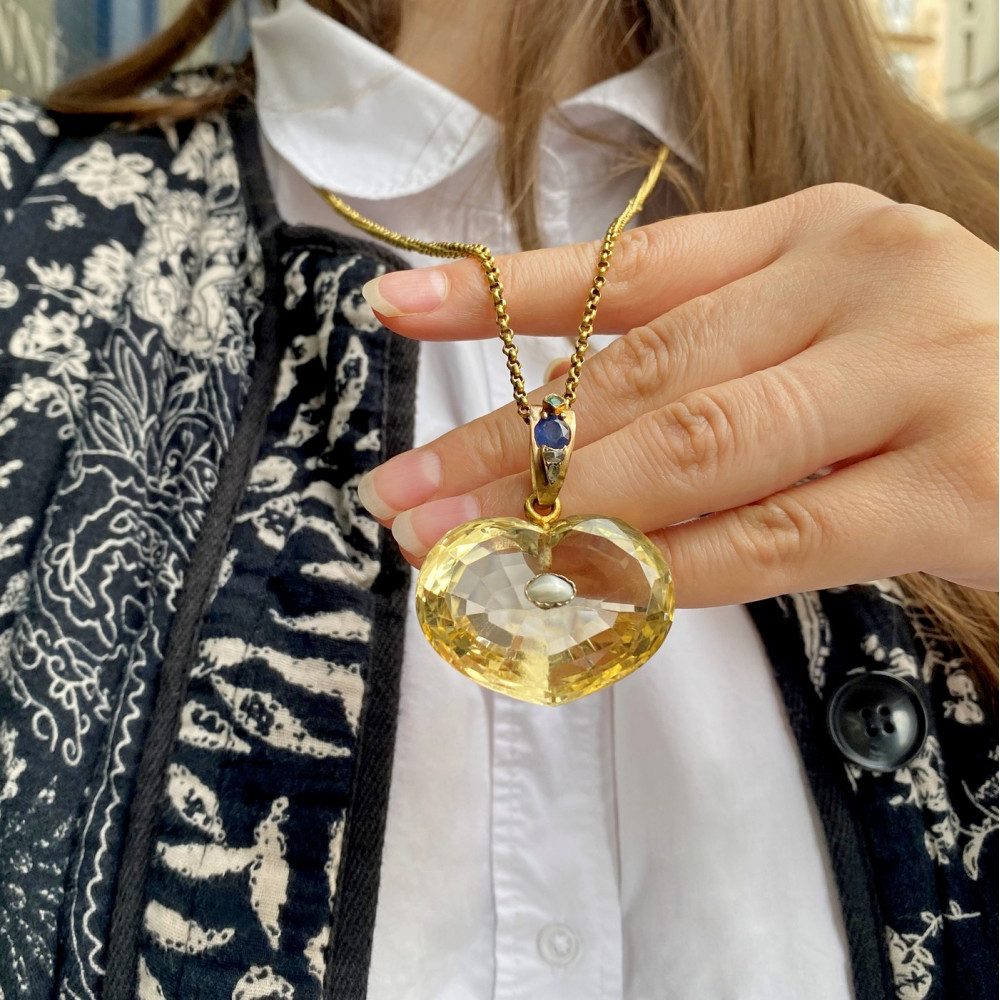 Impozantní přírodní citrín o váze 130 ct vybroušený do tvaru srdce má ve zlatém očku osazeny přírodní kameny - safír o váze 1,06 ct, smaragd o váze 0,11 ct a 2 diamantové routy. Zajímavostí je uprostřed přívěsku osazená perlička. Materiálem je 14karátové zlato, které je označeno mistrovskou značkou "JK"? a platným puncem "klas" pro staré zboží.