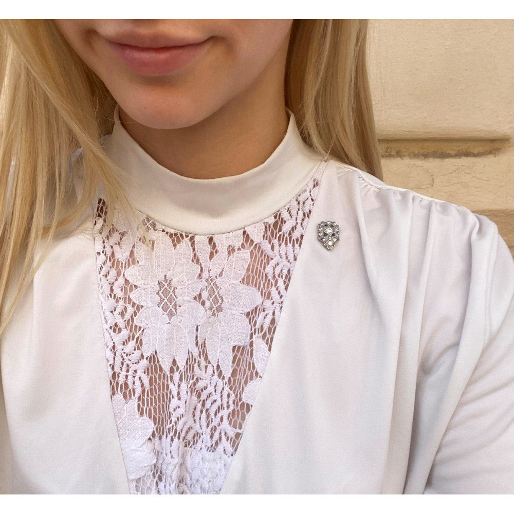 Art deco jehlice zhotovená z platiny (ryzost Pt 950/1000) ve 20. - 30. letech 20. století. Klenotník do jehlice zasadil přírodní diamanty briliantového brusu o celkové váze 0,82 ct a čtyři syntetické safíry. Označena byla v Československu puncem pro zboží původem ze zahraničí.