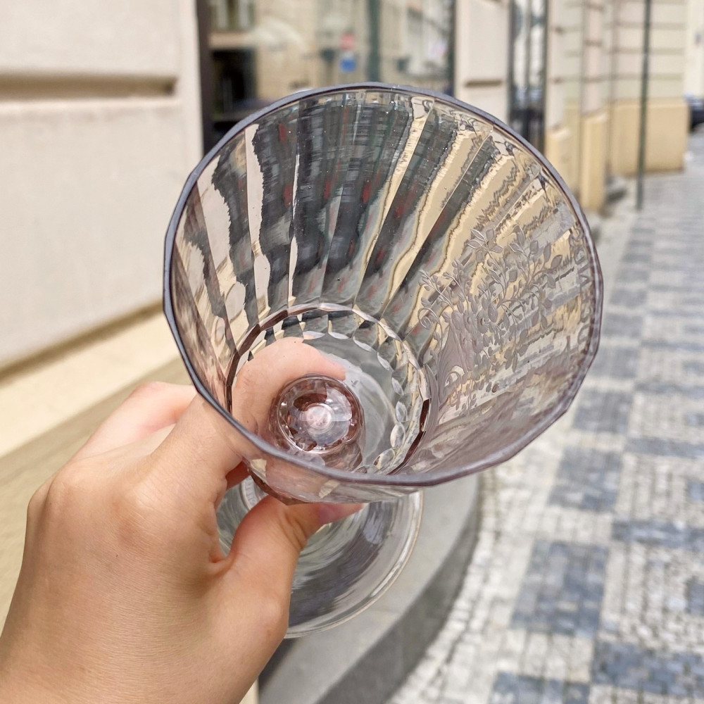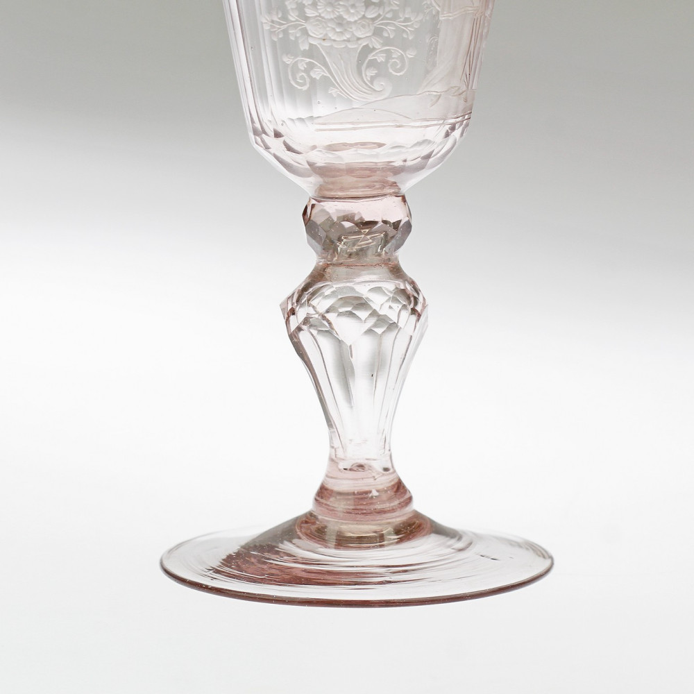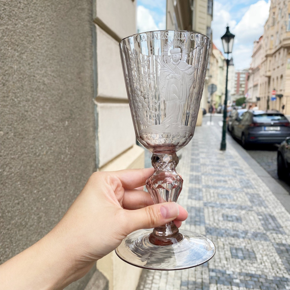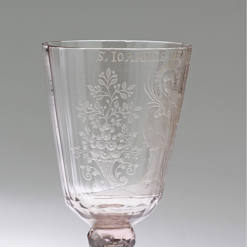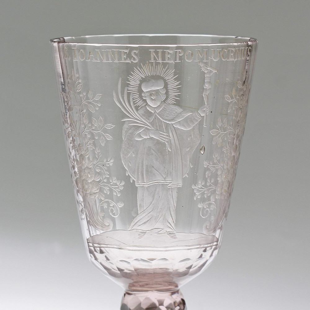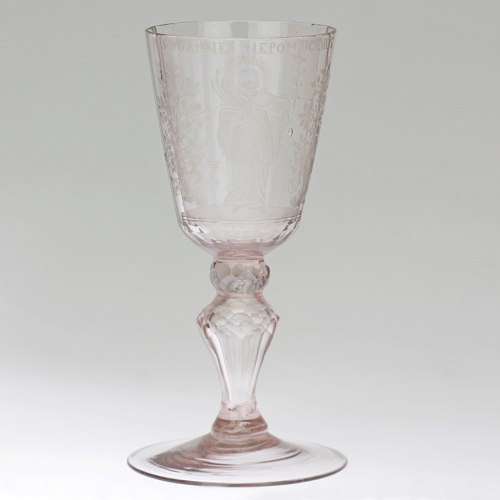 Barokní fasetovaný pohár vyrobený v polovině 18. století z čirého bezbarvého skla s manganovým (narůžovělým) nádechem. Jedná se o typ broušeného poháru s nálevkovitou kupou a balustrovou nohou, který nese figurální námět se sv. Janem Nepomuckým. Po stranách hlavního motivu jsou ornamentální prvky v podobě rohů hojnosti.