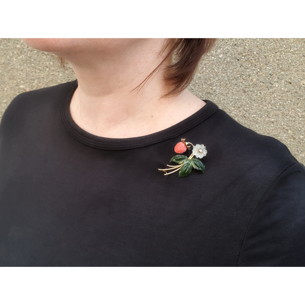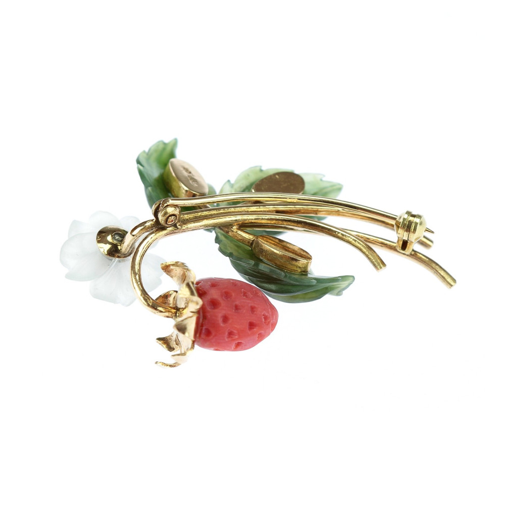 Precizně zpracovaná brož s motivem lesní jahůdky je vyrobená ze žlutého 14karátového zlata. Jahoda je vyřezaná z přírodního mořského korálu, lístky z jadeitu a květ z horského křišťálu, v jehož středu je zasazen přírodní diamant briliantového brusu o váze 0,03 ct (barva F-G, čistota VS).
