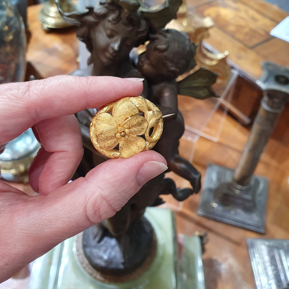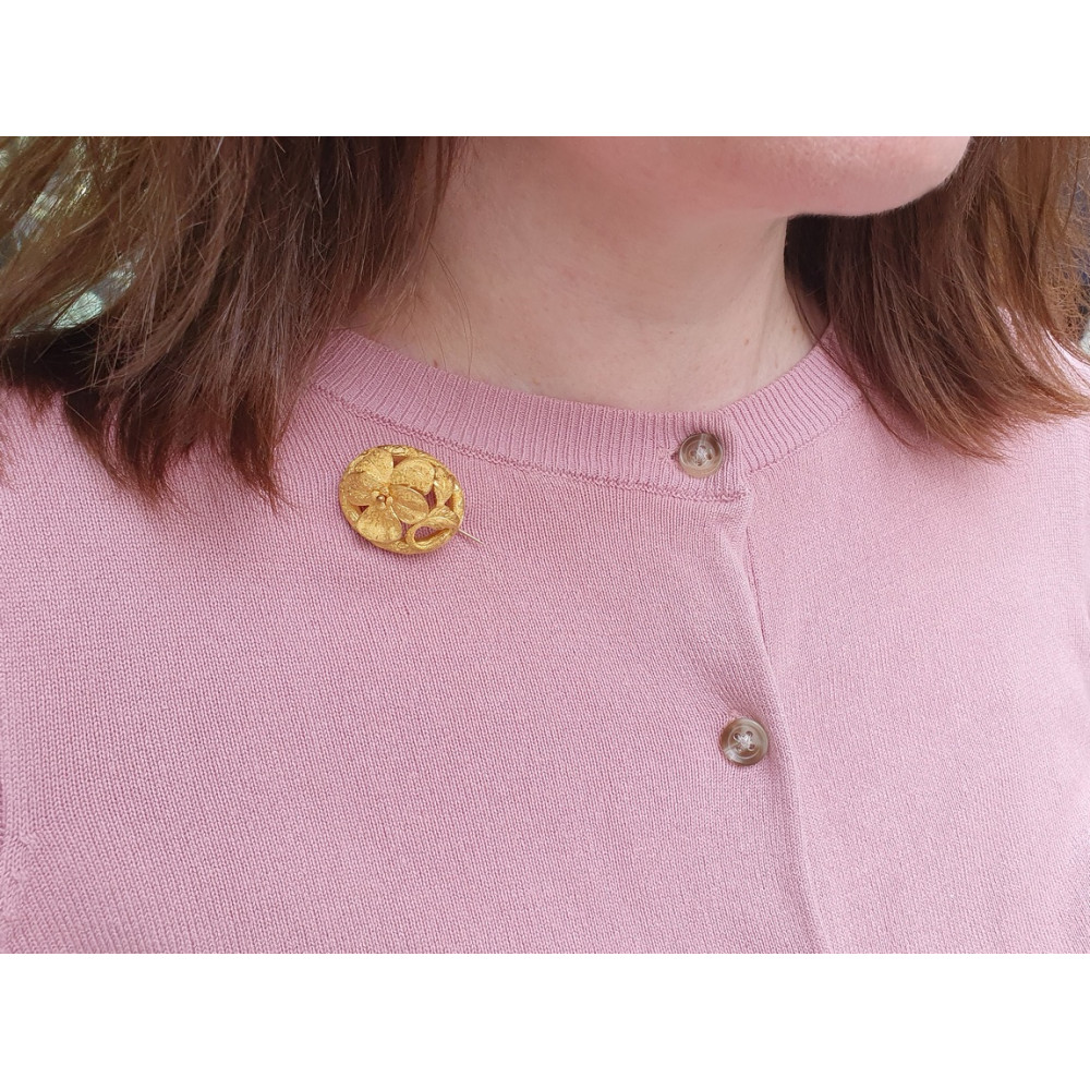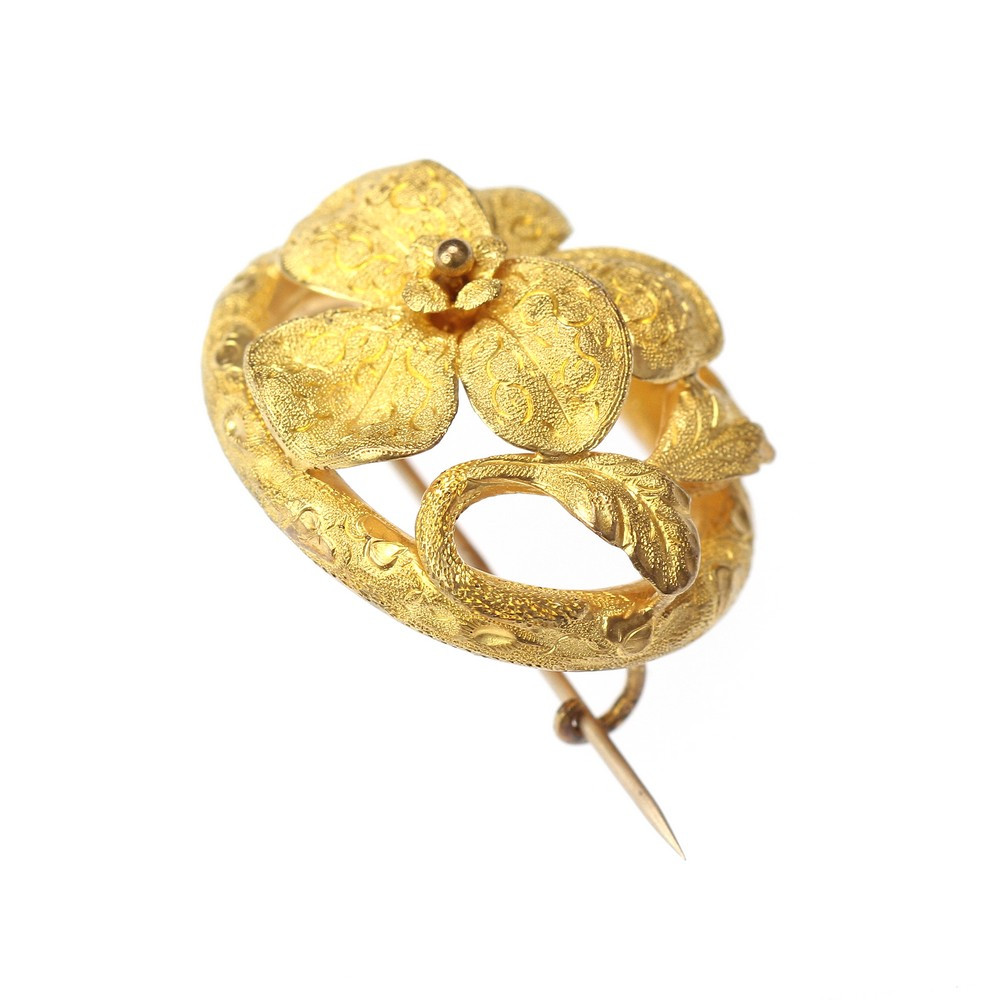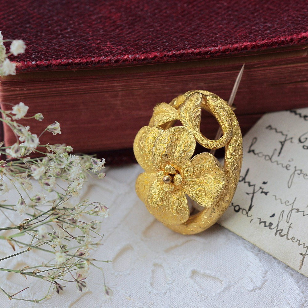 Vyklenutá brožka ze žlutého 14karátového zlata s motivem macešky je celoplošně matovaná s delikátním rytým vzorem. Oválná obruba z dutého zlata má po celém obvodu motiv lístečků.