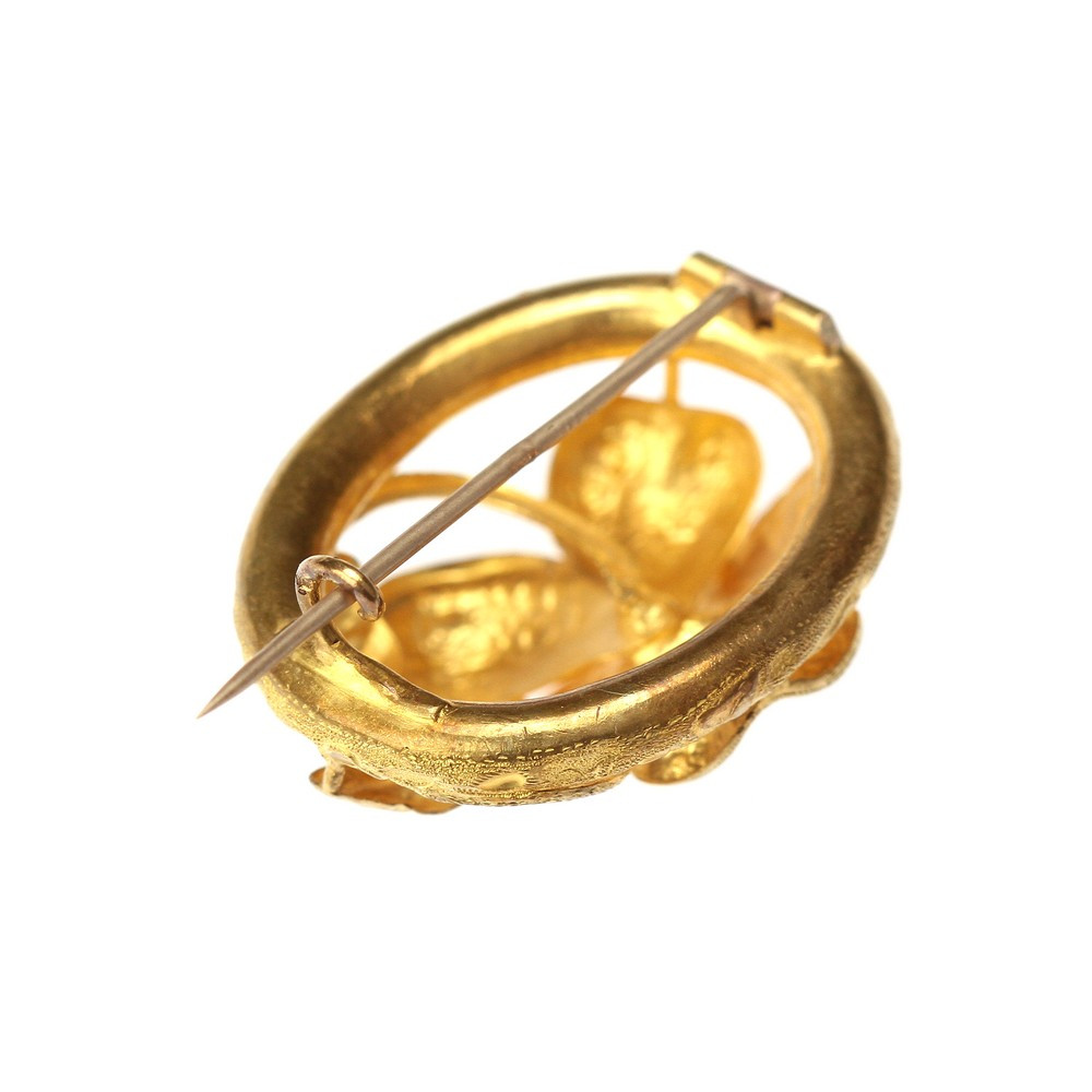Starožitná brož vyrobená v období pozdního biedermeieru, pravděpodobně ve 2. třetině 19. století, s prvky etruského šperku. Materiálem je 14karátové žluté zlato osazené přírodními turmalíny. Plastické lístečky zdobí technika matování. Jehlice je opatřena pojistkou, jde o novější náhradu původní "C" spony. Celý systém zapínání, jehlice a závěsné očko jsou...