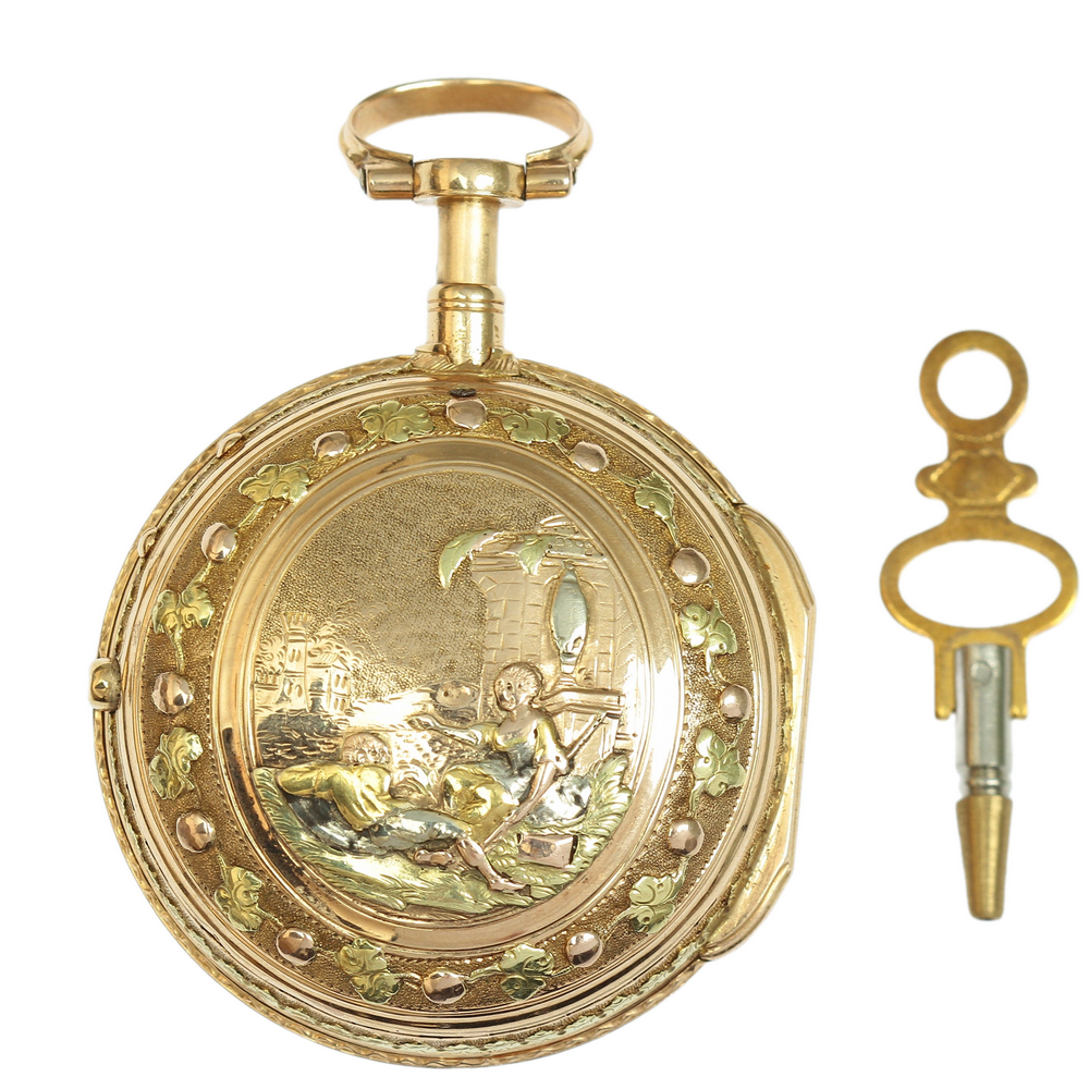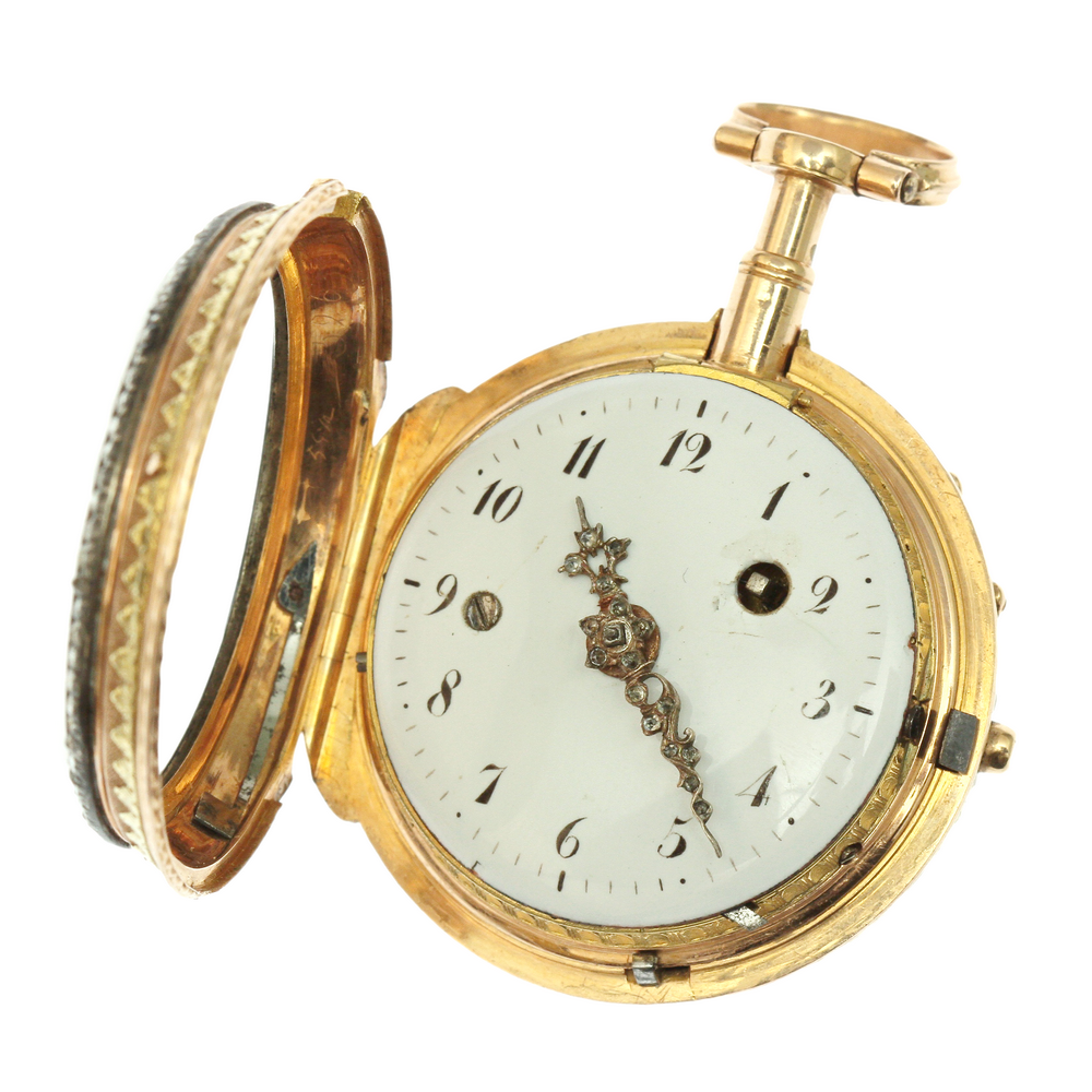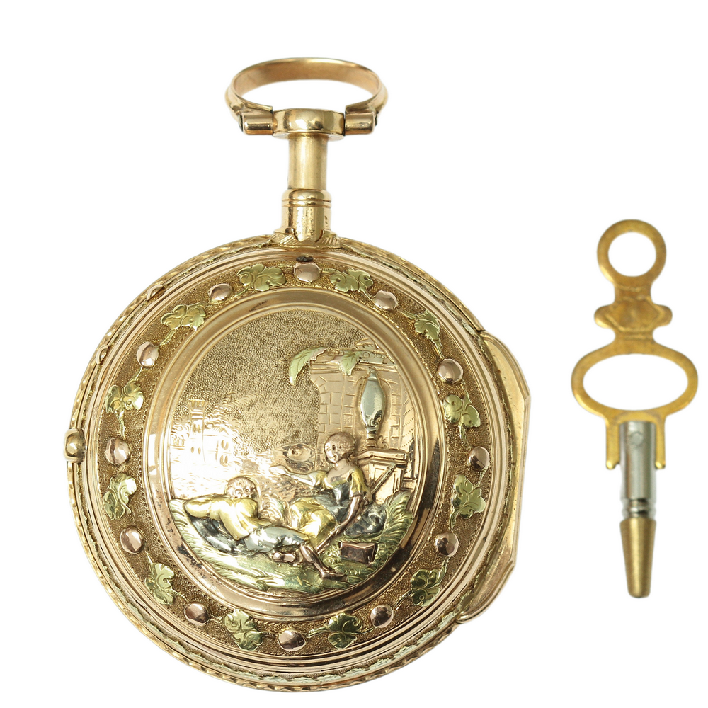 Dvouplášťové bicí kapesní hodinky, tzv. špindlovky, zhotovené z 18karátového zlata několika odstínů. Reliéfně vyvedená romantická scéna na zadním plášti hodinek je ze zlata o ryzosti 620/1000 (přibližně 14,5 karátové zlato). Vrchní prosklený plášť chránící ciferník rámují přírodní diamanty routového brusu zasazené ve stříbrném lůžku.