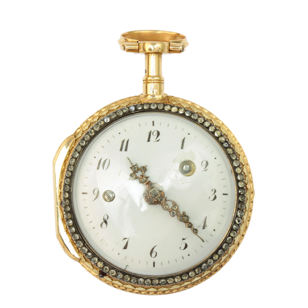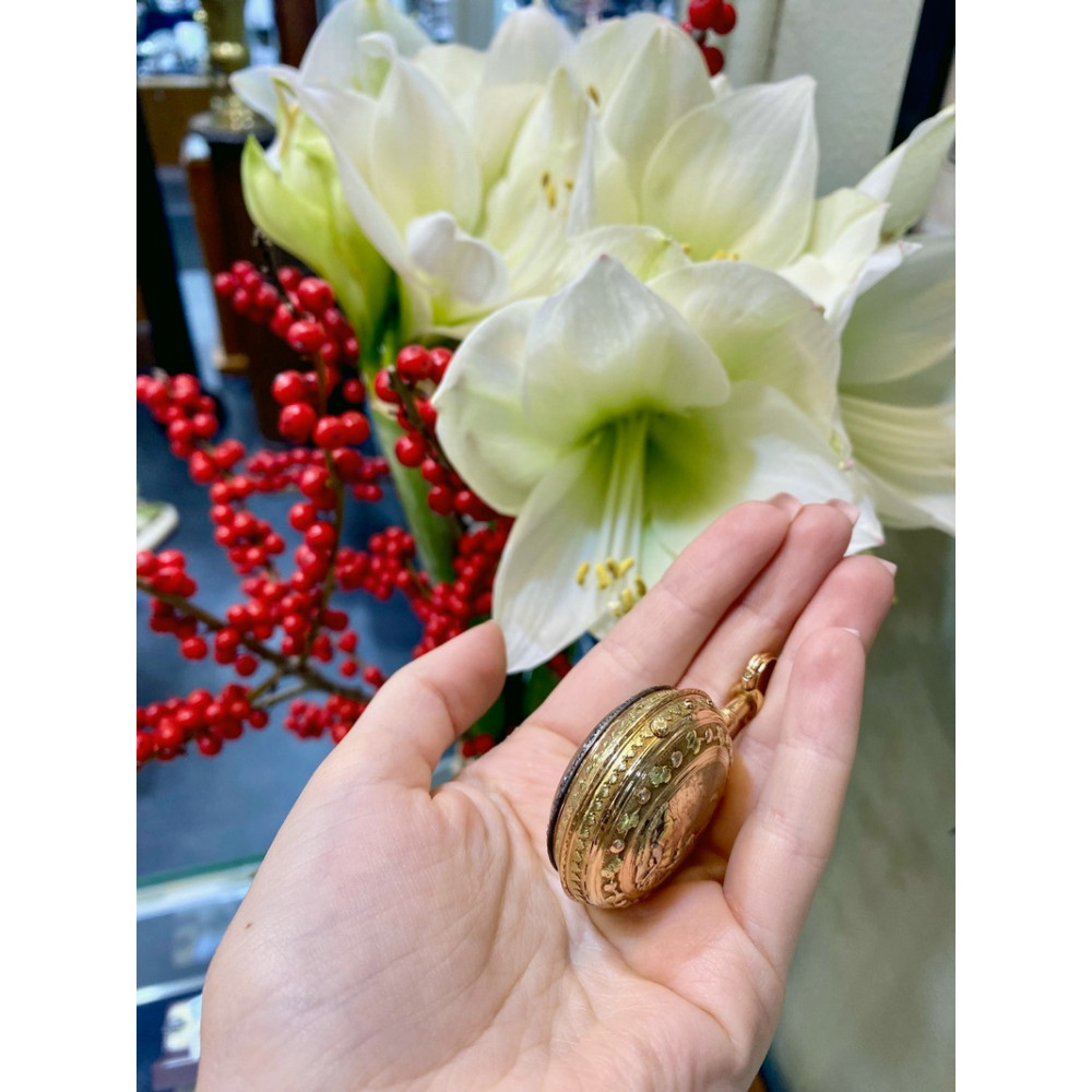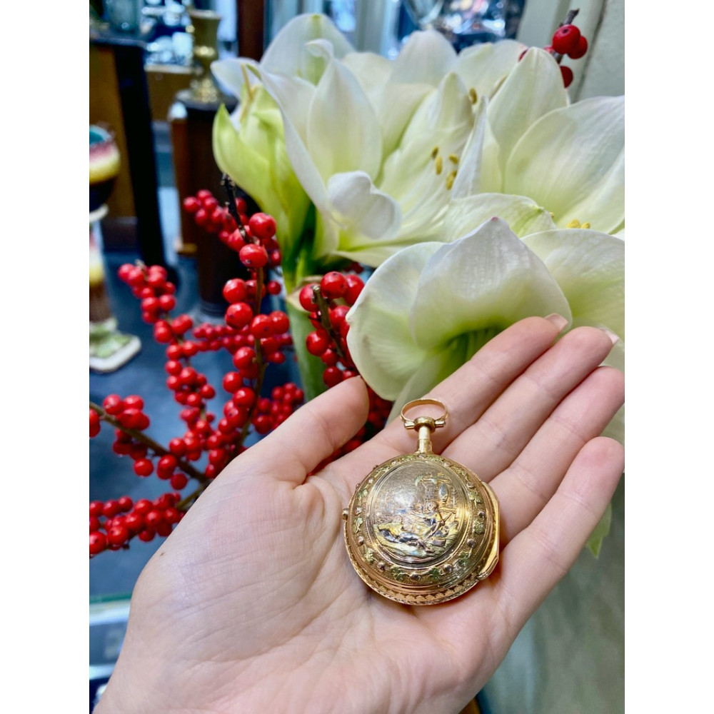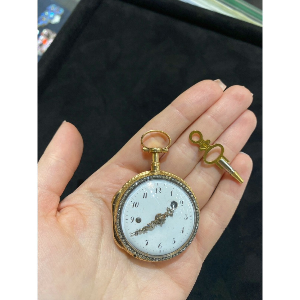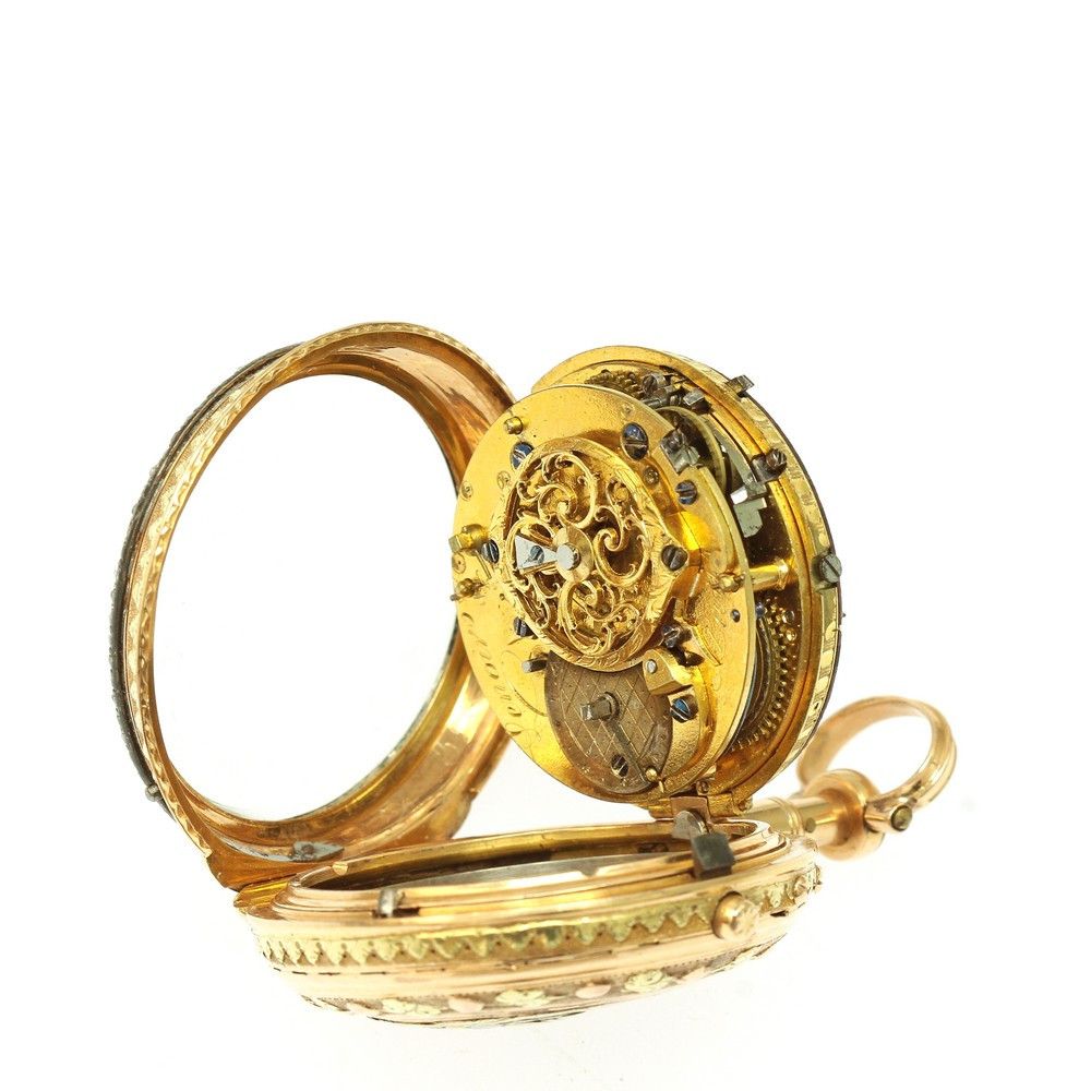 Hodinky tohoto typu se vyráběly zejména v 2. polovině 18. století. Značeno na strojku hodinářem "Lenoir" a místem vzniku "Paris". Funkční a ve výborném stavu, bez poškození. Přiložen klíček z obecného kovu pro manuální nátah. K hodinkám náleží osvědčení Puncovního úřadu dokládající ryzost zlata.