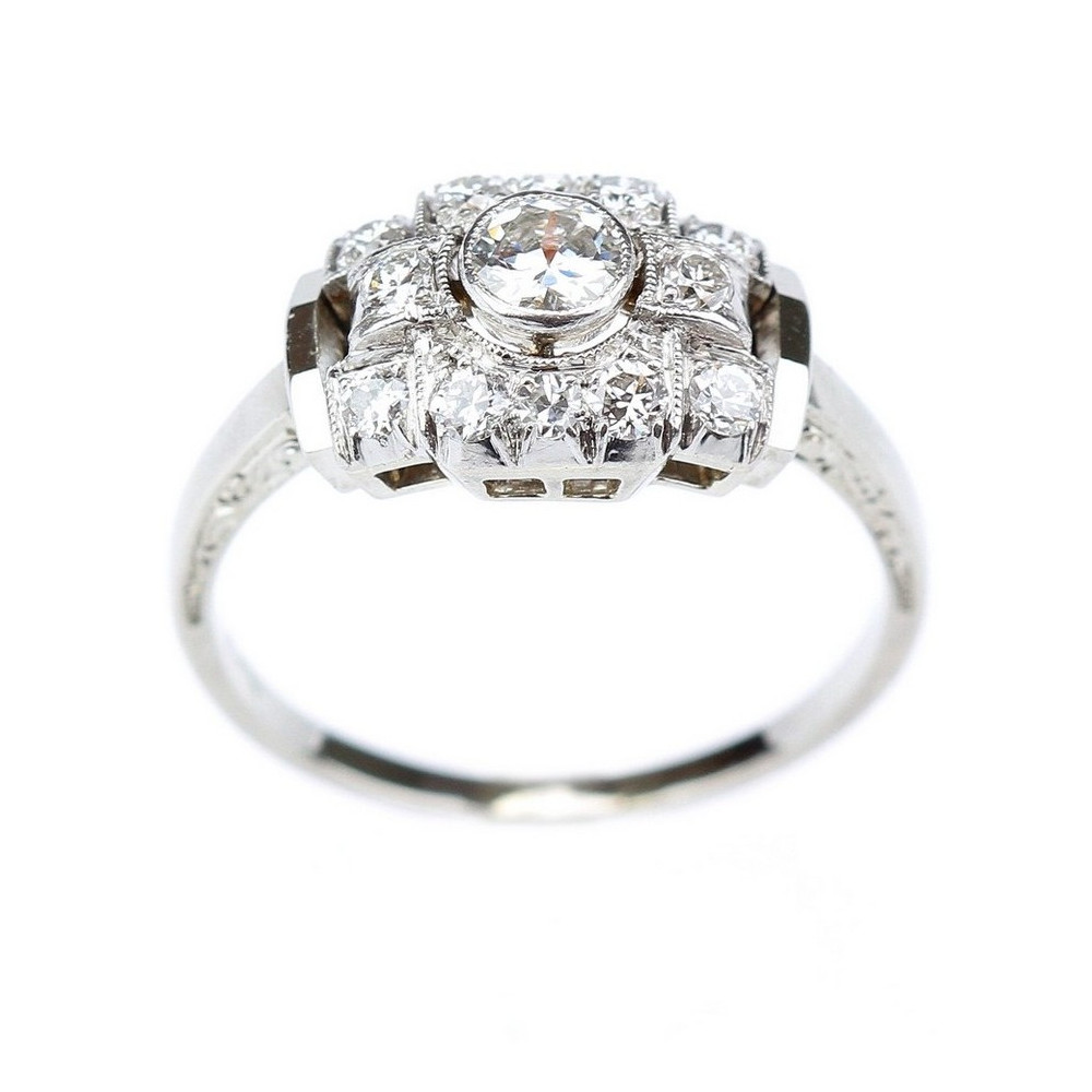 Československý art deco prsten z 30. let 20. století je vyroben z bílého 14karátového zlata a platiny, do které jsou zasazeny přírodní diamanty o celkové váze 0,71 ct. Centrální briliant vážící 0,25 ct je doplněn deseti brilianty po 0,04 ct a dvěma diamanty jednoduchého brusu po 0,03 ct.