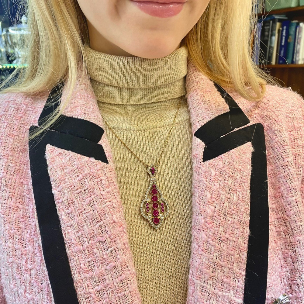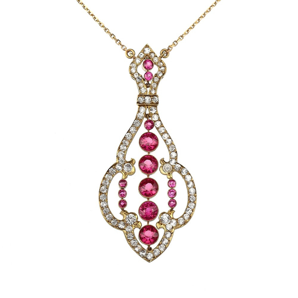 Bohatě zdobený koliér z počátku 20. století. Použitým materiálem je 14karátové žluté a růžové zlato. Kromě ručně gravírovaných a modelovaných dubových lístečků koliér zdobí také grandle a přírodní chryzoprasy. Značeno rakousko-uherským puncem "liška" používaným na našem území mezi lety 1866-1921 a písmenem "C" (označení Puncovního úřadu v Praze). Dále...