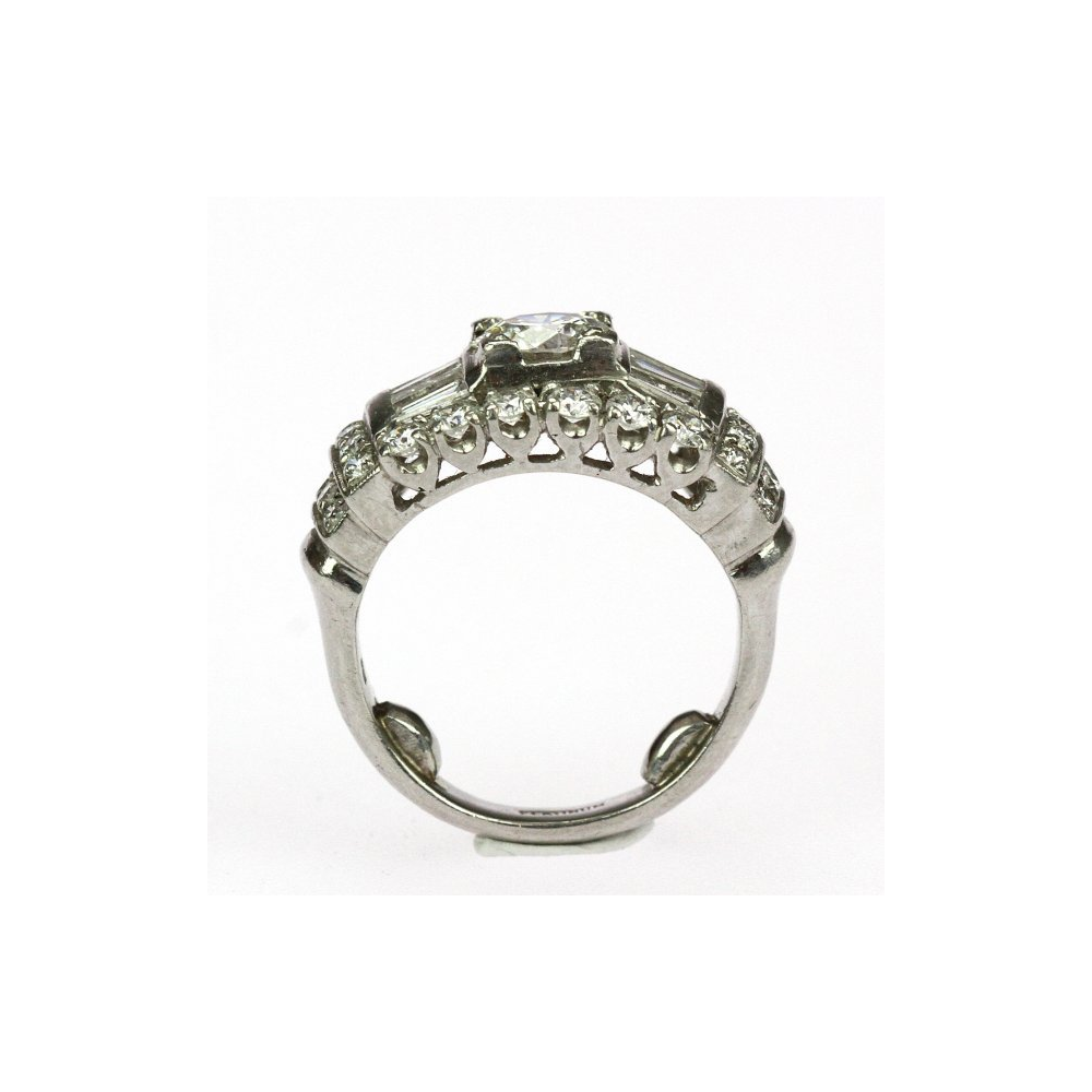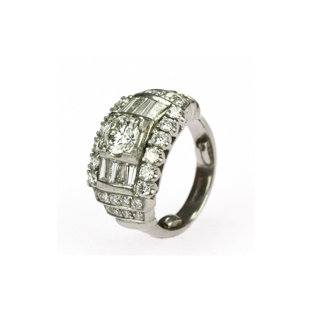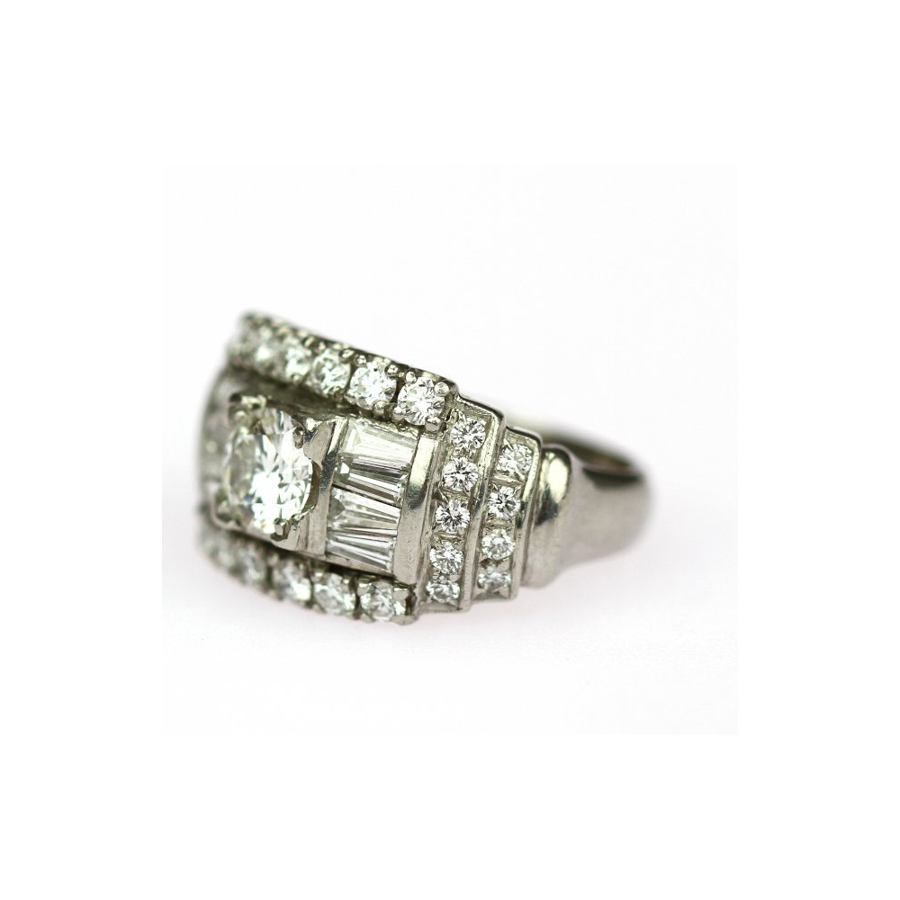 Nápadný art-deco prsten vyrobený z platiny s centrálním briliantem o váze 1,05 ct, barvy G- H a čistoty VS1. Dále je zdoben brilianty 12 x 0,06 , 18 x 0,025 a trapézovými bagetami 8 x 0,09, barva G- H, čistota VVS - VS. Celková váha diamantů je 2,94 ct.