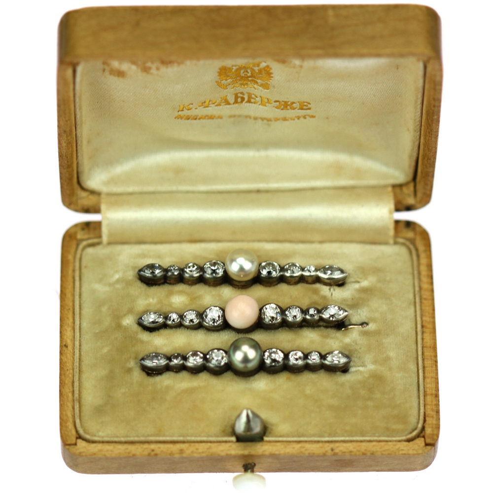 Unikátní šperk zhotovený věhlasnou carskou šperkařskou dílnou - Carl Fabergé. Jedná se o tři brože vyrobené z bílého zlata zdobené 24 starobrusnými diamanty (o celkové váze 1,56 ct, barvě G-H a čistotě VS1-VS2) a černou, bílou a conch perlou - přírodními nekultivovanými perlami. Vyrobeno v období secese mezi lety 1900-1917. Puncováno mistrovskou značkou Carla Fabergého. Doplněno o originální etuji, která byla vyrobena na míru a je ve výtečném stavu.