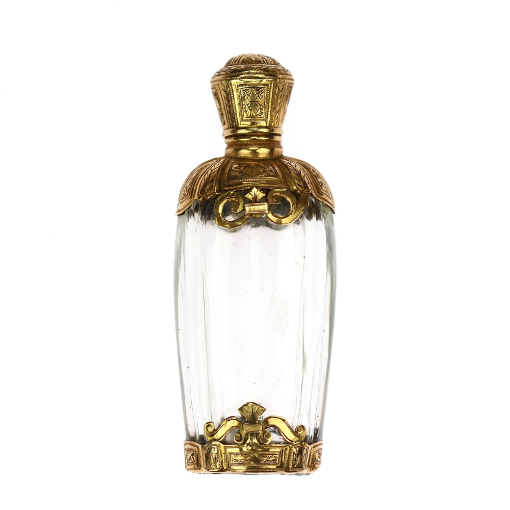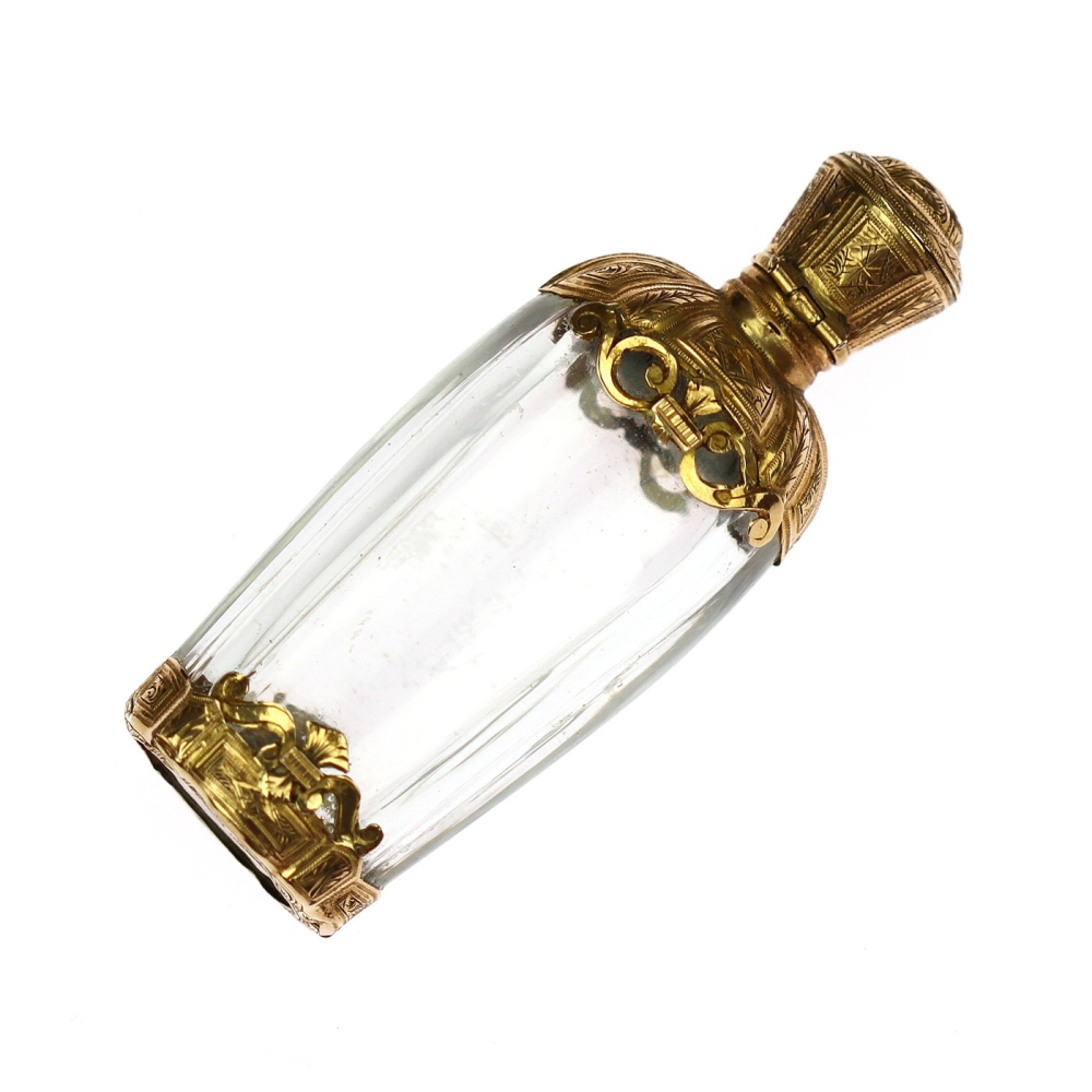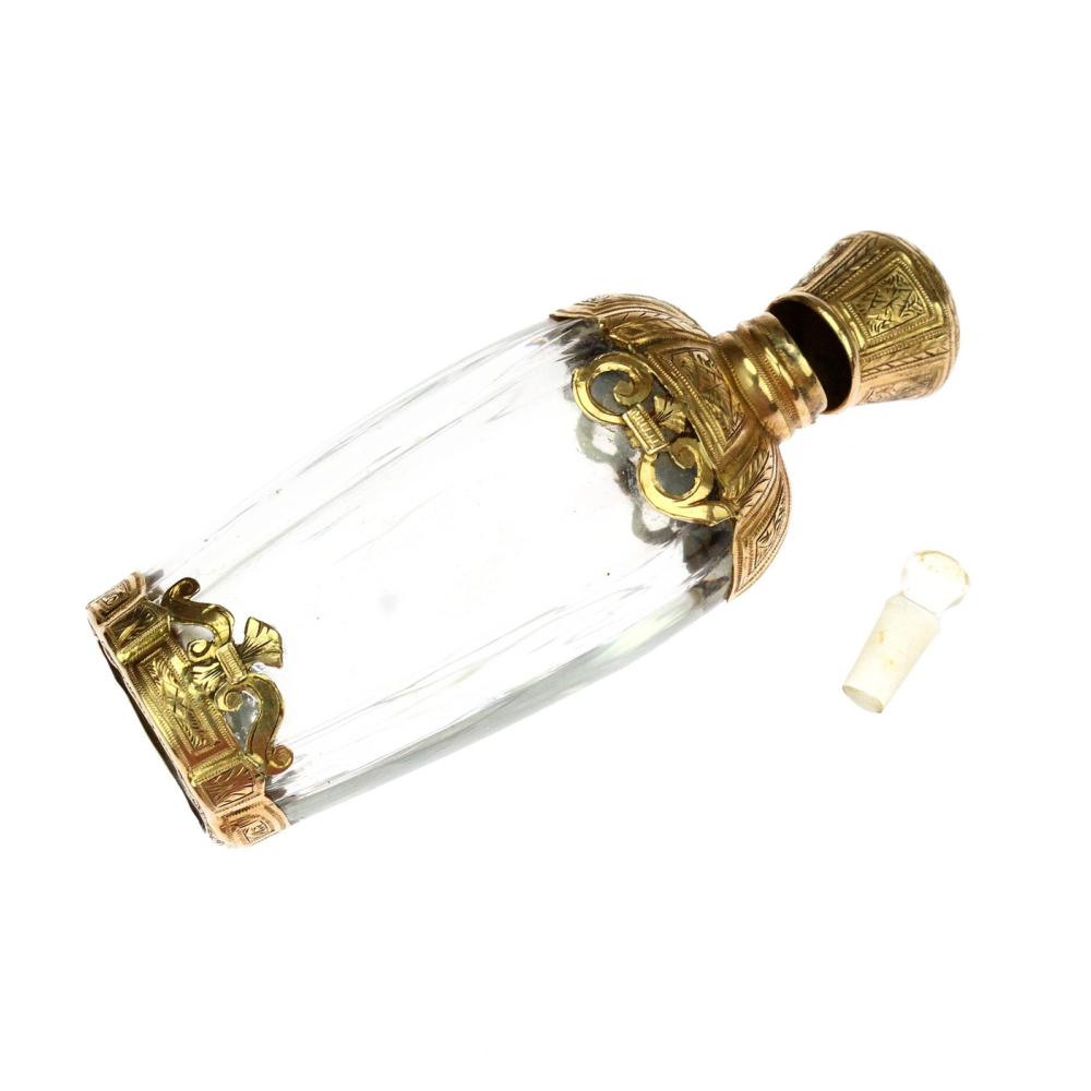 Skleněný flakonek na parfém s montáží z 18karátového žlutého zlata pochází z období raného empíru - Francie konce 18. století. Jedná se o nádhernou práci, zlatá montáž je celoplošně ručně gravírovaná. Flakonek obsahuje původní nepoškozenou skleněnou zátku a původní výstelku zlatého víčka.