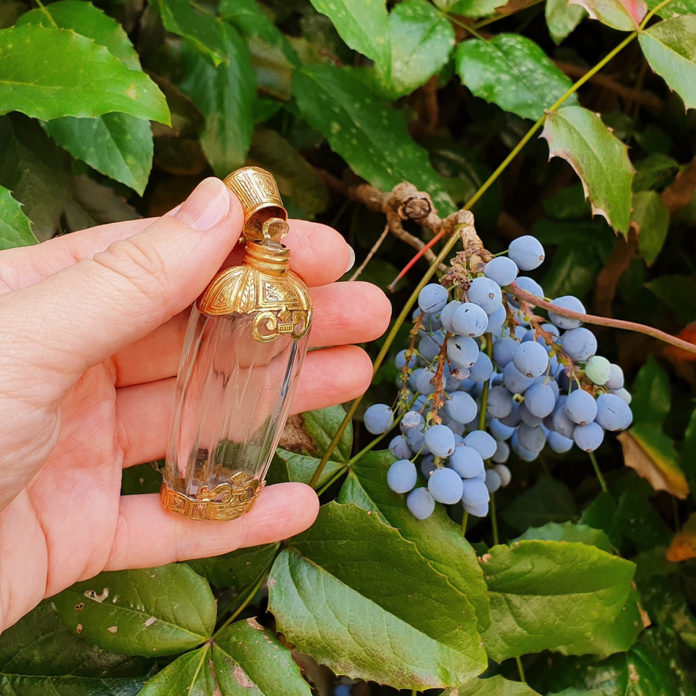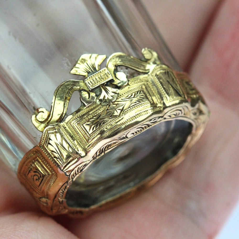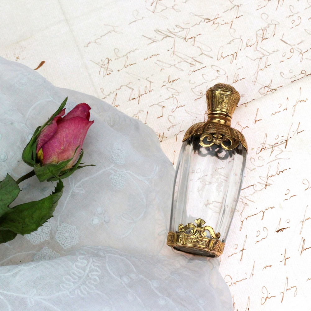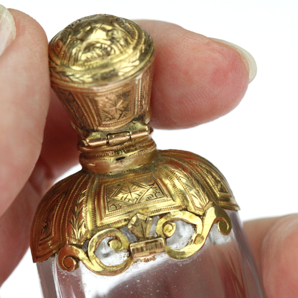 Skleněný flakonek na parfém s montáží z 18karátového žlutého zlata pochází z období raného empíru - Francie konce 18. století. Jedná se o nádhernou práci, zlatá montáž je celoplošně ručně gravírovaná. Flakonek obsahuje původní nepoškozenou skleněnou zátku a původní výstelku zlatého víčka.