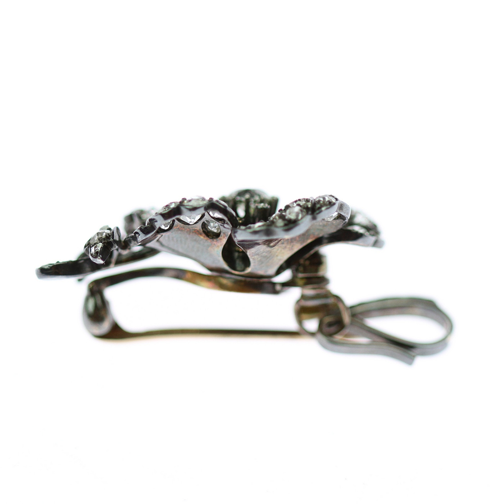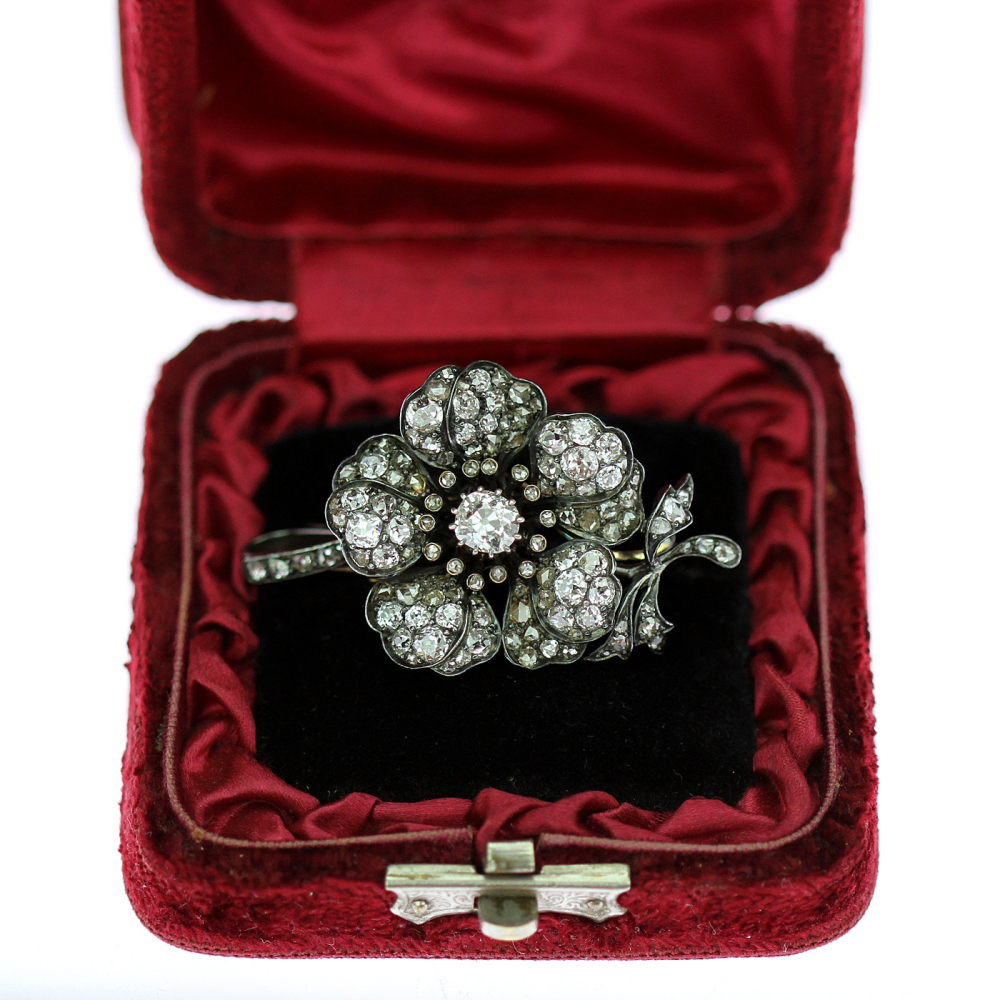 Starožitná diamantová brož (nebo přívěsek) z období kolem poloviny 19. století. Šperk je ze 14karátového zlata ve tvaru květiny fasované starobrusnými diamanty a diamantovými routami o celkové váze 4,52 ct, barvě F-H a čistotě VVS-VS. Centrální kámen brusu "cushion modify" má váhu 0,80 ct. Diamantové routy jsou zasazeny v kovu takovým způsobem, který neumožňuje určení barvy kamene.