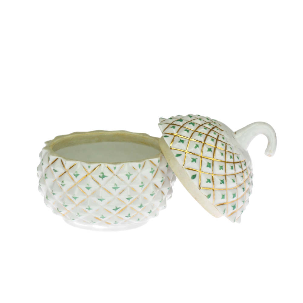 Dóza ve tvaru ananasu vyrobená z porcelánu v 2. polovině 19. století v Čechách. Značeno podglazurně méně čitelnou značkou a číslem "33". Okraje víčka i misky mají několik méně patrných oťuků.