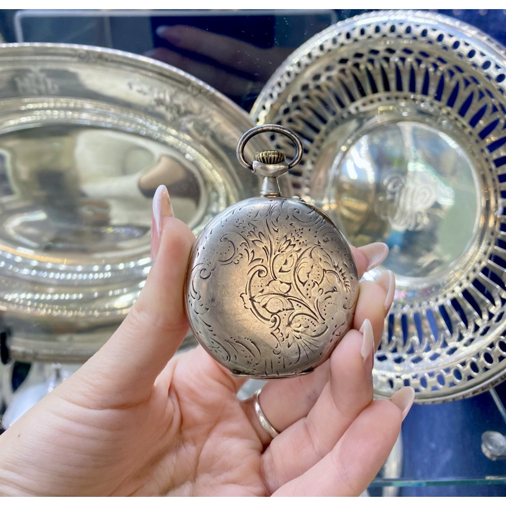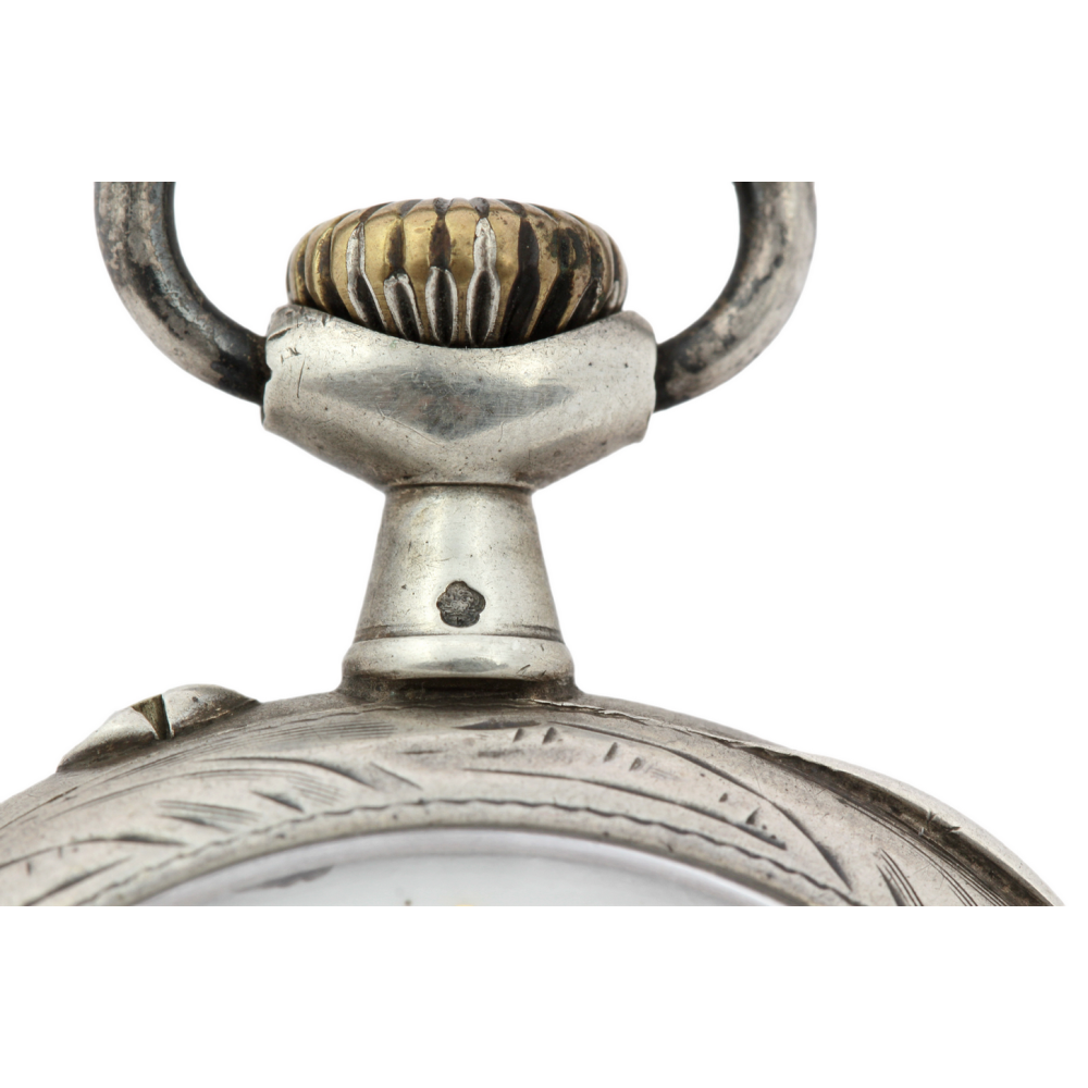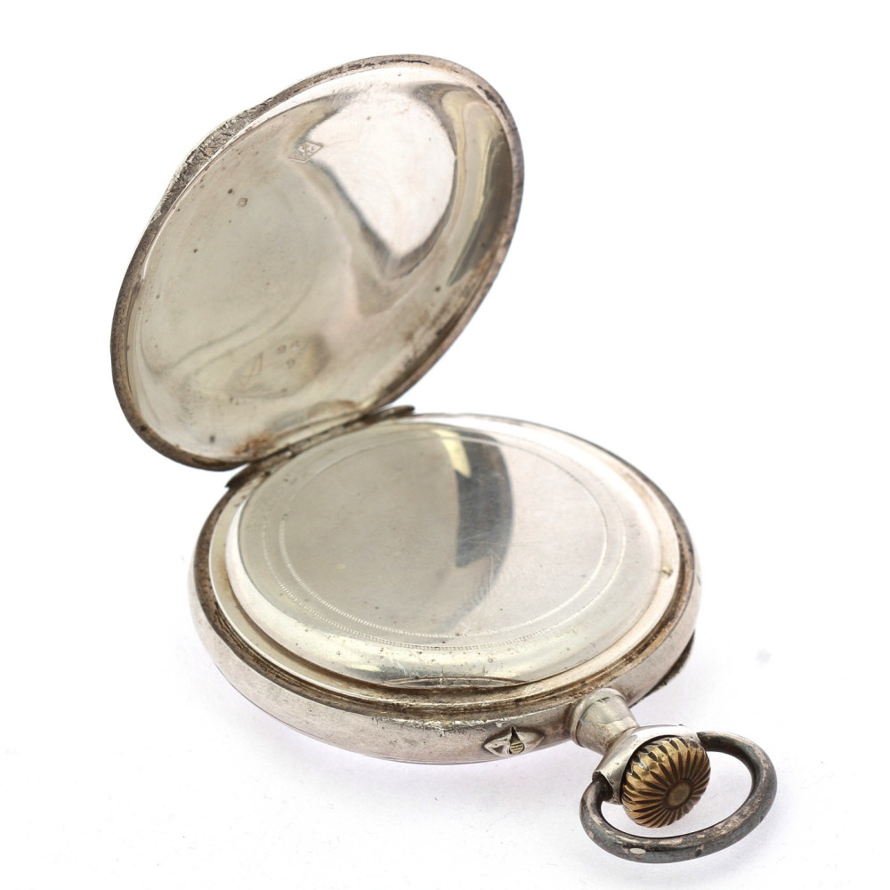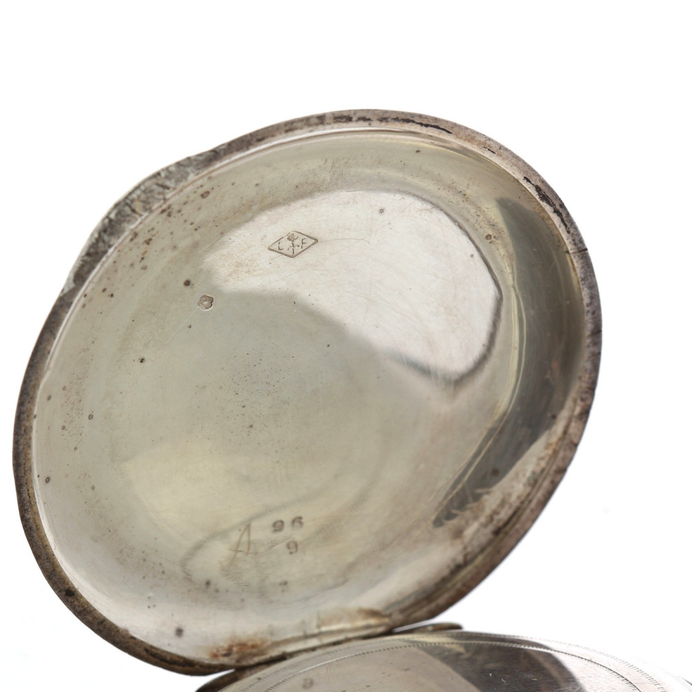 Kapesní hodinky vyrobené ve Francii na počátku 20. století mají celé pouzdro včetně vnitřního prachového pláště zhotovené ze stříbra. Zdobeno gravírováním. Smaltovaný ciferník má římské číslice a samostatně umístěnou vteřinovou ručičku. Hodinky na několika místech značí francouzský punc "krab" pro stříbrné zboží o ryzosti Ag 800/1000.