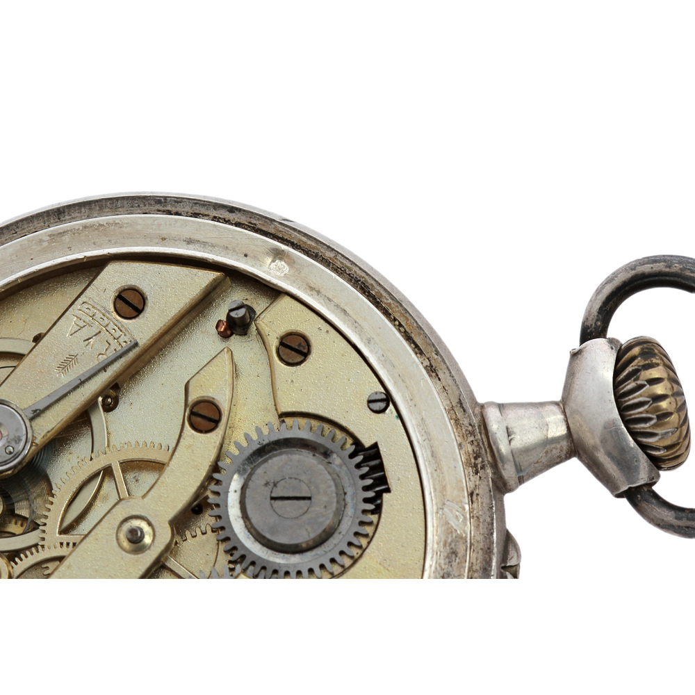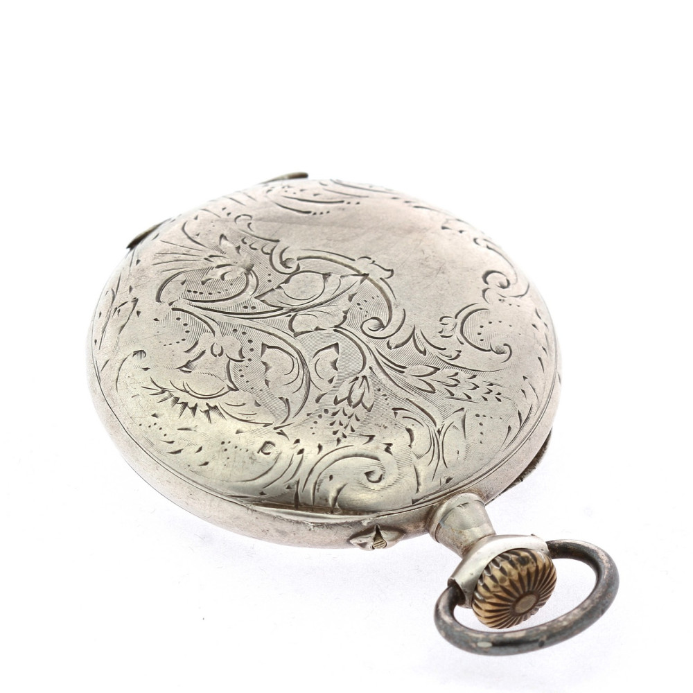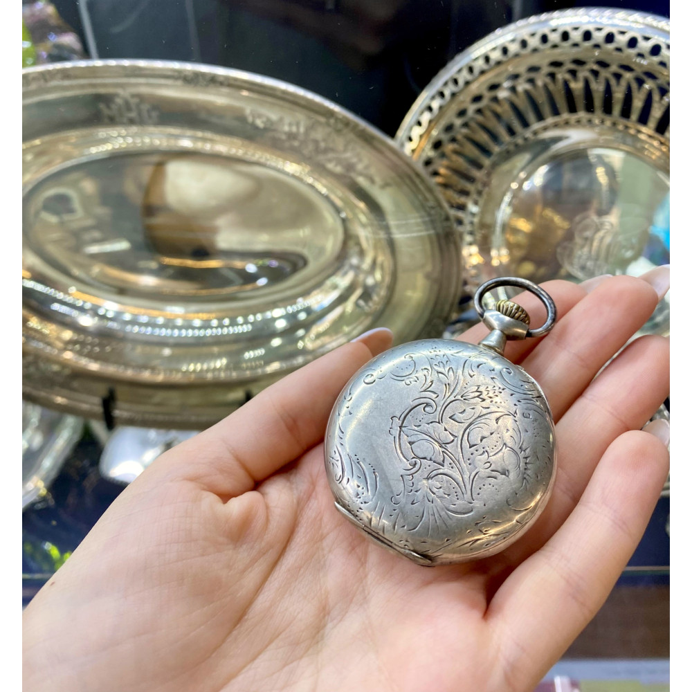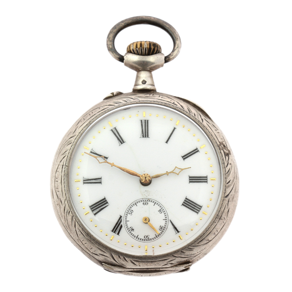 Kapesní hodinky vyrobené ve Francii na počátku 20. století mají celé pouzdro včetně vnitřního prachového pláště zhotovené ze stříbra. Zdobeno gravírováním. Smaltovaný ciferník má římské číslice a samostatně umístěnou vteřinovou ručičku. Hodinky na několika místech značí francouzský punc "krab" pro stříbrné zboží o ryzosti Ag 800/1000.
