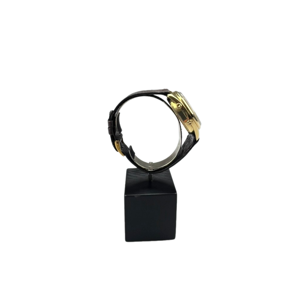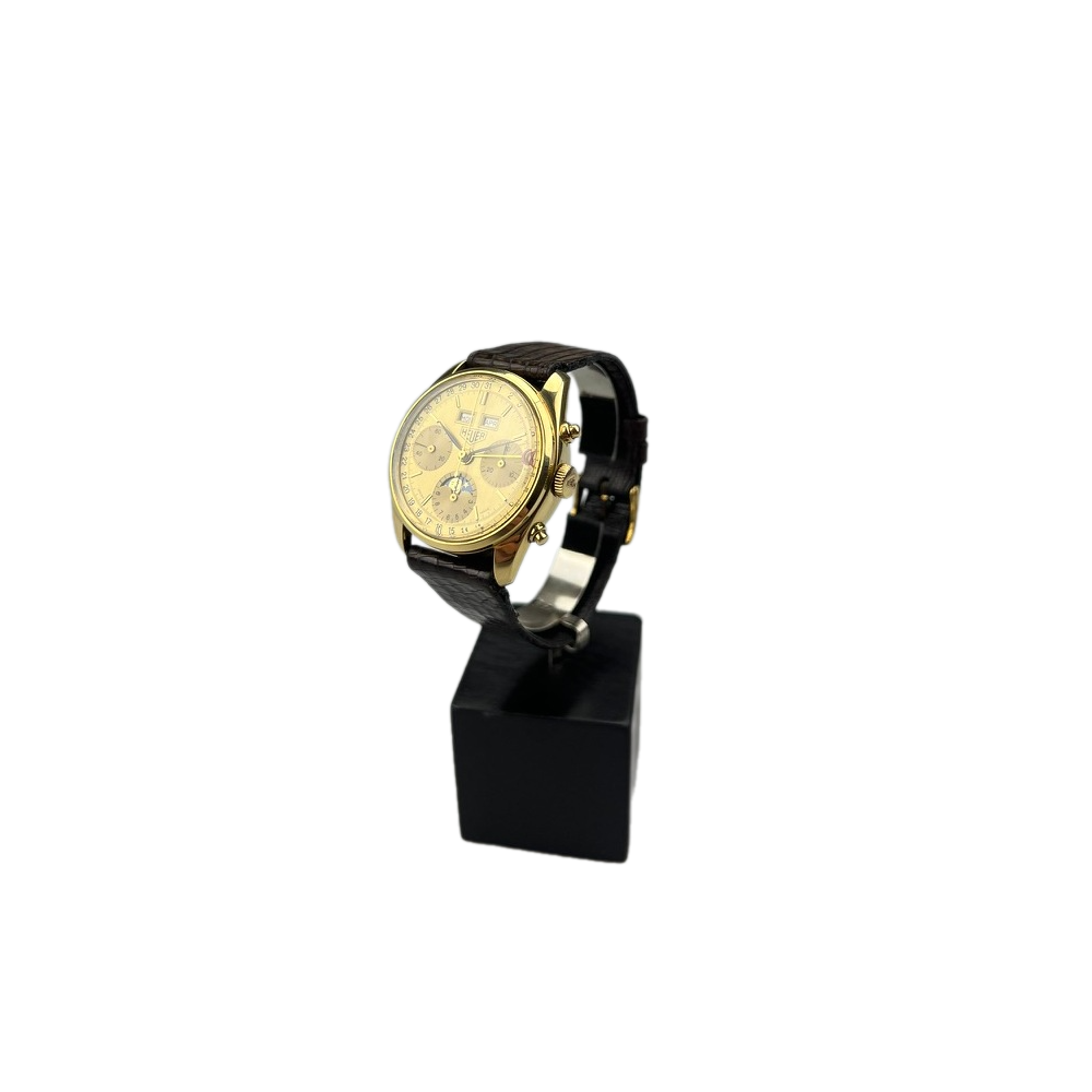Pouzdro je vyrobeno z 18karátového zlata, doplněno kulatými tlačítky chronografu a jemným, tmavě hnědým, koženým páskem. Ciferník v barevném tónu champagne je řešenými subciferníky harmonicky ladí se zlatými ručkami a indexy, čímž vytváří mimořádně elegantní a nadčasový vzhled.