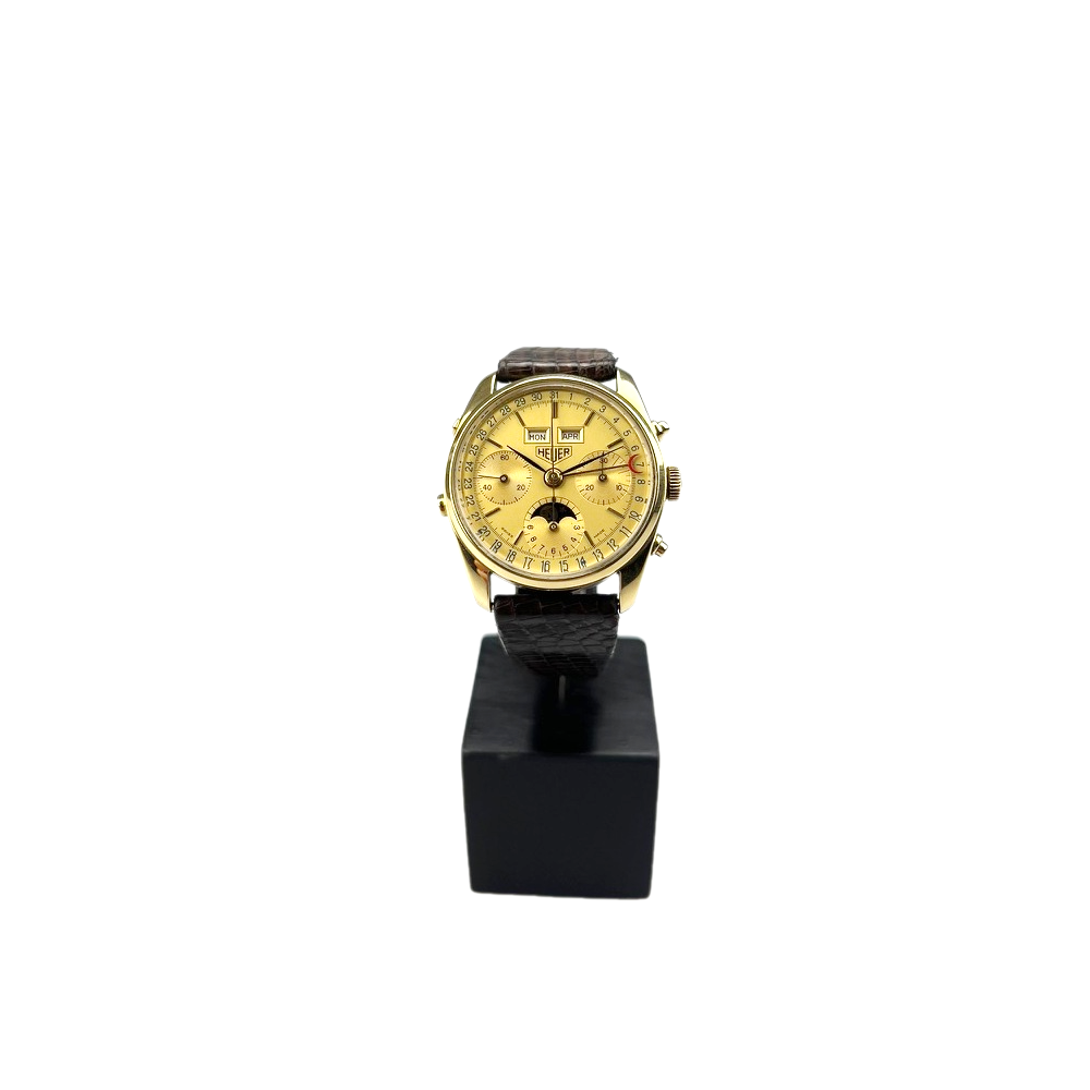 Model Golden Hours Moon Phase Chronograph Ref. 721.208 od značky Heuer představuje výjimečné spojení klasické hodinářské estetiky a tradičních mechanických komplikací. Společnost Heuer je přímým předchůdcem dnešní značky TAG Heuer, která navazuje na její bohaté dědictví v oblasti precizních chronografů. Tato limitovaná edice z 80. let 20. století byla vytvořena jako oslava zlaté éry mechanických komplikací a dnes patří mezi vyhledávané sběratelské kusy s výrazným vintage charakterem.