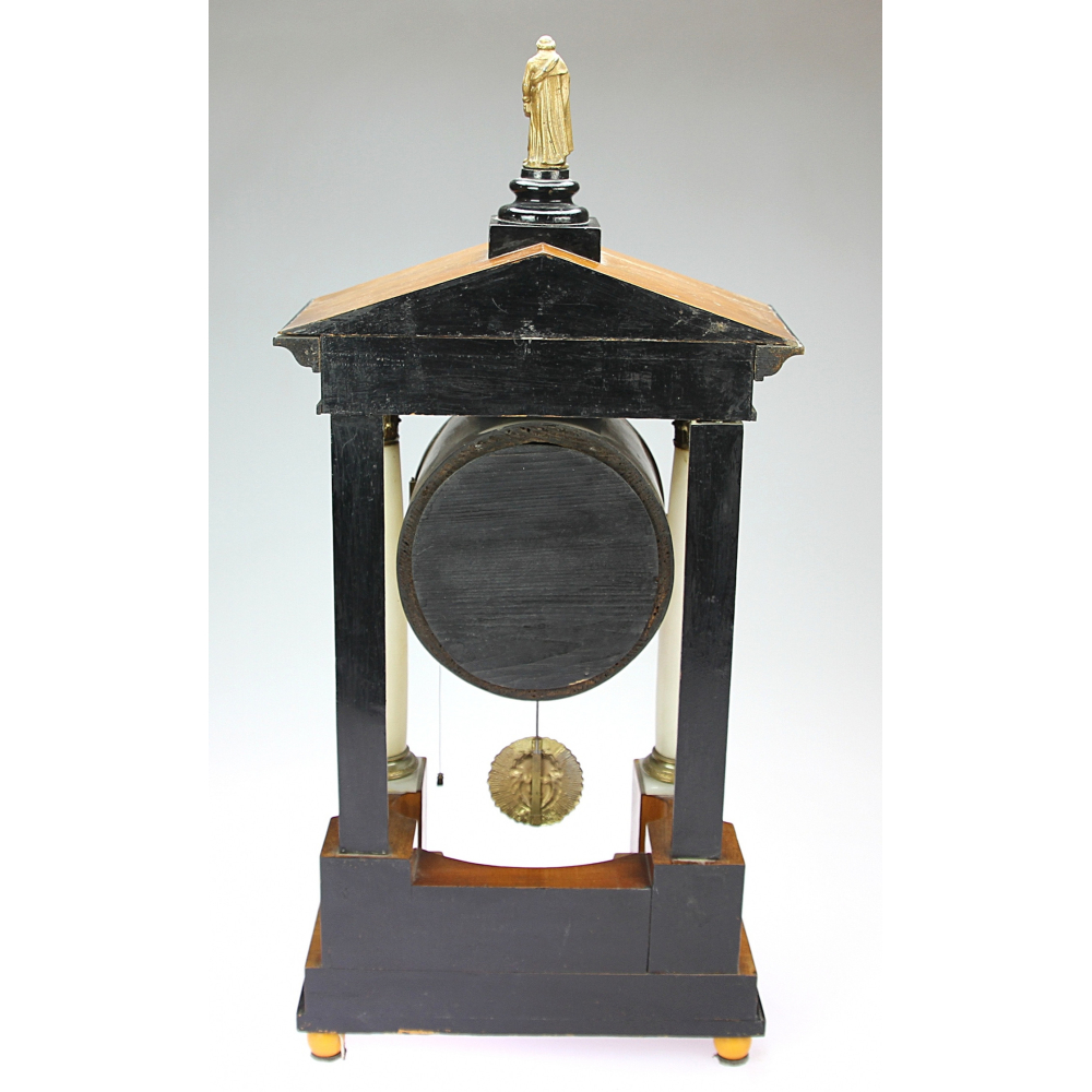 Sloupkové hodiny byly vyrobeny v období biedermeier, kolem roku 1830 - 1840. Číselník je velmi zachovalý, je tvořen kombinací mosazi a porcelánu. Bití je čtvrťové. Dřevěnou stavbu doplňují alabastrové sloupky na čelní straně. Mosazné zdobení i kyvadlo jsou původní.