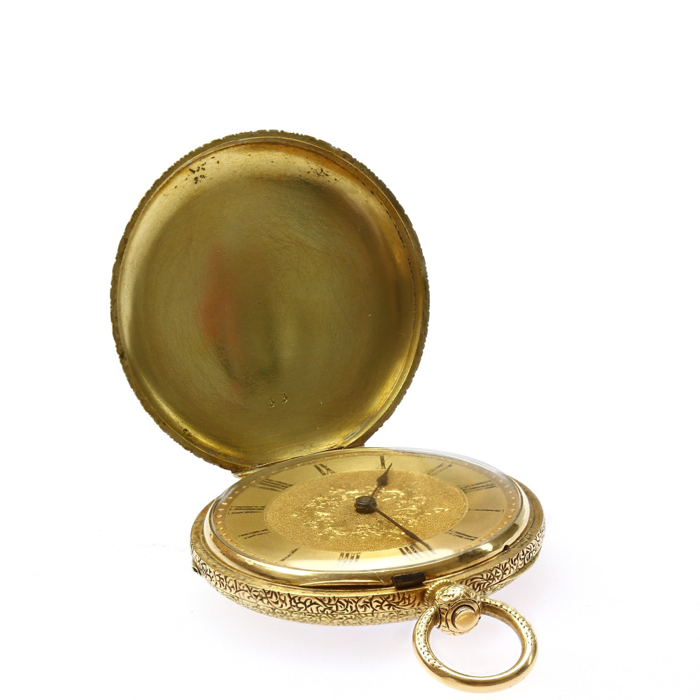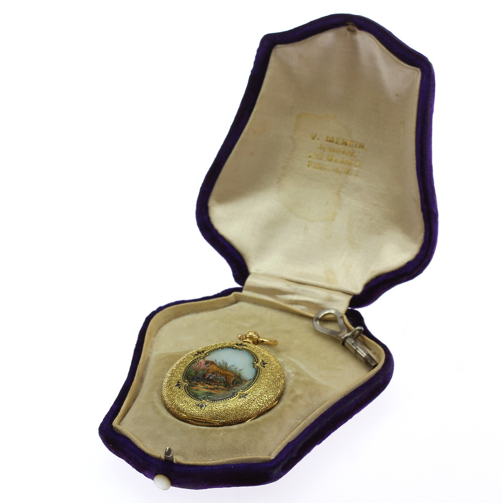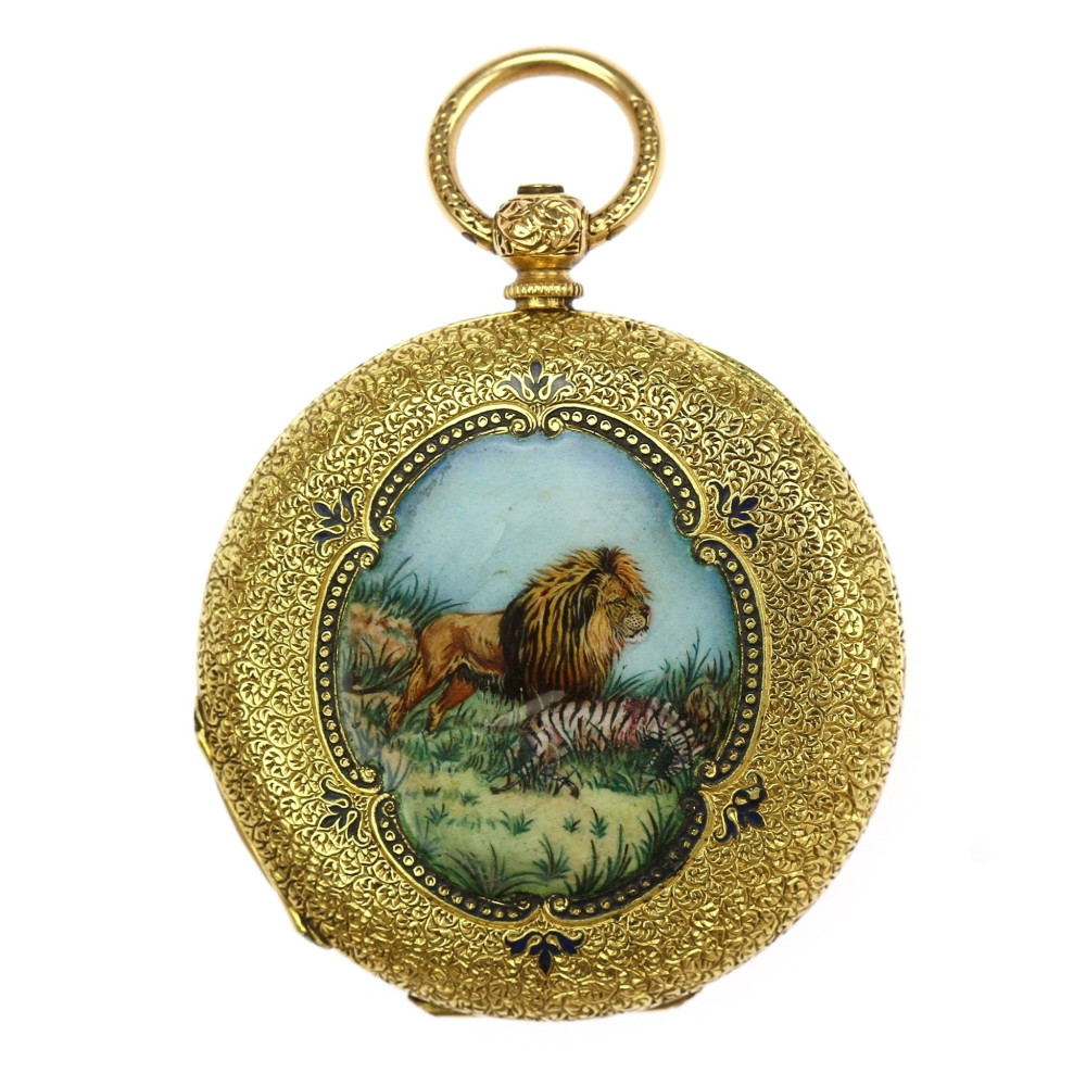 Tříplášťové kapesní hodinky mají všechny pláště zhotovené ze žlutého 18karátového zlata. Z vnějšku jsou hodinky bohatě zdobené gravírováním a malbou barevnými emaily zachycující exotickou scénu s tygrem na přední straně a lvem na zadní straně hodinek. Ciferník má římské číslice. Vnitřní prachový plášť značí nápis "J. H. Steward. 406. Strand. London."