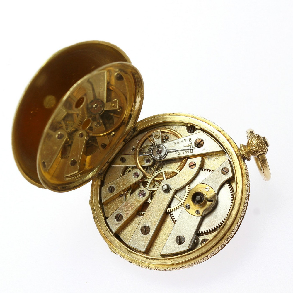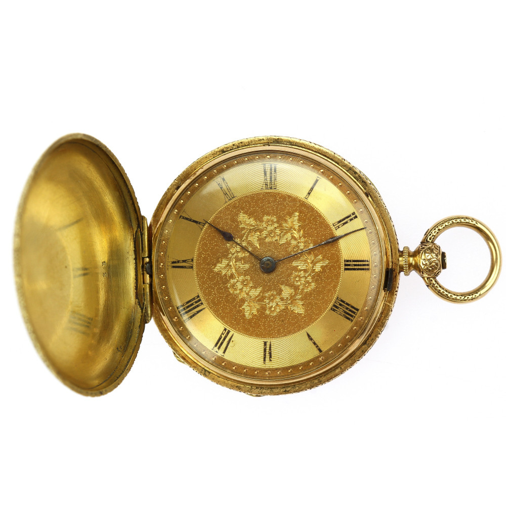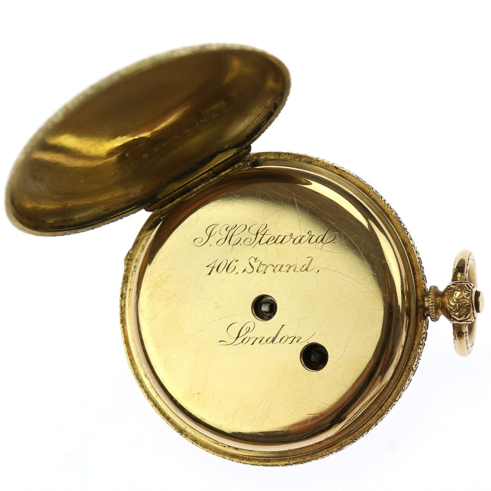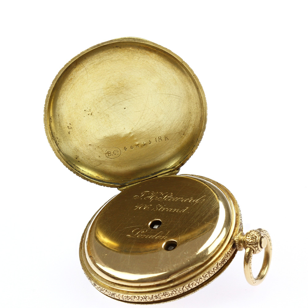 Tříplášťové kapesní hodinky mají všechny pláště zhotovené ze žlutého 18karátového zlata. Z vnějšku jsou hodinky bohatě zdobené gravírováním a malbou barevnými emaily zachycující exotickou scénu s tygrem na přední straně a lvem na zadní straně hodinek. Ciferník má římské číslice. Vnitřní prachový plášť značí nápis "J. H. Steward. 406. Strand. London."