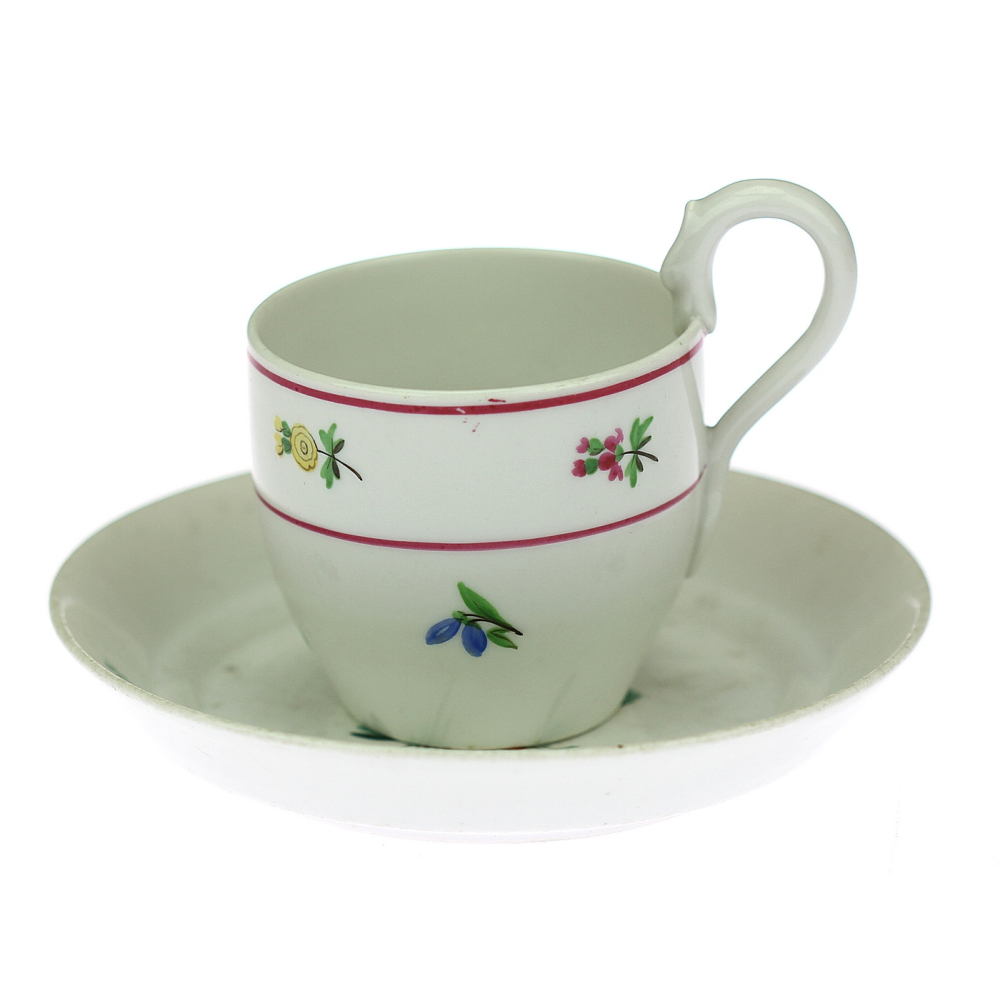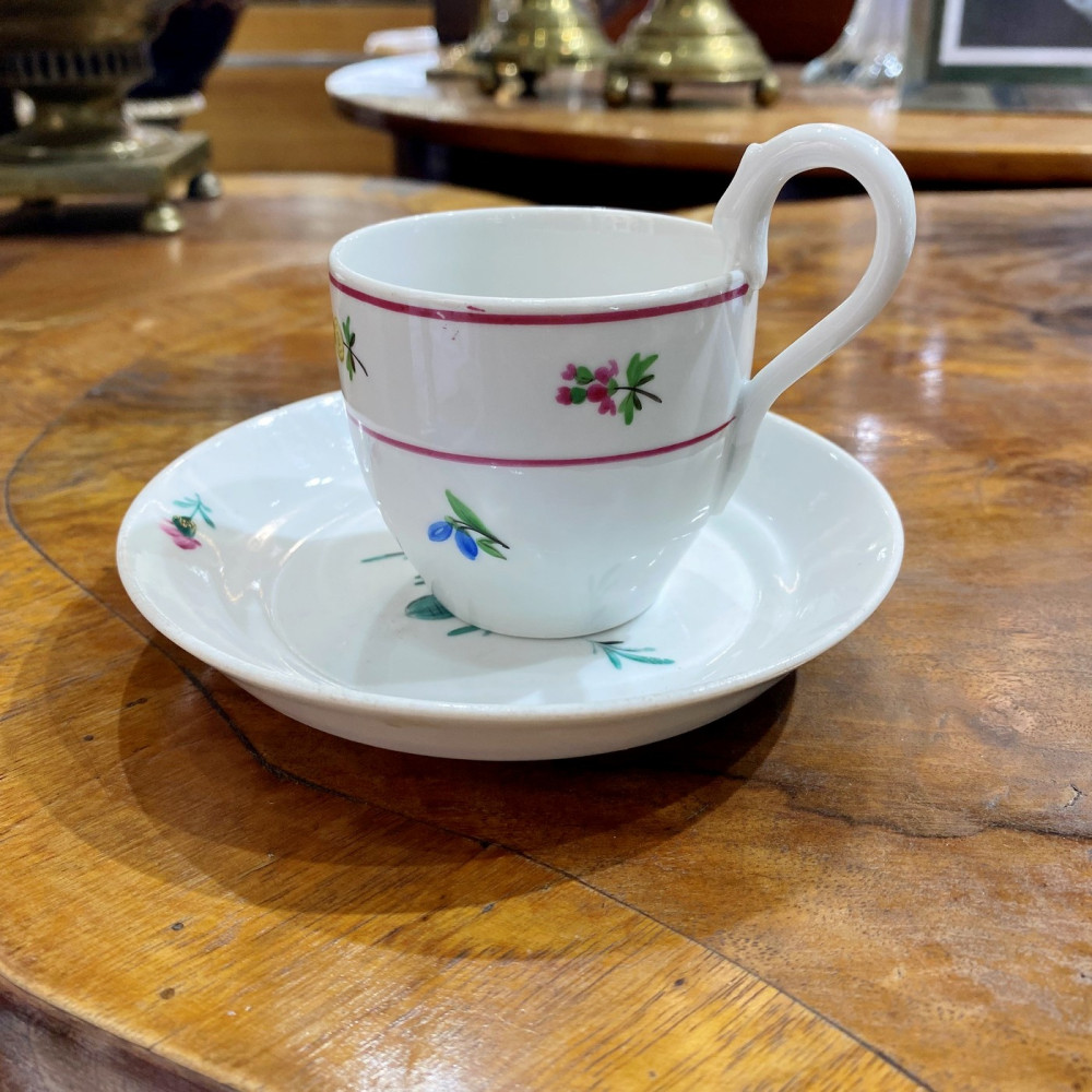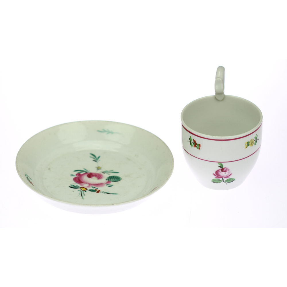 Šálek s podšálkem vyrobený z porcelánu a zdobený květinovým dekorem.