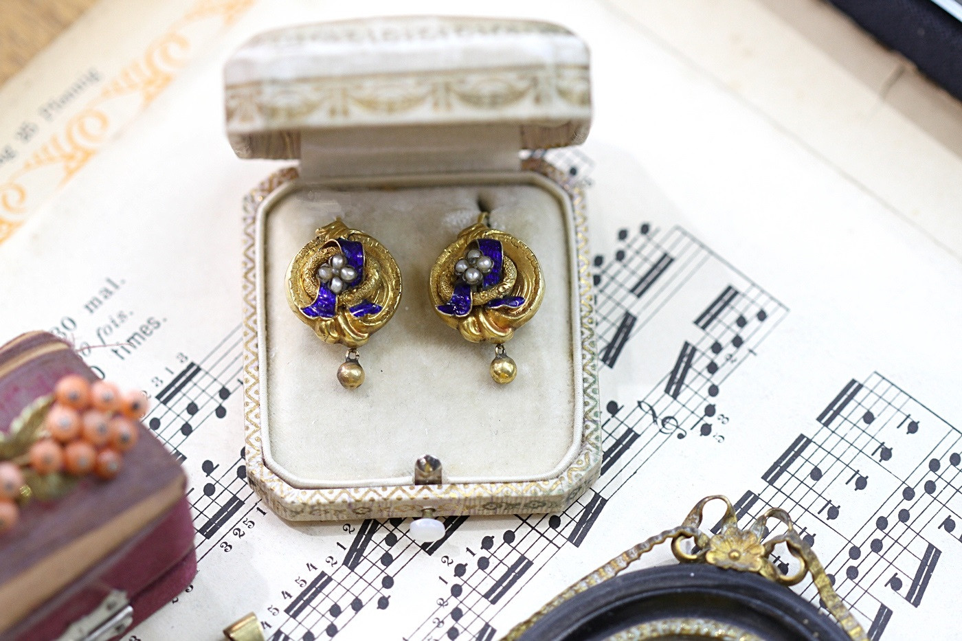 Tyto visací náušnice s ověsky, zdobené modrým smaltem a perličkami, sice úkryt nemají, svou majitelku ale rozhodně učiní nepřehlédnutelnou.
