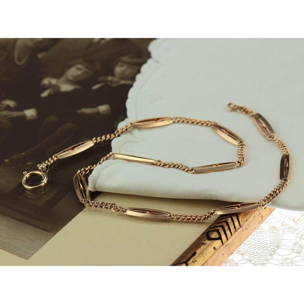 Prvorepublikový šatlén (řetízek ke kapesním hodinkám) z růžového 14karátového zlata. Na řetízku je na očku navléknut kruhový přívěsek, který je po obou stranách zdobený jemně rytými monogramy a datumy. Šperk má na každém konci jednu karabinu, obě jsou plně funkční, ve výborném stavu. Řetízek je možné nosit i jako náhrdelník.