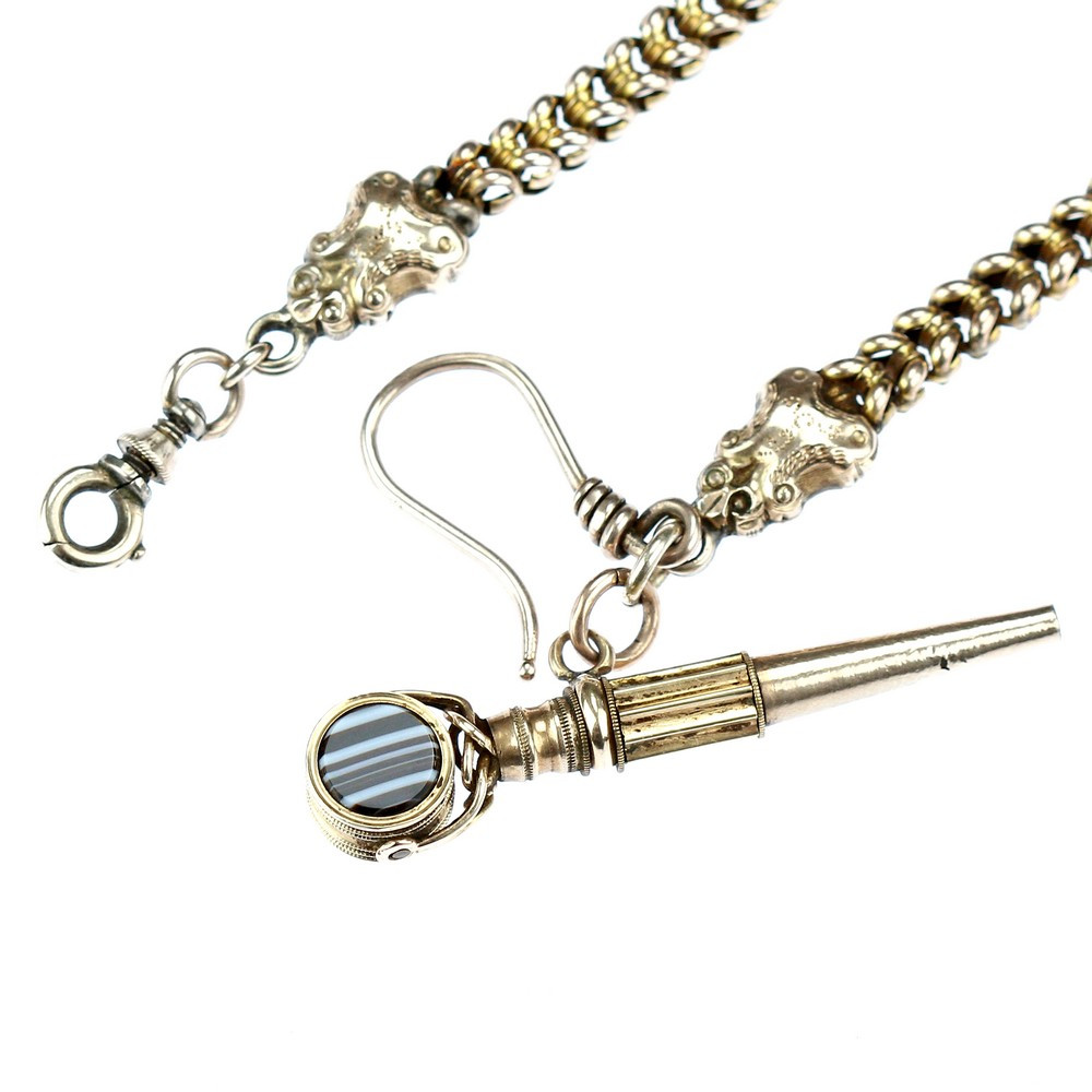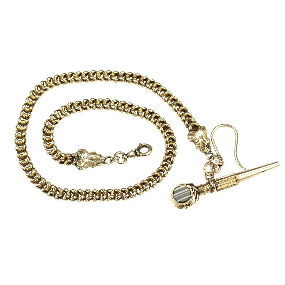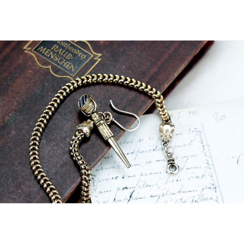 Řetízek ke kapesním hodinkám vyrobený v 2. polovině 19. století z nízkoryzostního zlata (Au 350/1000 a Au 300/1000) světle žlutorůžové barvy. Má původní šroubovací karabinu a klíček z obecného kovu s otočným achátovým pečetítkem.