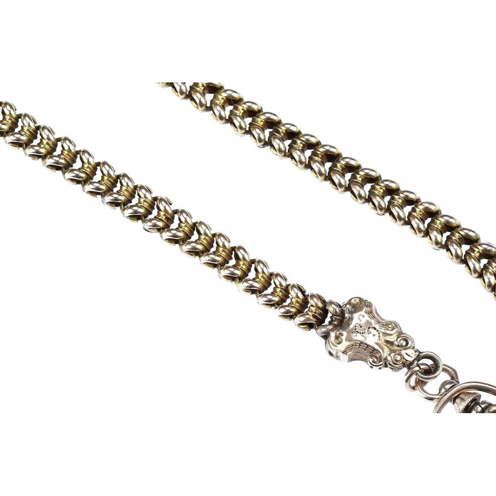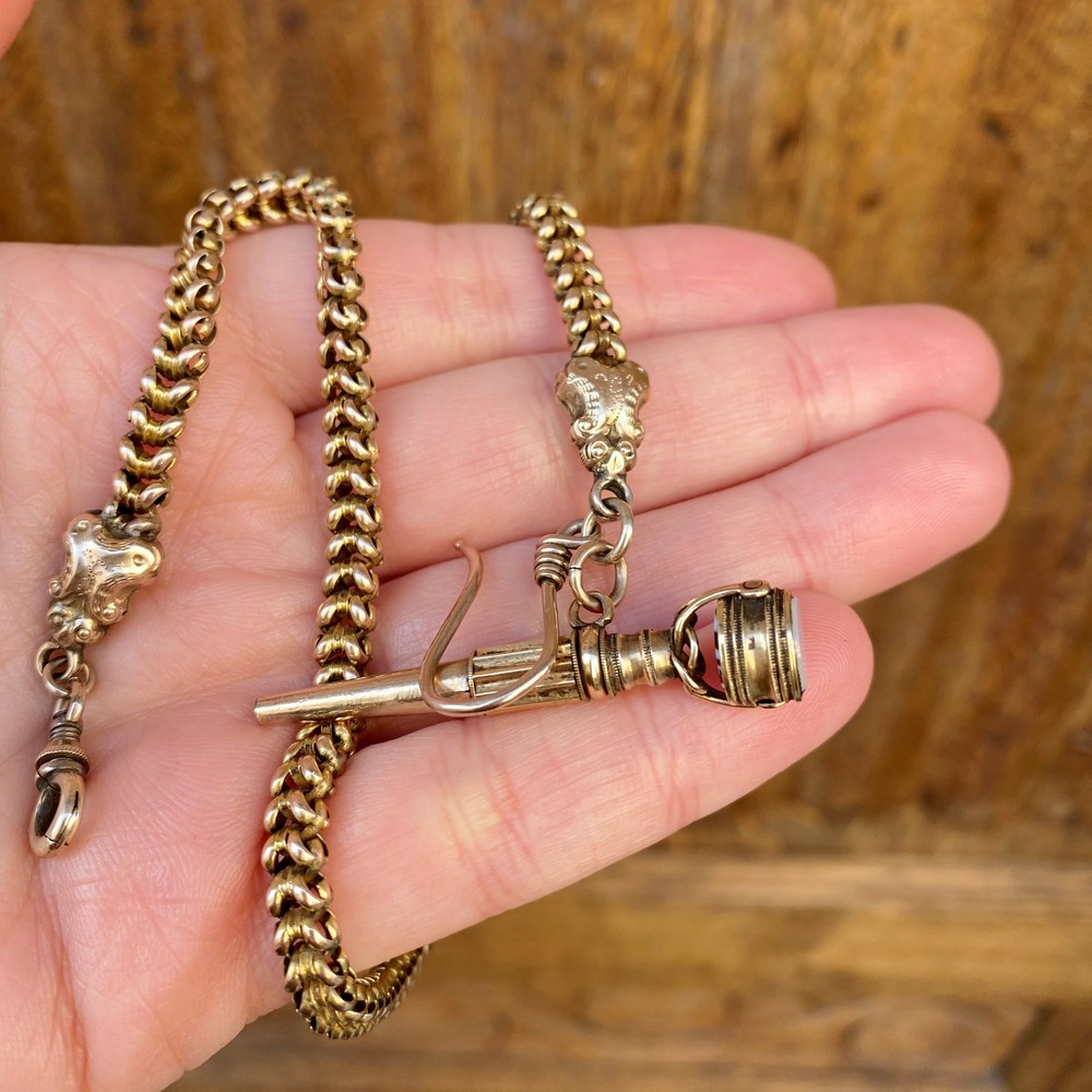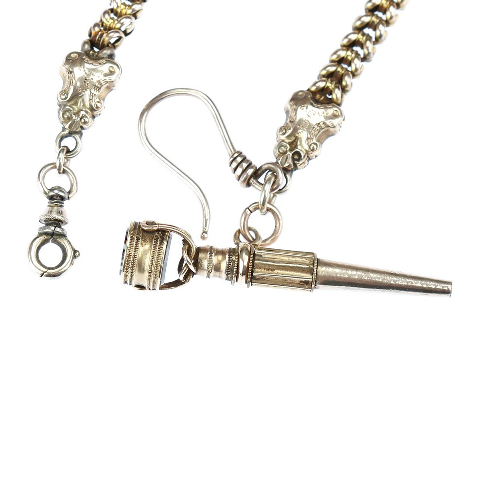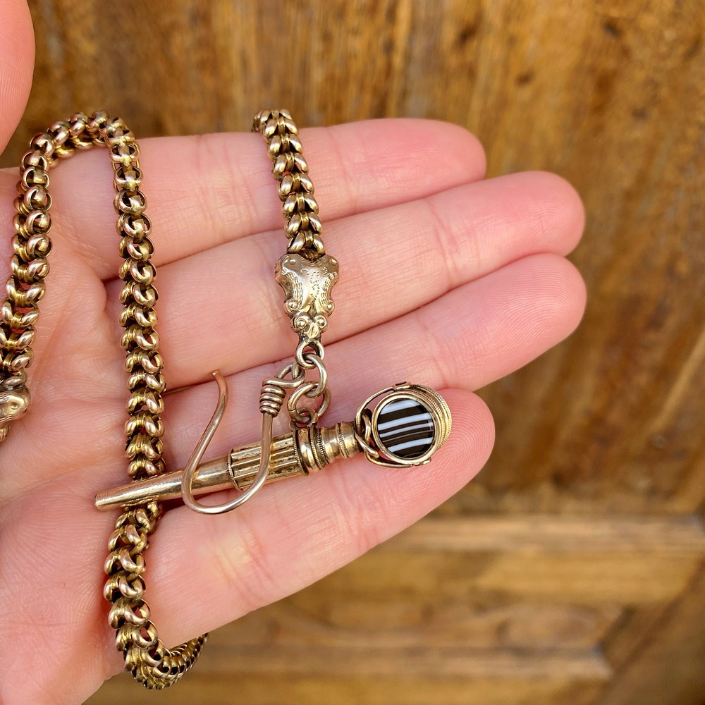 Řetízek ke kapesním hodinkám vyrobený v 2. polovině 19. století z nízkoryzostního zlata (Au 350/1000 a Au 300/1000) světle žlutorůžové barvy. Má původní šroubovací karabinu a klíček z obecného kovu s otočným achátovým pečetítkem.