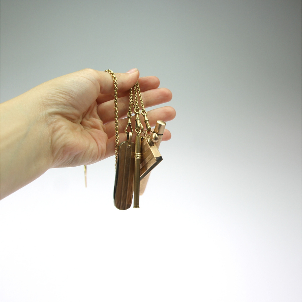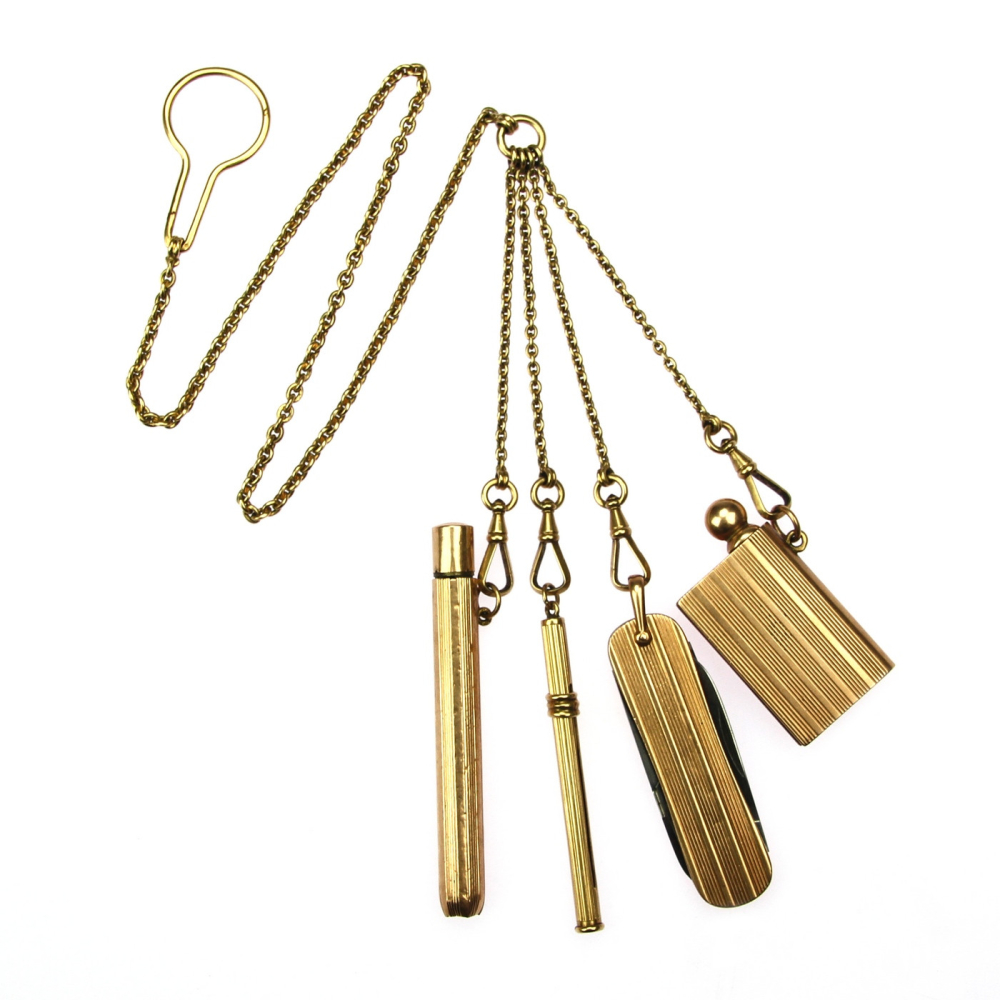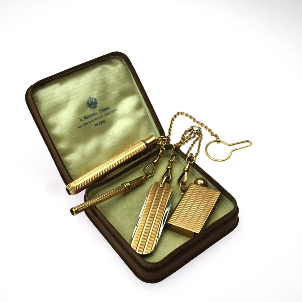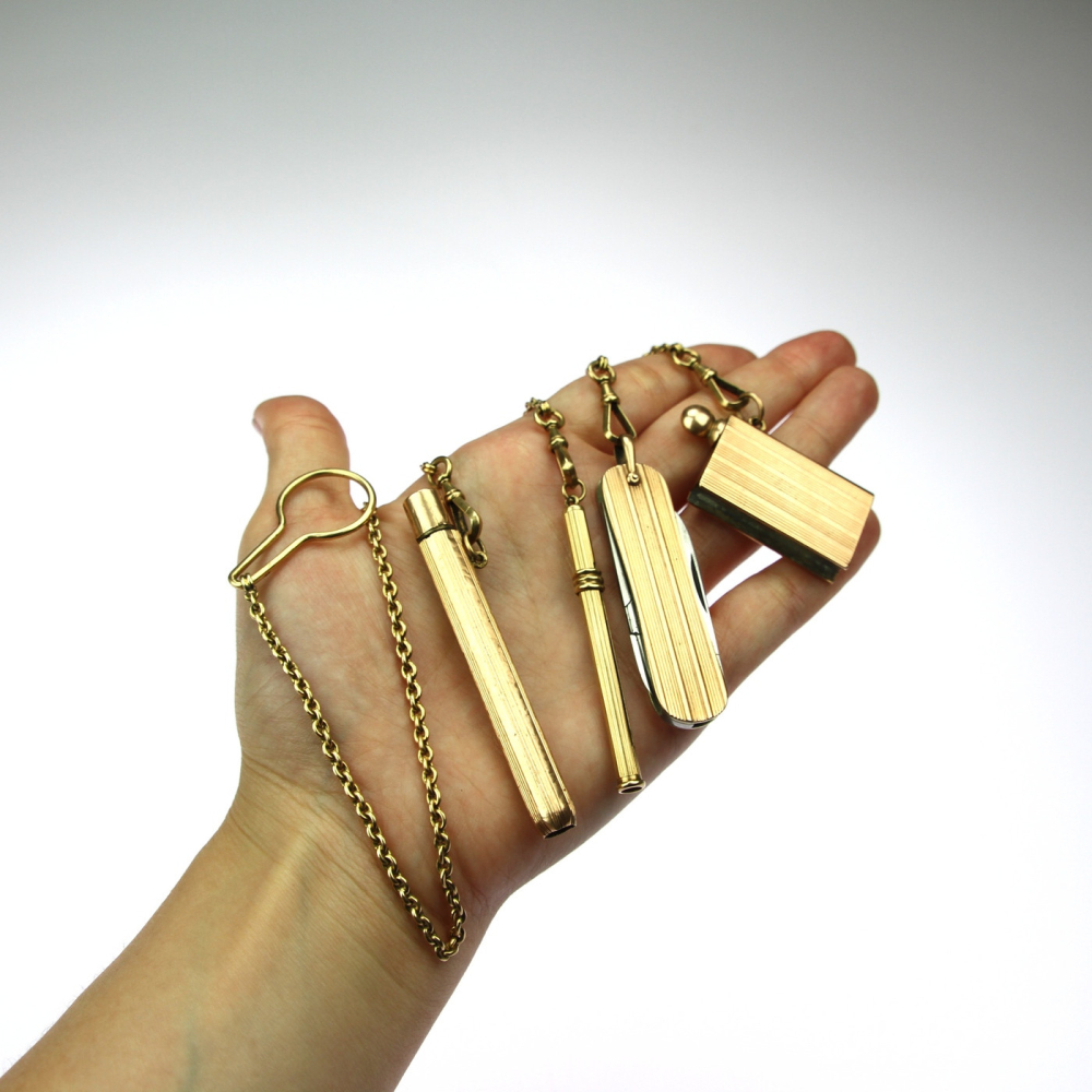 Šatlén - kuřácká souprava se čtyřmi přívěsky (zapalovač, párátko, nožík s pilníkem a nůžtičkami, propichovač doutníků) na zavěšení na knoflík. Zhotoveno z gravírovaného růžového zlata.