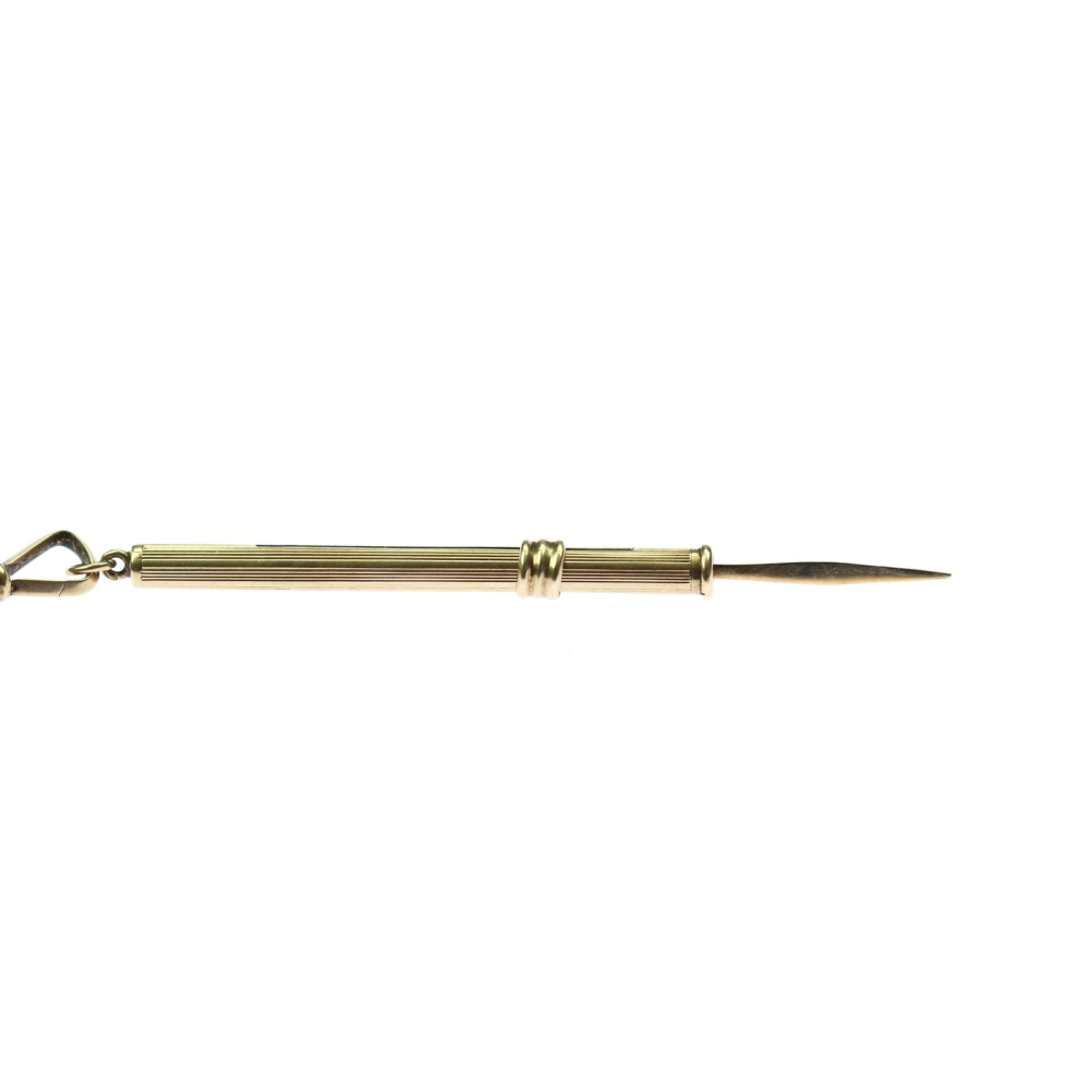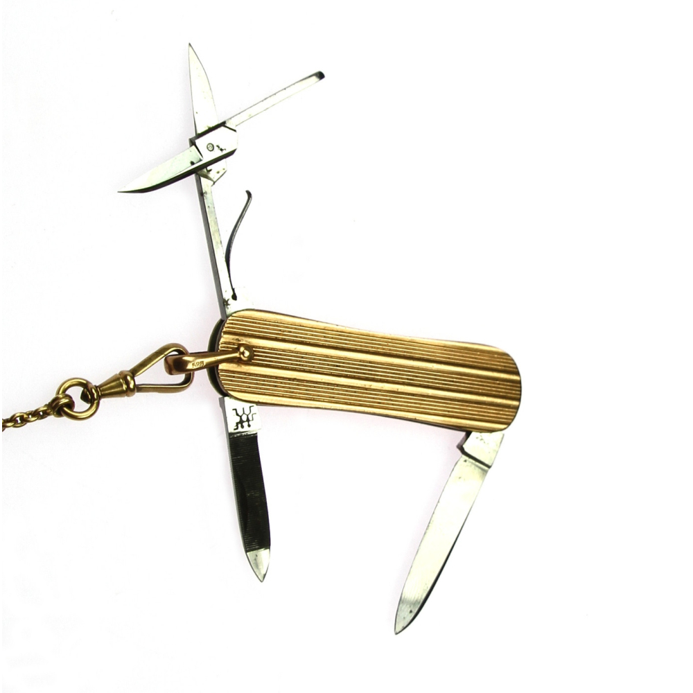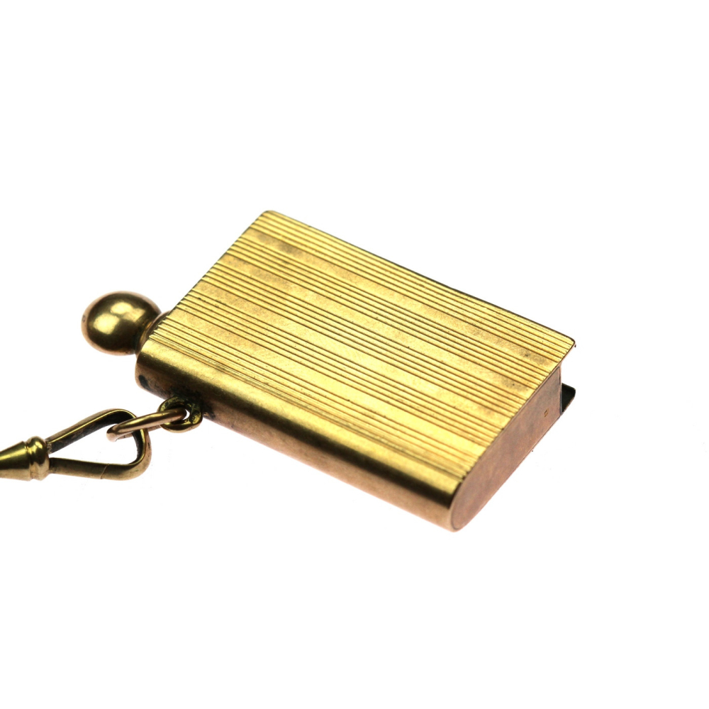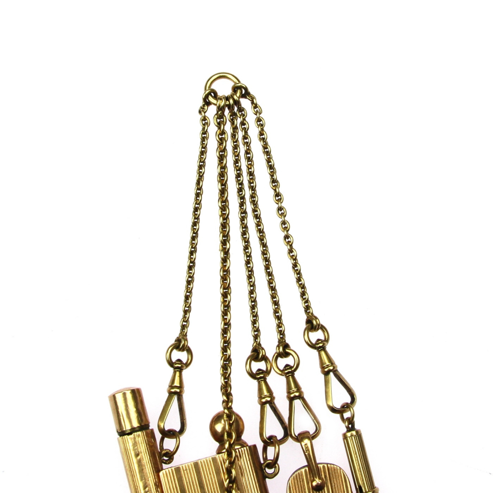 Šatlén - kuřácká souprava se čtyřmi přívěsky (zapalovač, párátko, nožík s pilníkem a nůžtičkami, propichovač doutníků) na zavěšení na knoflík. Zhotoveno z gravírovaného růžového zlata.