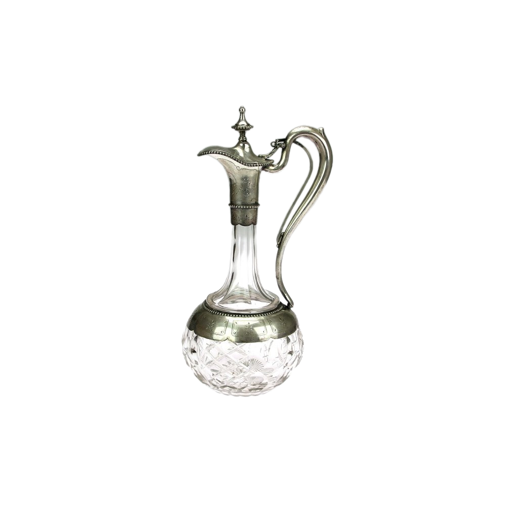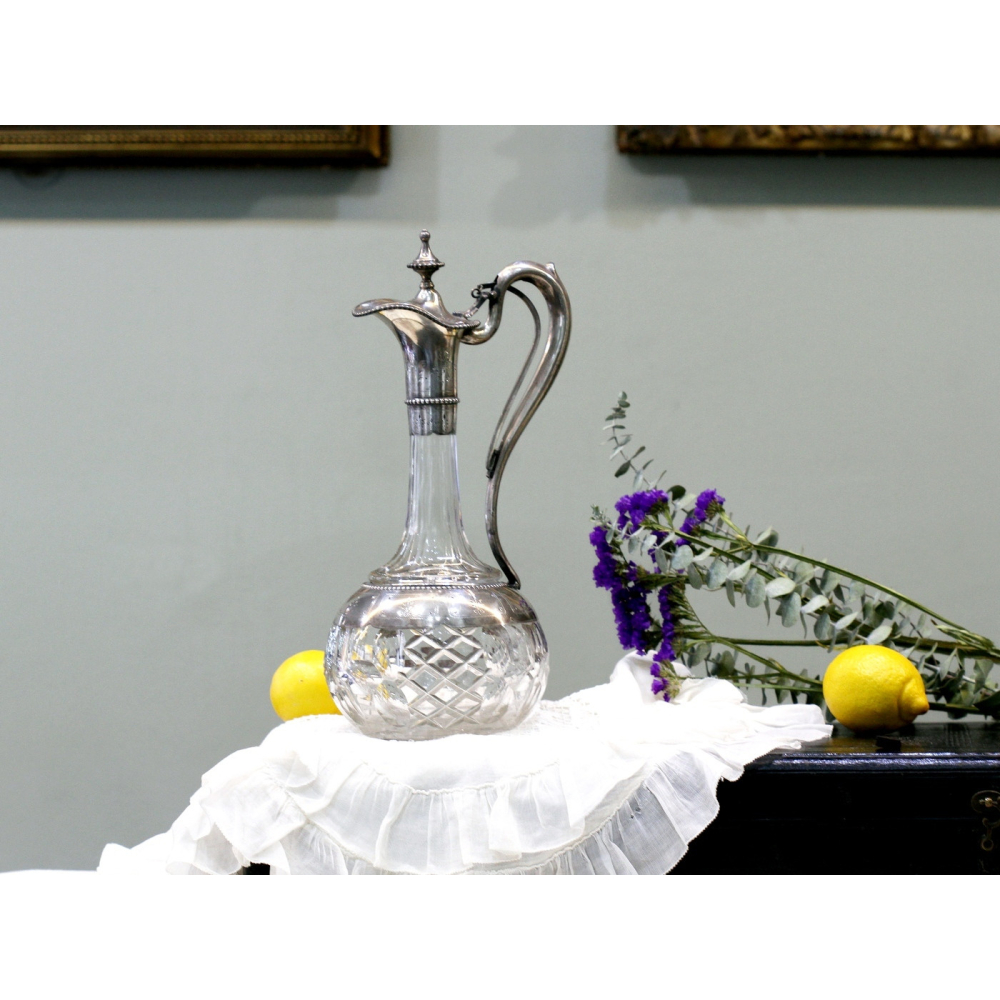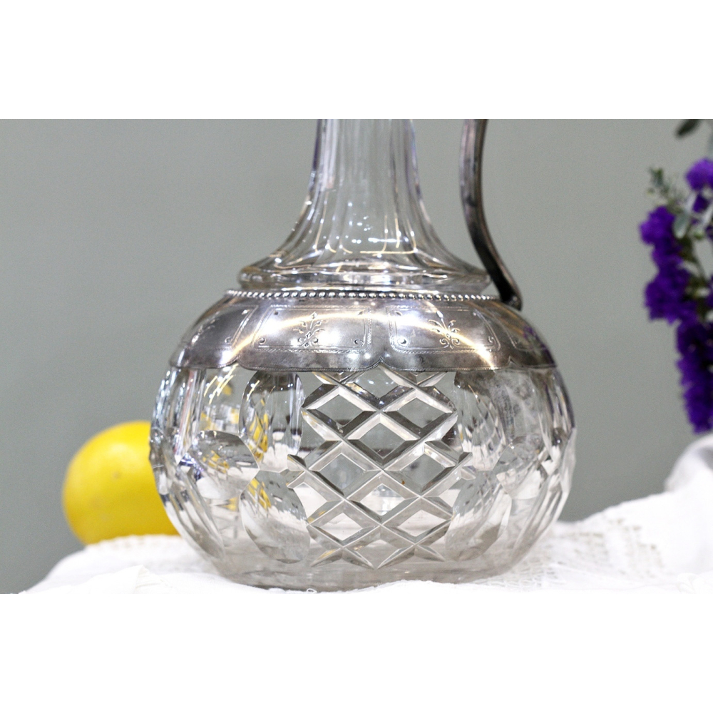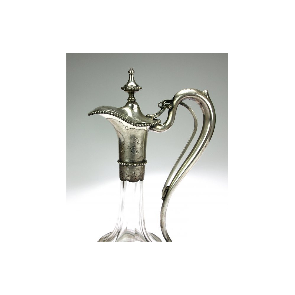 Karafa na víno vyrobená z broušeného skla a stříbrné částečně gravírované montáže o ryzosti 800/1000. Značeno ryzostním číslem "800" a číslem modelu (?) "4202". Víčko se otevírá pomocí vyklápěcího mechanismu. Uvnitř zlaceno.
