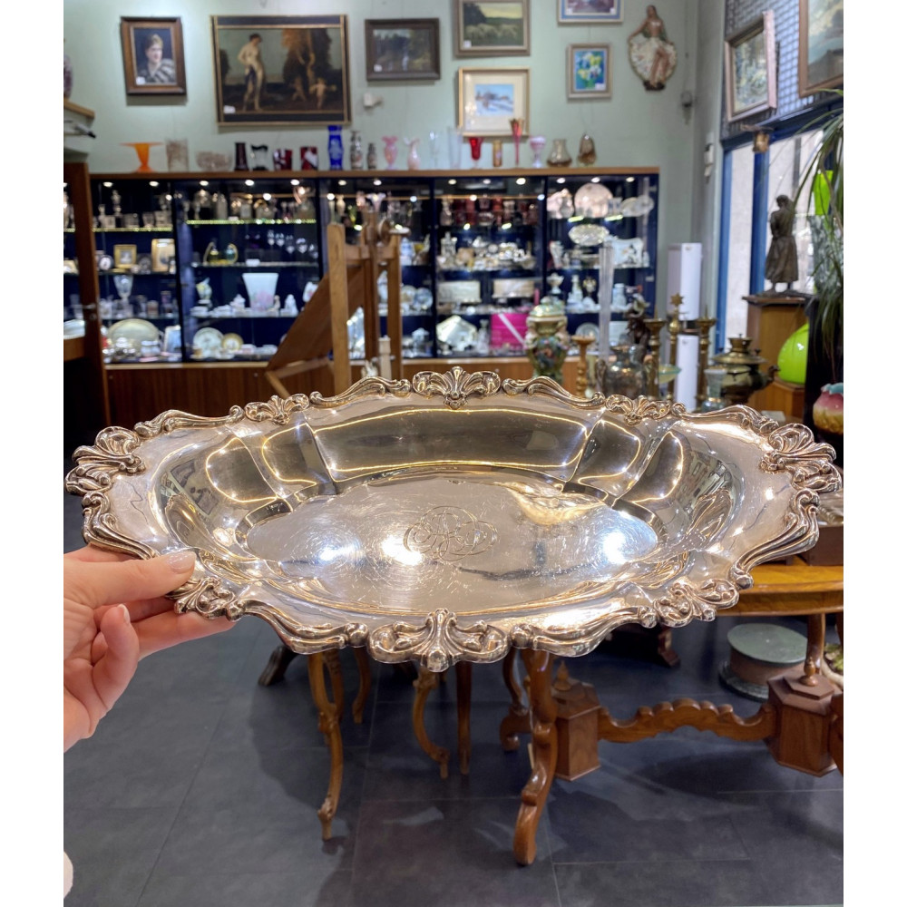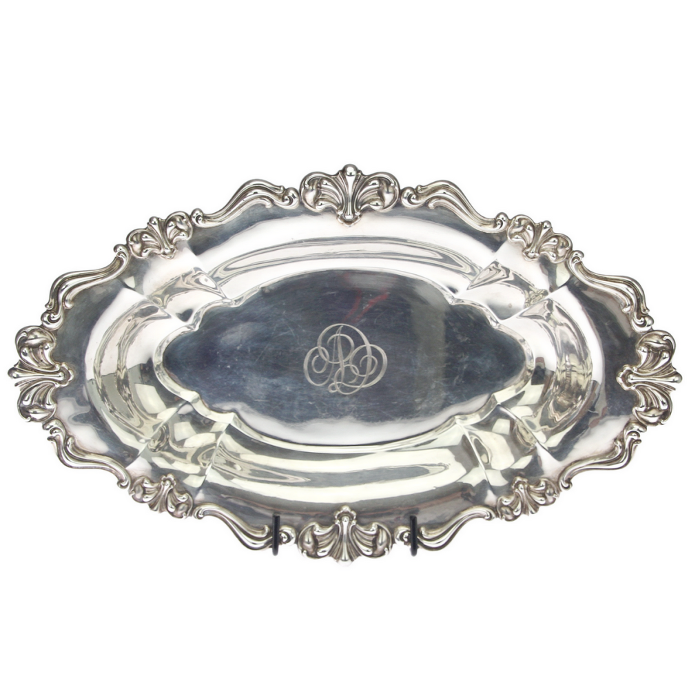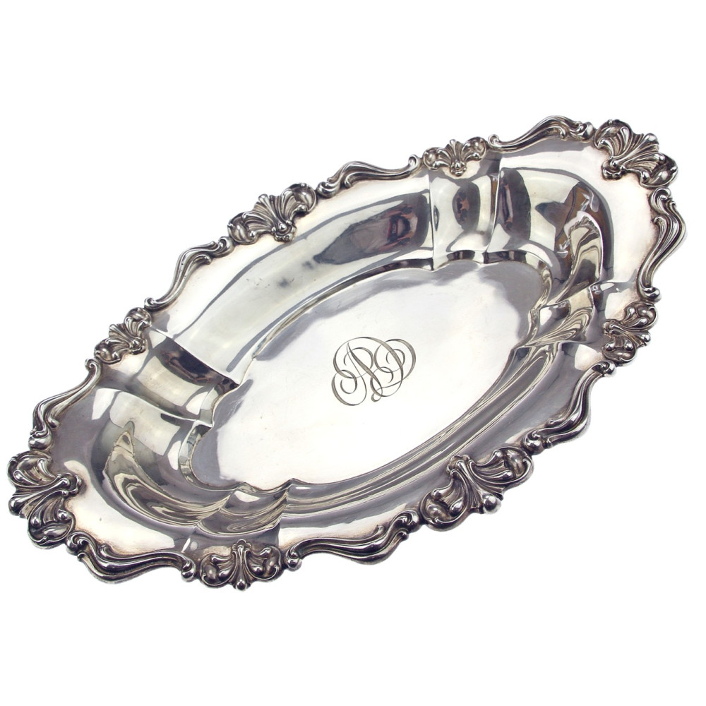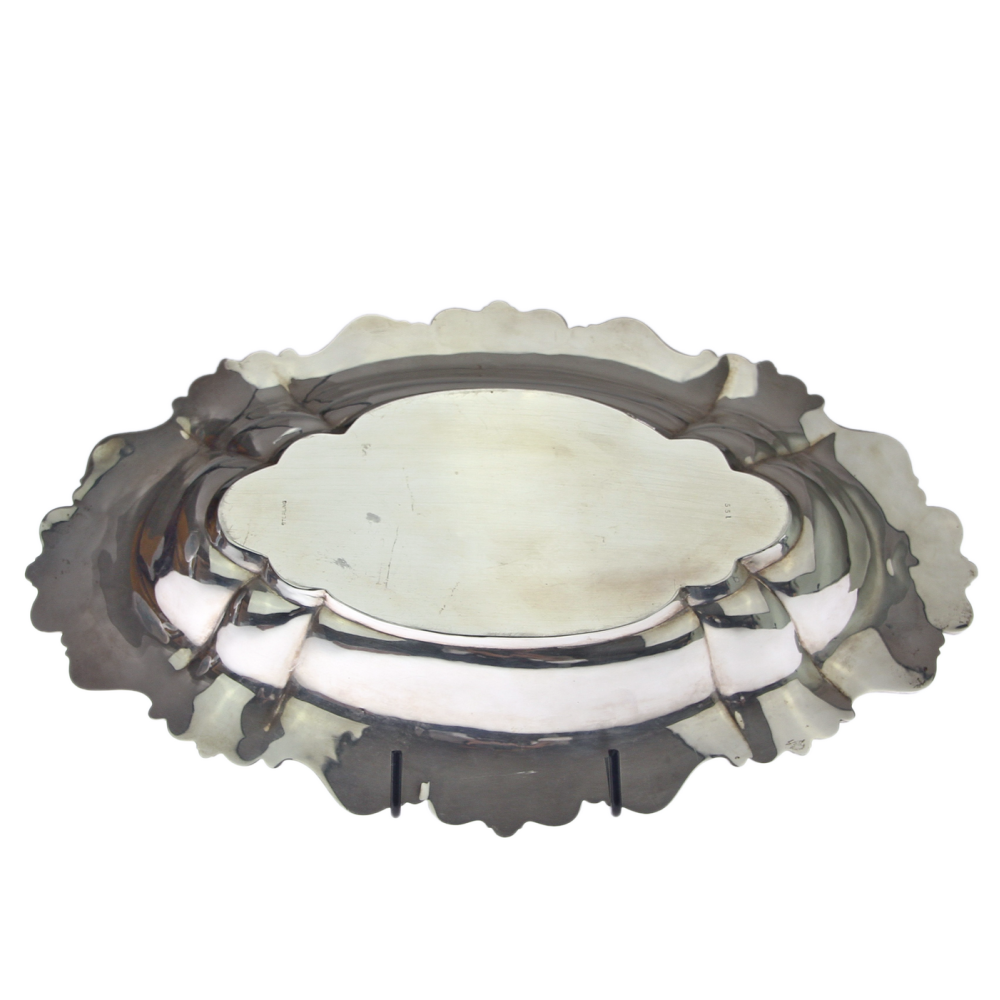 Mělká servírovací mísa oválného tvaru vyrobená ze stříbra kvality sterling (Ag 925/1000) s bohatě zdobenými okraji. Ve středu nádoby je kaligraficky ztvárněný rytý monogram "AD"(?). Zespod značeno "STERLING".