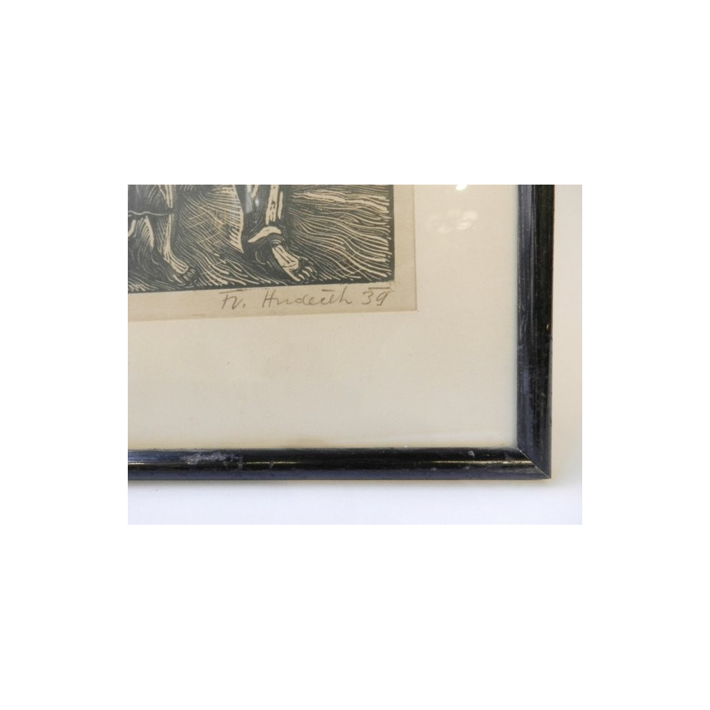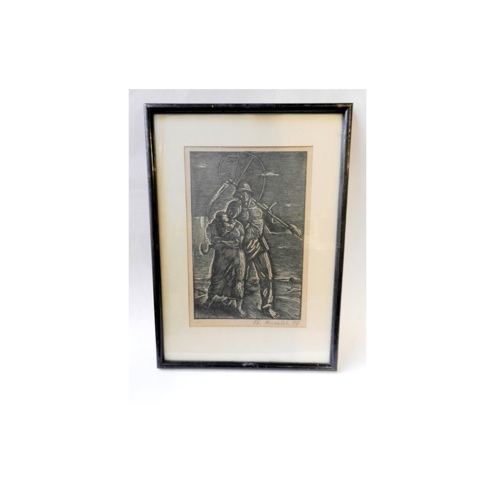 Zarámovaný grafický list Františka Hudečka z roku 1939 s vyobrazením matky, otce a jejich dítěte sklízející obilí na poli.