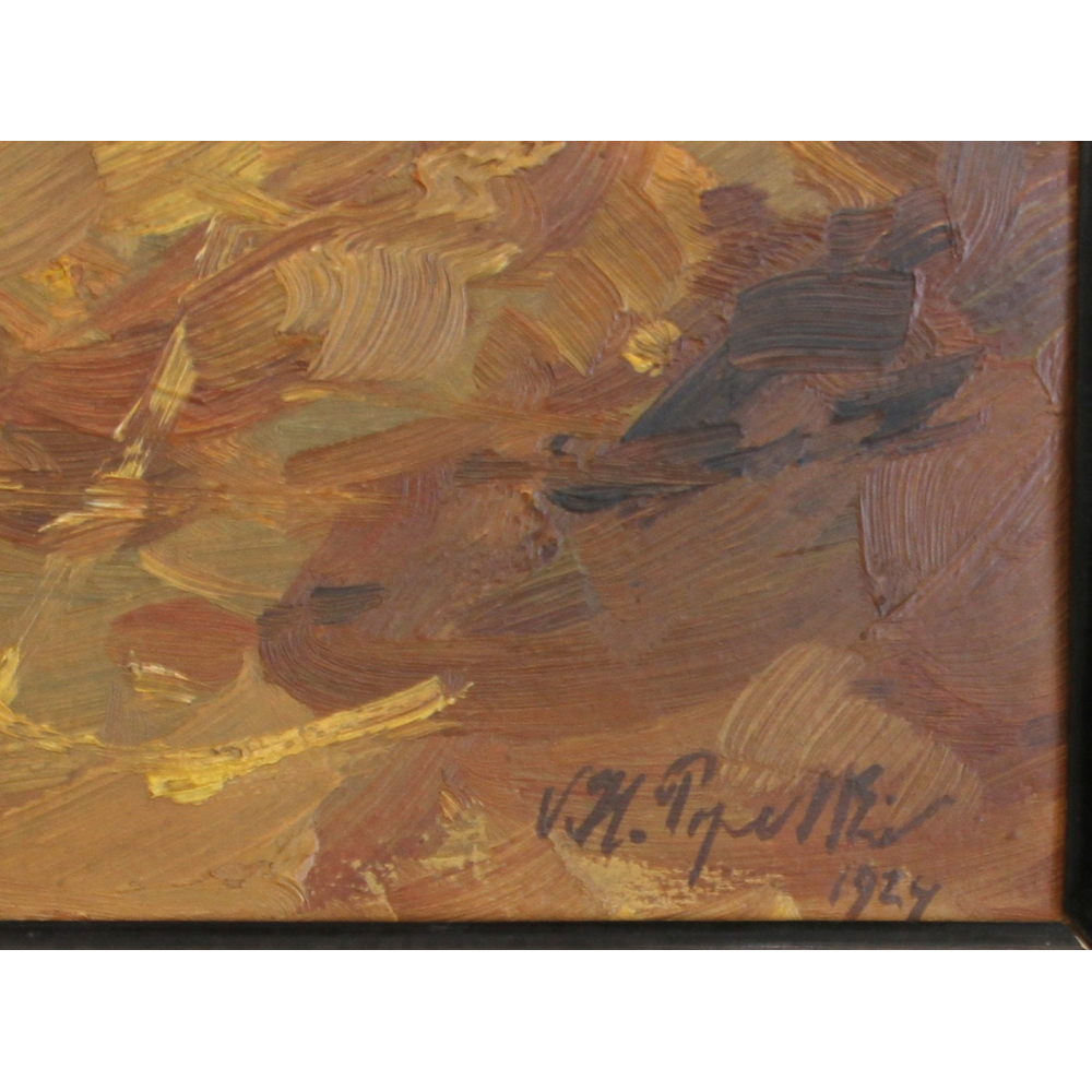 Obraz akademického malíře Vojtěcha Hynka Popelky (1888 - 1961) je malován technikou olej na kartonu. Autor studoval na pražské Uměleckoprůmyslové škole u profesora E. Dítěte ml. a Heinricha Jaksche. Dále studoval na malířské akademii u profesora Hanuše Schveigra. Studijní cesty poté konal po Čechách a na Moravě. Kromě krajinářství se specializoval na malbu zvířat (např. ilustrace k Brehmovu Životu zvířat).