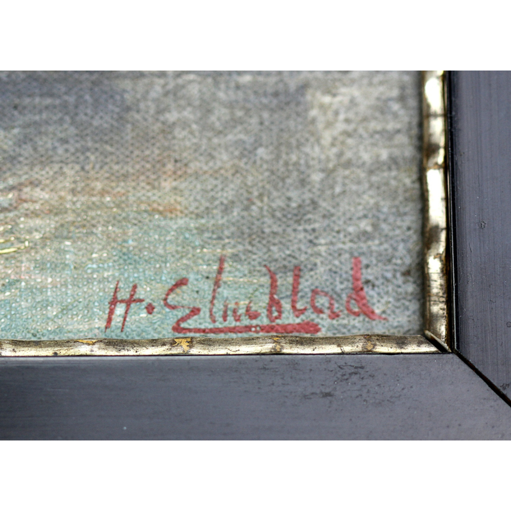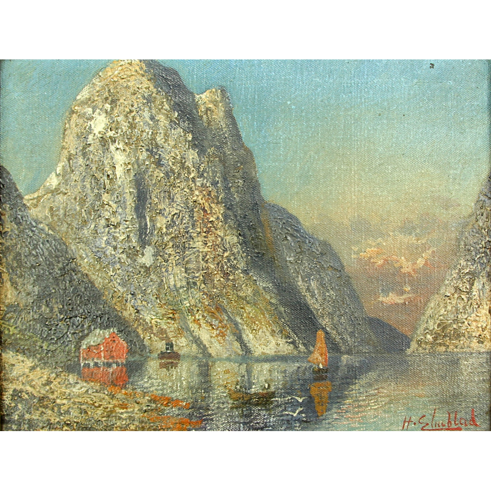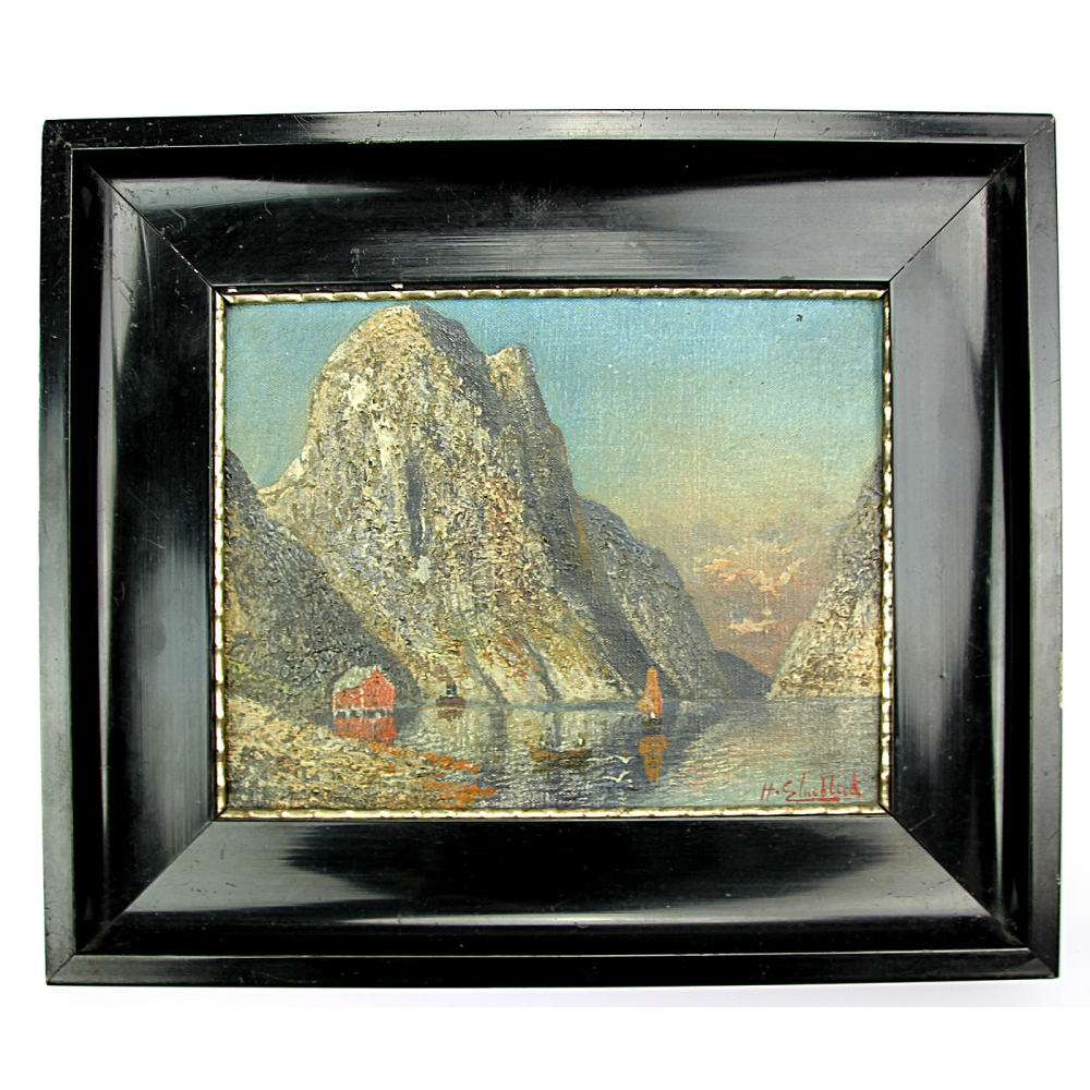 Olej na plátně, alpská vesnice se stafáží.Stav velmi dobrý, v původním rámu.