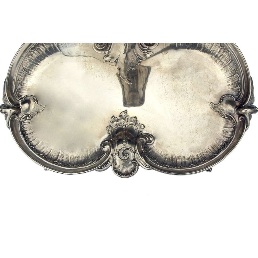 Omáčník s tácem na třech nožkách v neorokokovém stylu. Krásná uměleckořemeslná práce z konce 19. století. Materiálem je postříbřená alpaka (obecný kov). Značeno "K & Co. N".