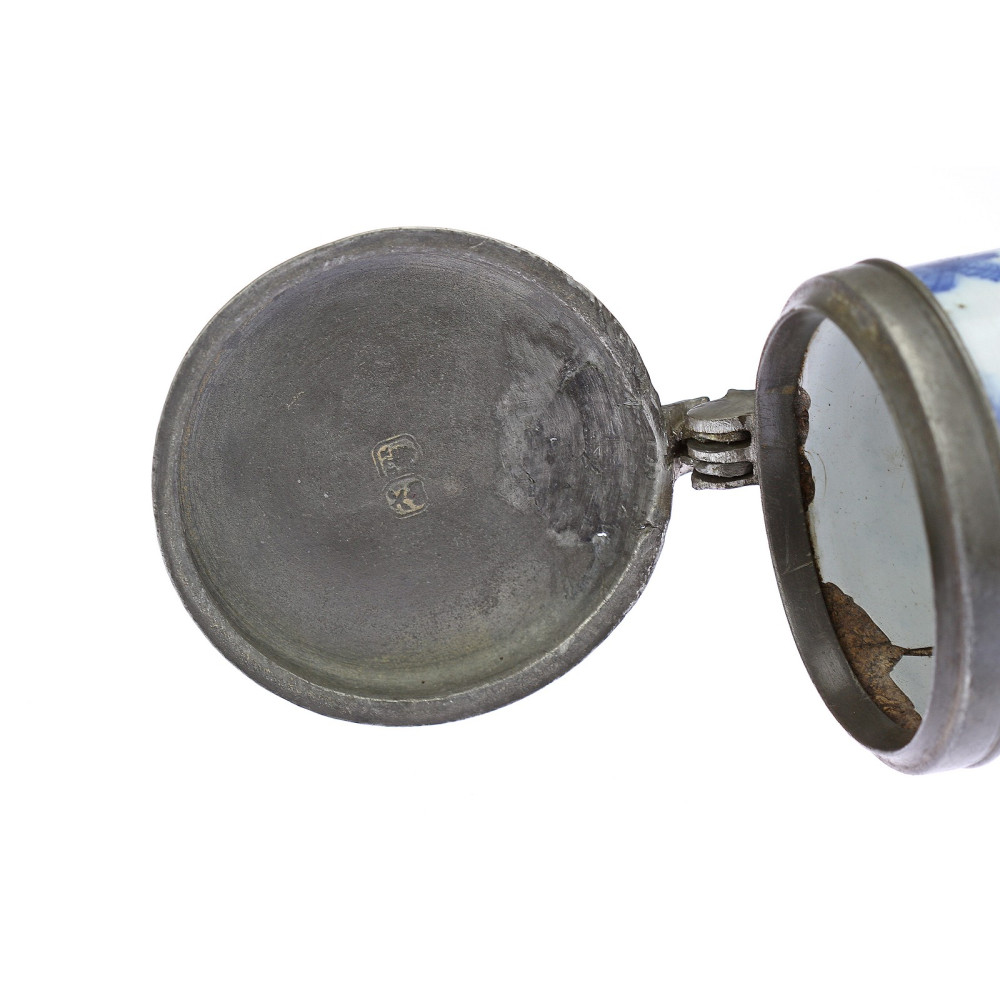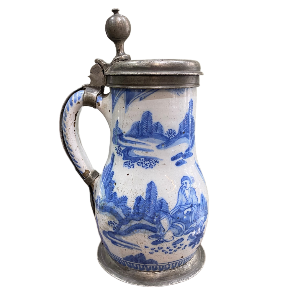 Korbel hruškovitého tvaru je vyrobený z modrobílé fajánse s motivy chinoiserie. Víčko a hrany předmětu jsou tvořeny z cínu, který je značen rytou datací "1748" a monogramem "CS". Podobné korbely pocházejí z delftské či frankfurtské produkce.