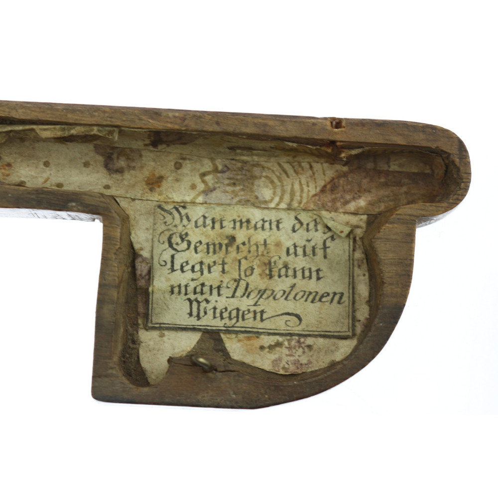 Malé ruční železné váhy s mosaznými talířky, pravděpodobně vyrobené ve druhé polovině 18. století. Uvnitř původní dřevěné etuje se nacházejí dva ručně psané štítky s popisem v němčině. Johann Los zde informuje uživatele, že se jedná o malou váhu bez závaží, určenou k vážení jednoho dukátu podle lotové stupnice, a to až do hmotnosti 64 lotů. Druhý text pak uvádí, že když se závaží přidá, je možné vážit "Dopolonen".