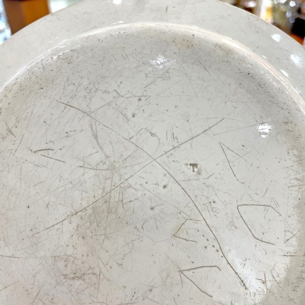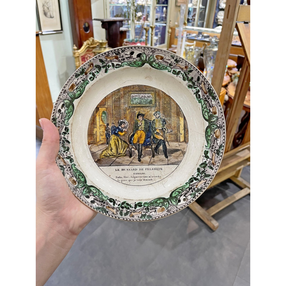 Dekorační talíř vyrobený z jemné kameniny, znázorňující scénu z pařížské divadelní hry - varieté s třemi herci " Le hussard De felsheim ", která měla premiéru 12. března 1827.