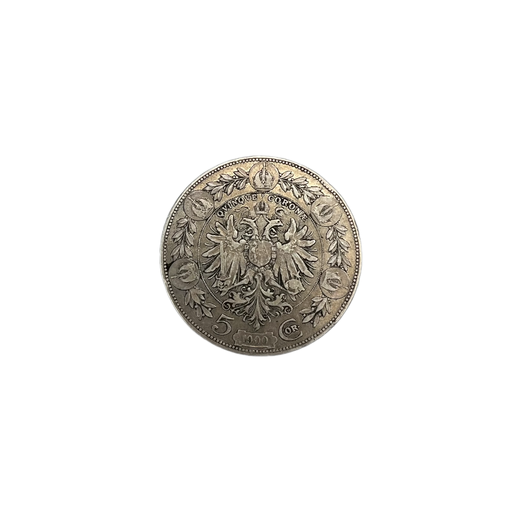 Masivní stříbrná 5 koruna z období Rakousko-Uherska ražená ve vídeňské mincovně roku 1900. Na líci je vyobrazen císař František Josef I. (autorem designu je Josef Reisner) a na rubu rakousko-uherská orlice (autorem designu je Carl Gerl).