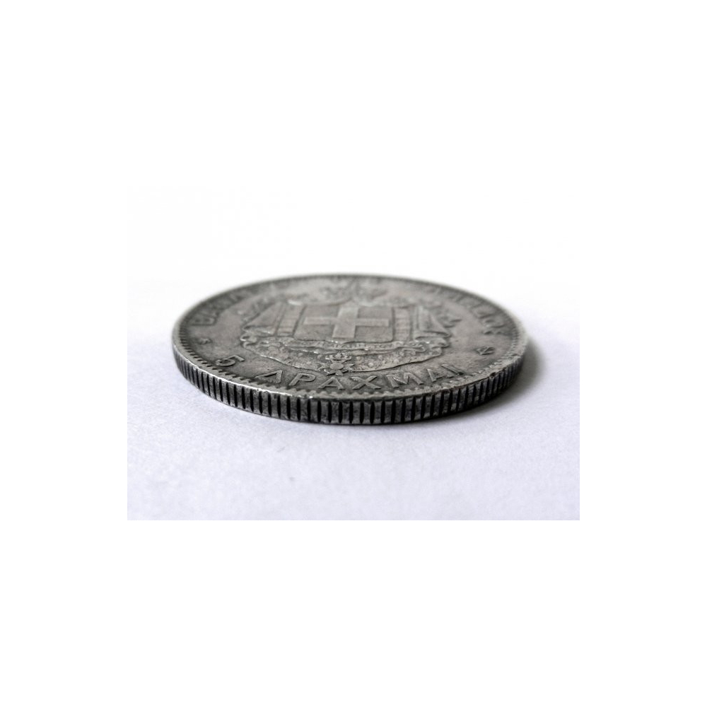 Stříbrná mince 5 Drachem s vyobrazením řeckého krále George na averzu nápis: "ΓΕΩΡΓΙΟΣ Α! ΒΑΣΙΛΕΥΣ ΤΩΝ ΕΛΛΗΝΩΝ - ΒΑΡΡΕ - 1876 A", na reverzu: "ΒΑΣΙΛΕΙΟΝ ΤΗΣ ΕΛΛΑΔΟΣ - 5 ΔΡΑΧΜΑΙ - ΙΣΧΥΣ ΜΟΥ Η ΑΓΑΠΗ ΤΟΥ ΛΑΟΥ". Návrh mince vytvořil Albert Désiré Barre.